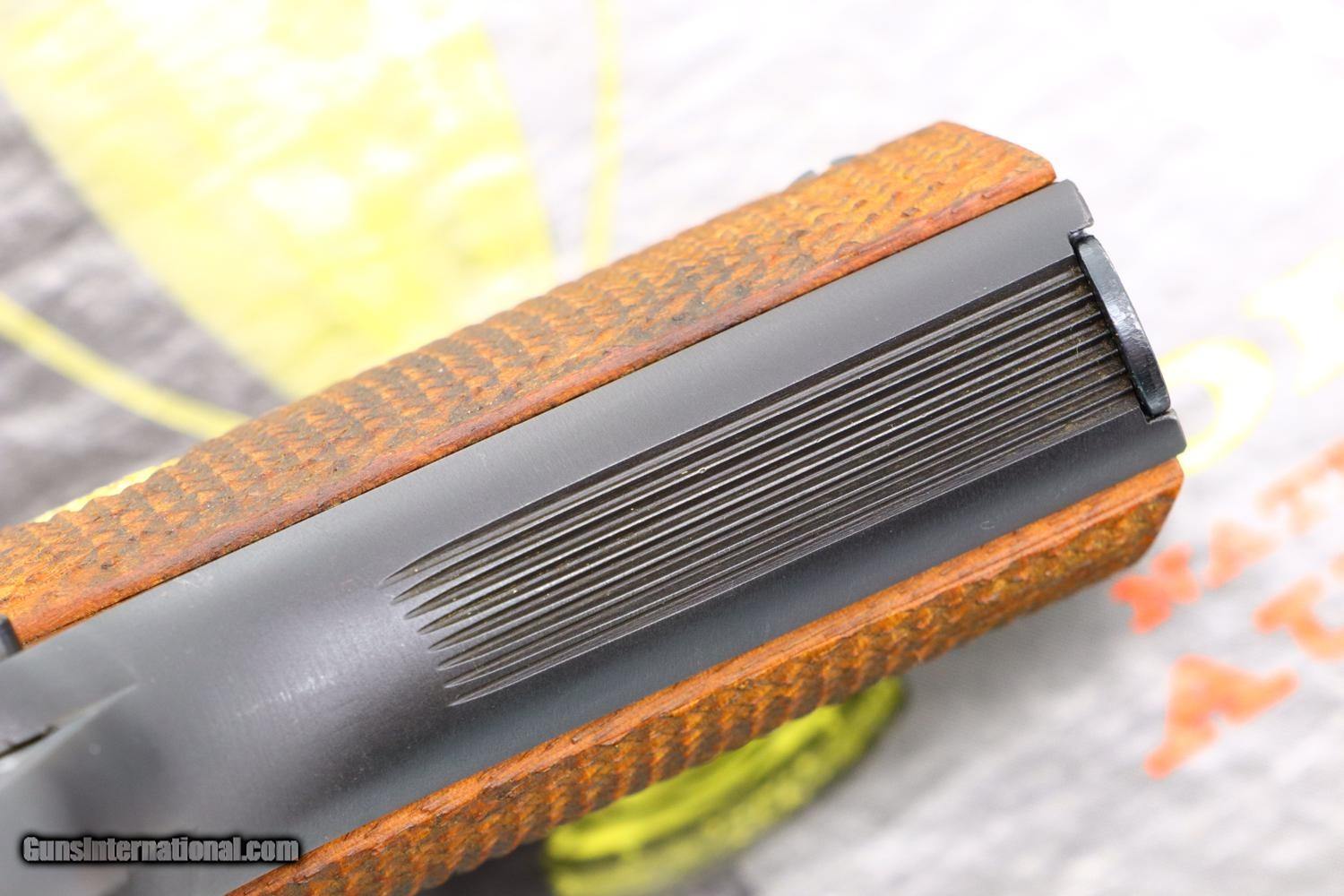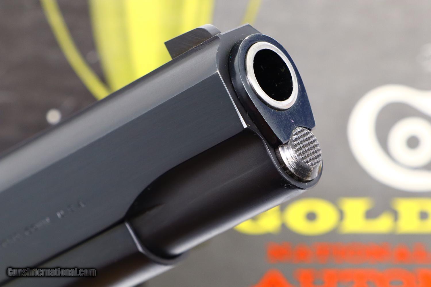 Description: Synopsis: Beautiful, Early Colt Gold Cup National Match, Boxed, 14177-NM, FB01082 Description: High condition Colt Gold Cup National Match. .45 ACP, made in 1964 with beveled recoil spring plug, in correct factory shipping box. Standard configuration pistol with patridge front sight and fully adjustable rear target sight. Left side of slide referencing National Match and the caliber. Colt address in Hartford on right side of the slide.Barrel marked “COLT .45 AUTO N.M.” over chamber. Serial number on right side of frame. Fitted with checkered walnut grips with gold Colt medalions. Correct factory magazine referencing Colt and Caliber on floorplate. Correct factory box. No literature. Condition: 99+% bright original blue with truly minimal handling marks. Crisp grips with oil staining as pictured, the grip screws having been polished. EXC+ magazine. Mirror bore. Perfect manual mechanics. Near EXC shipping box with added label on left side referencing model and serial number. A wonderful, early Gold Cup equally at home on the range or in your collection! ~~Insured shipping fee of $65; most packages shipped using FedEx 2nd Day.~~ SOLD Manufacturer: Colt Serial Number: 14177-NM Caliber Info: .45 ACP Pistols |