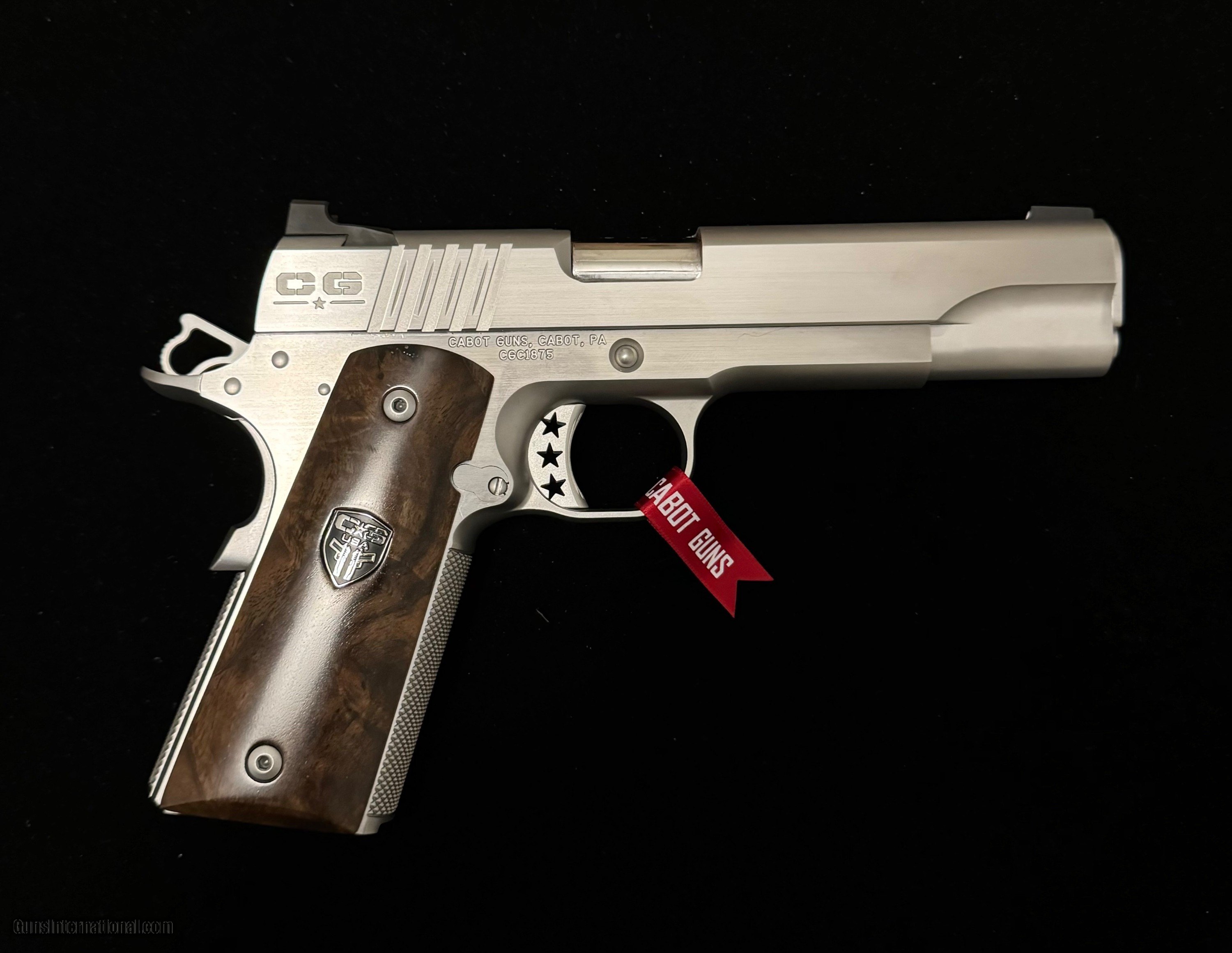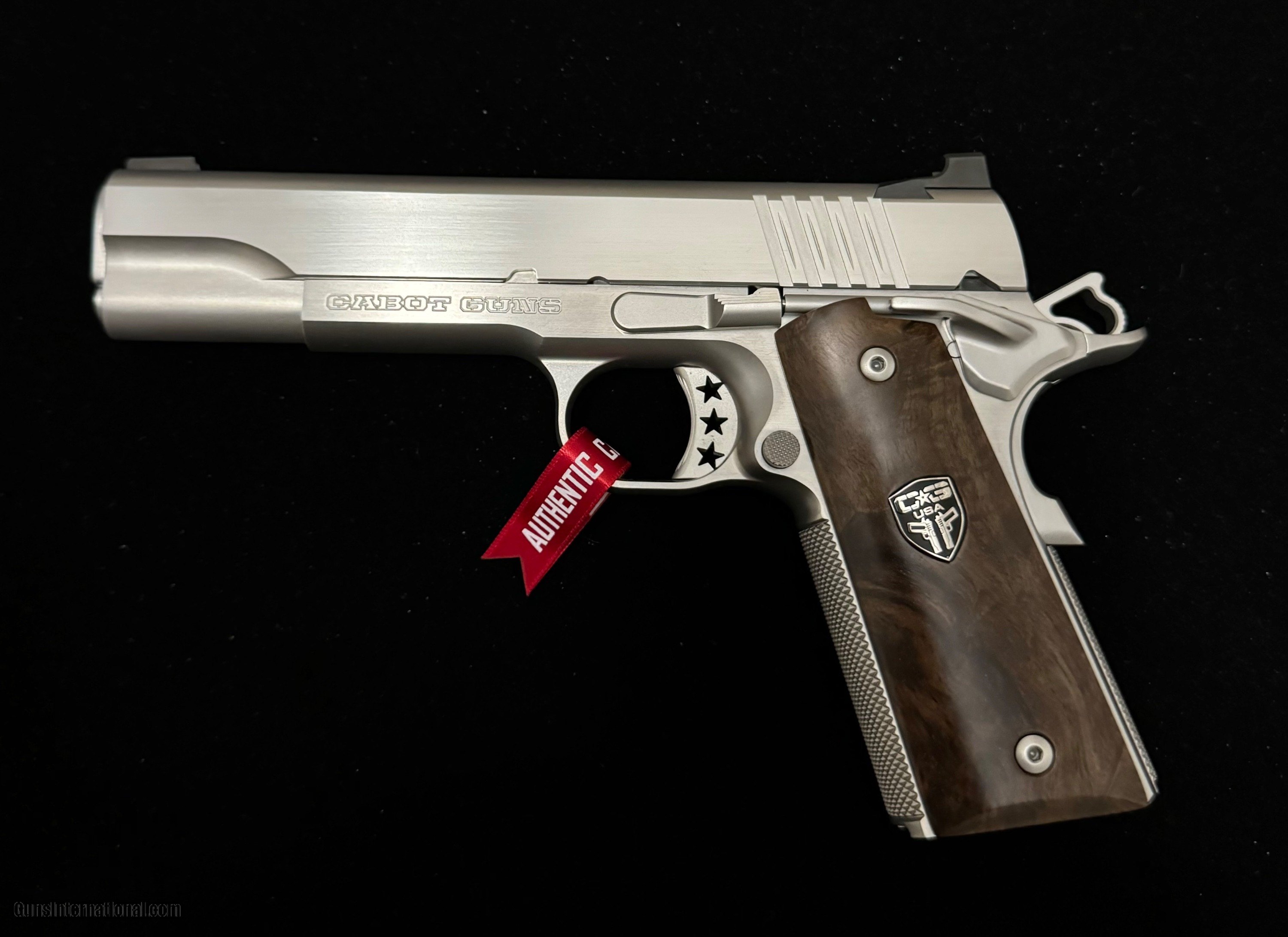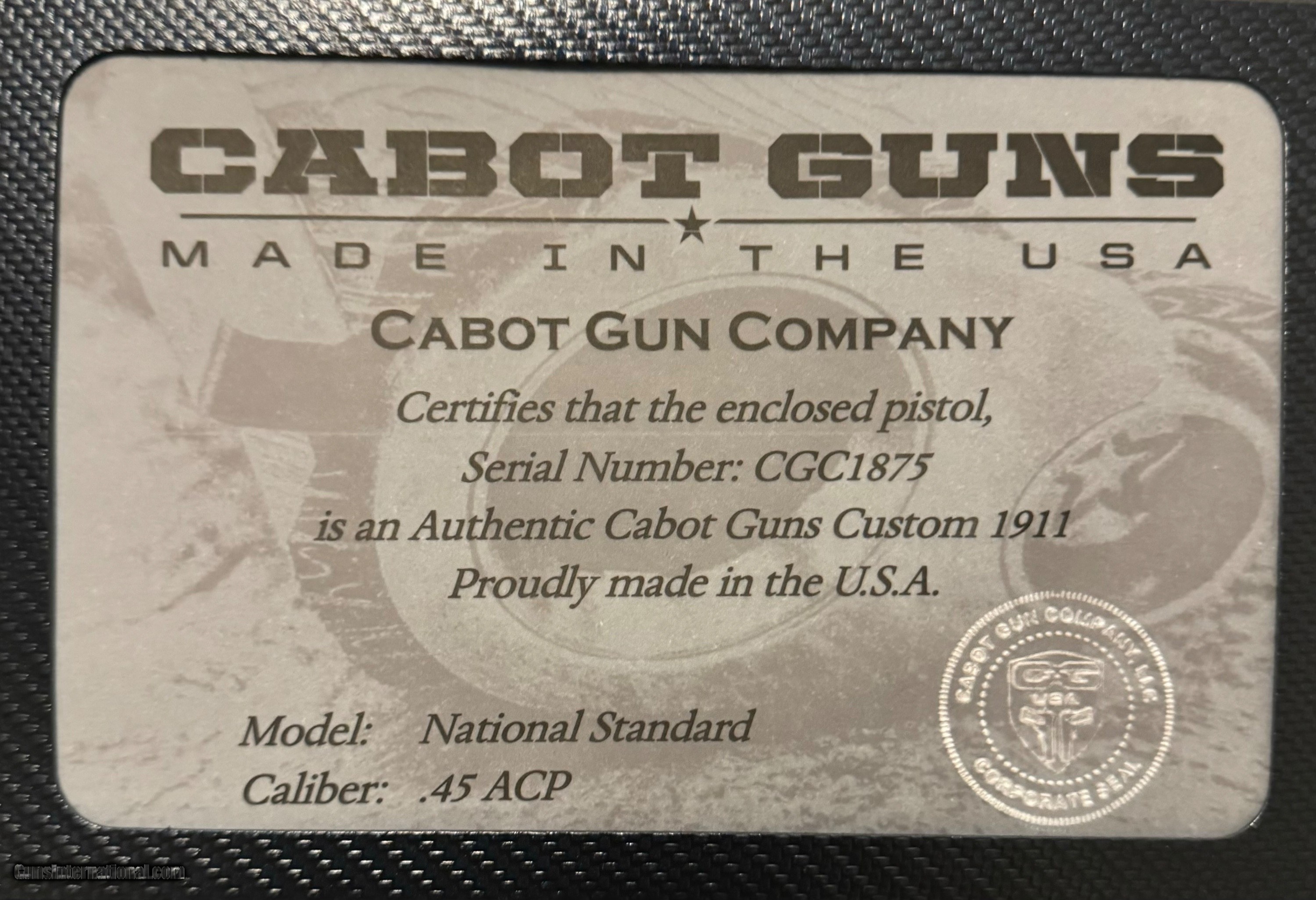 Description: For your consideration is a Cabot, National Standard Government in .45 ACP. Brand new, never fired. Payment accepted via money order, check, ACH and wire fee free. All major brands of credit card accepted for a 3% fee. Texas residents pay 8.25% sales tax. All sales final. Not on the roster in California but we will ship there. SOLD Handgun Caliber: .45 ACP (.45 Auto) Manufacturer: Cabot Model: National Standard Barrel Length: 5 Condition: BNIB |