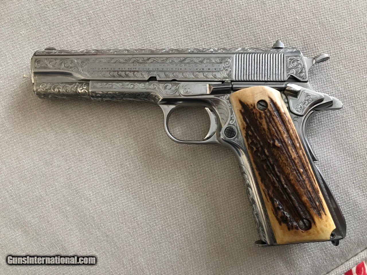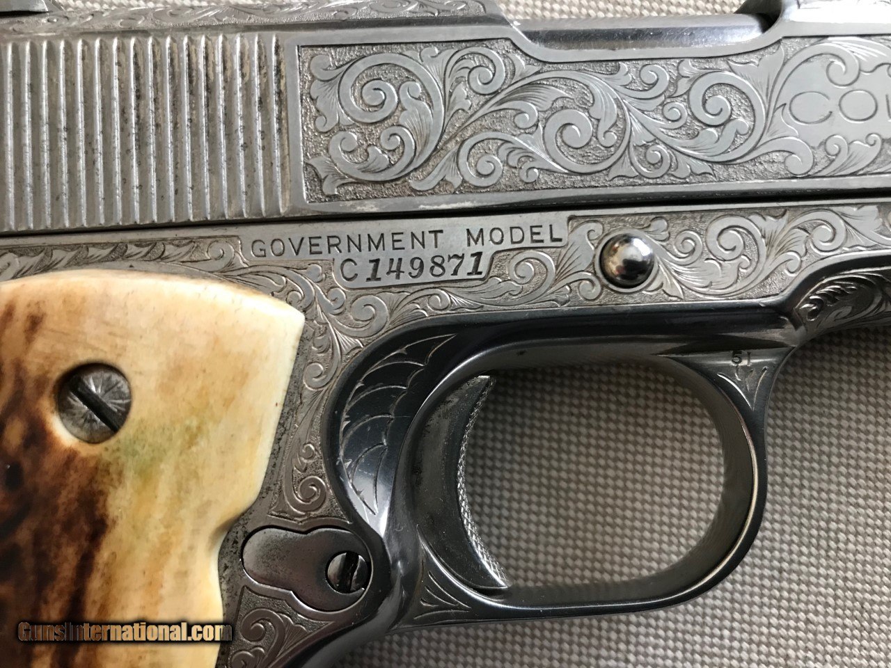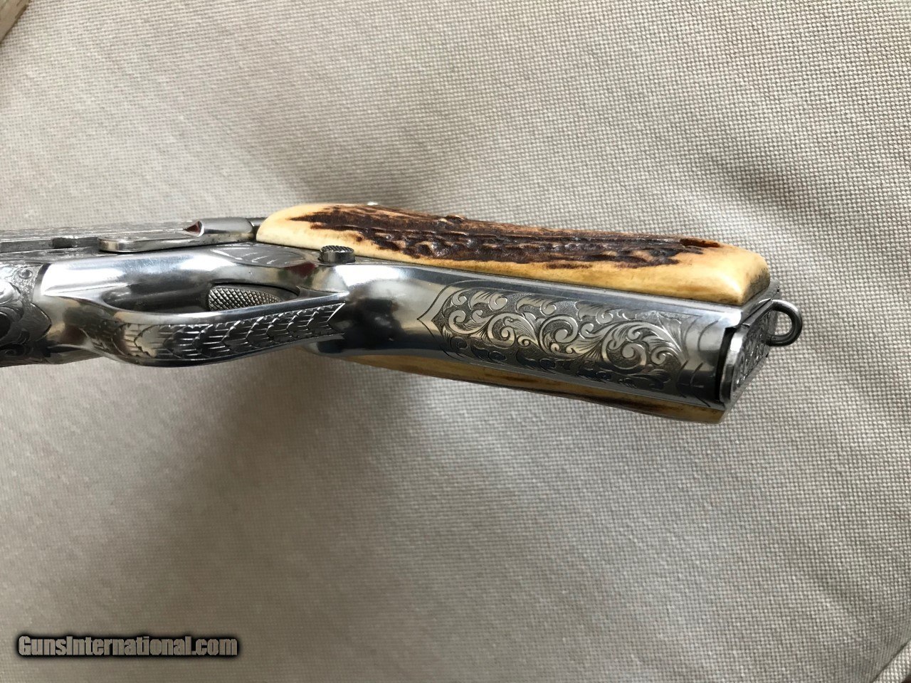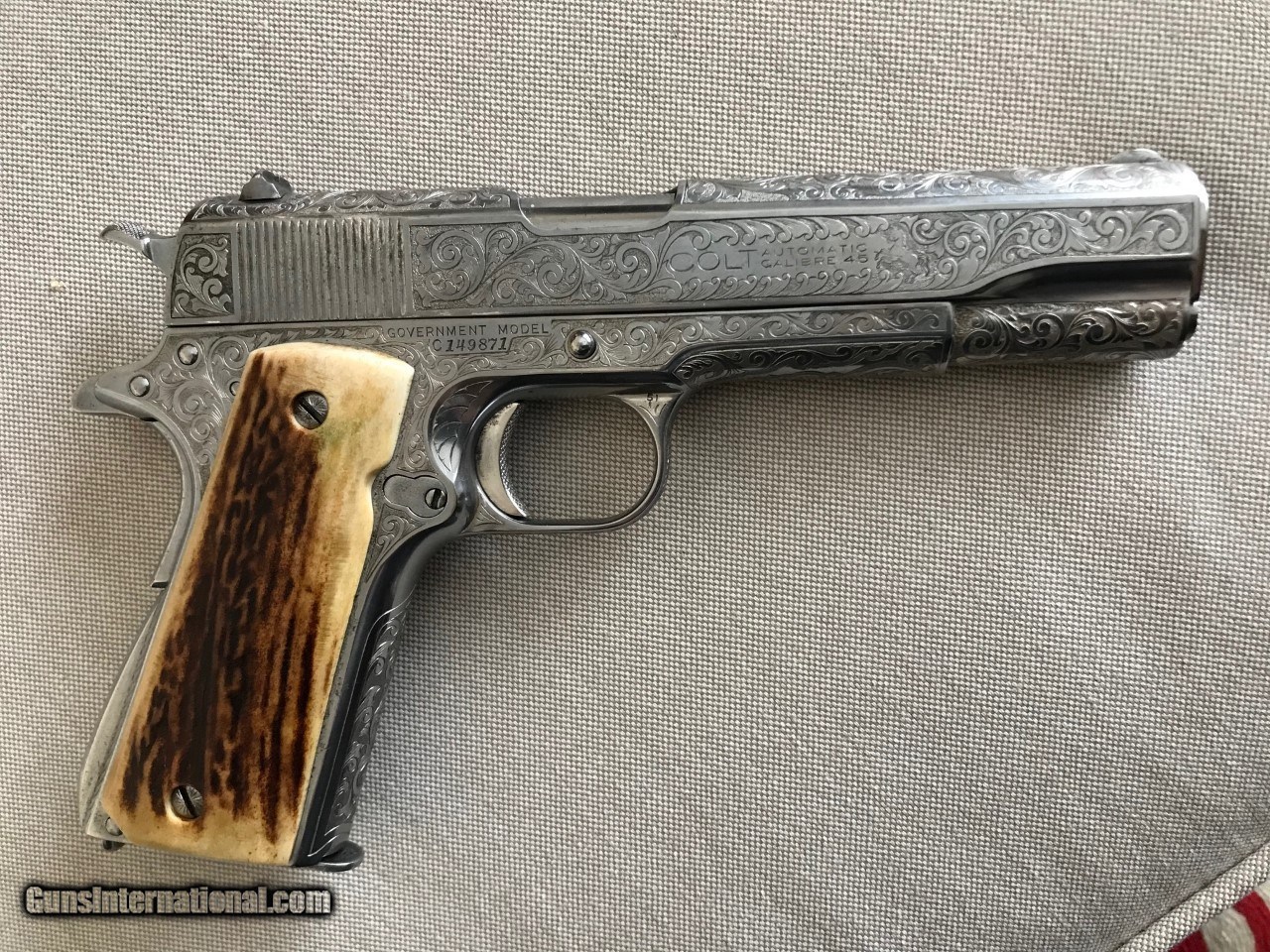Description: Colt 1911 Government Model Ser # C 149871 mfg. in 1926 45 acp Stag grips Engraved by J.R.French Master engraver in 1967. The slide is numbered to the gun.This piece is engraved and silver plated,The engravers name in tiny engraves letters and date under the grip. The silver finish has been handled and a percentage ? has been worn off. still looks great but some of the piece is in the white and cleaned and polished to match . under the slide is blackish inside do to silverr going black with age.The grips are real stag, the barrel is unmarked as it should be. The barrel and the correct magazine are in the white as well. The bore is very good and the mechanics are perfect with a very nice trigger pull making it a good shooter. All the parts are correct for its vintage, A great looking gun for being 97 years old and still a functioning as new. Comes with a colt factory letter , shipped to Shapleigh Hardware ,St. Louis Missouri april 23 1928. (Price Reduced) Need a FFL or C+R to purchase. Call with any questions Tom 612 859 5673 SOLD |