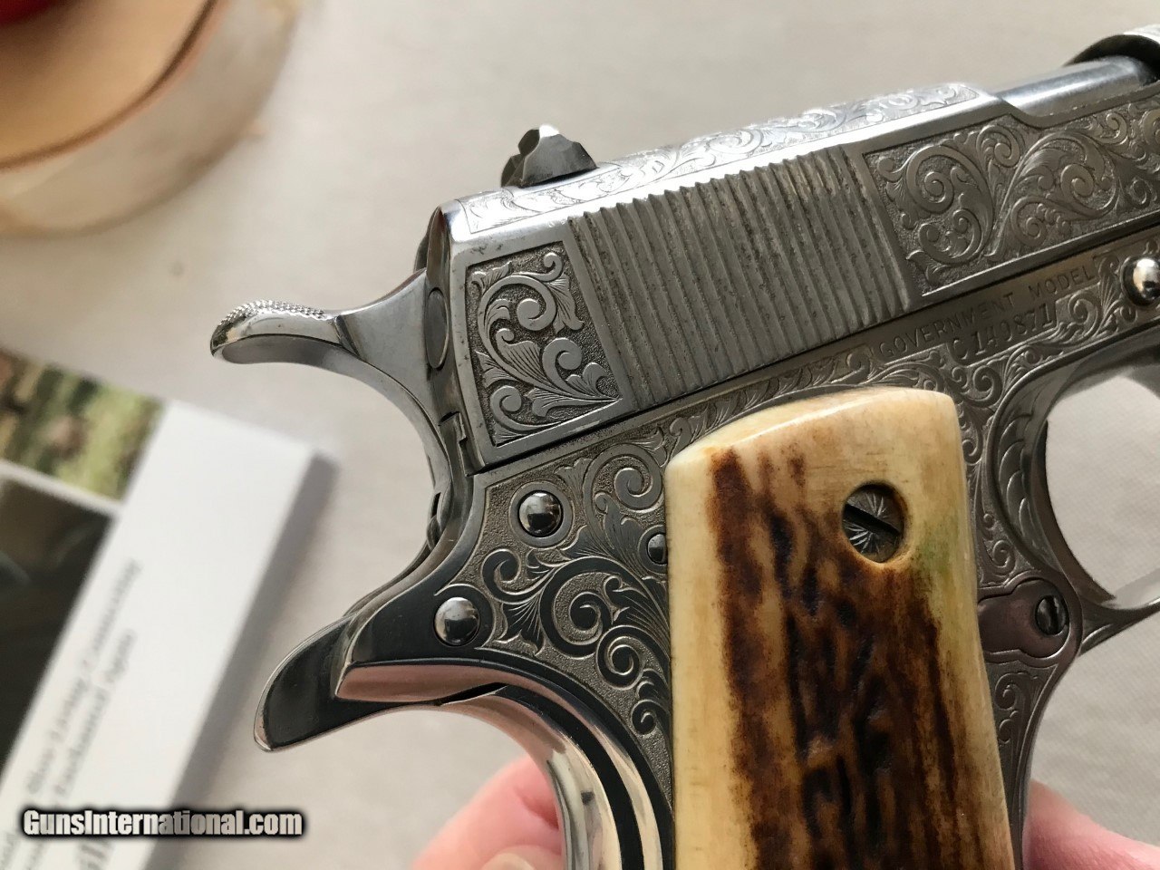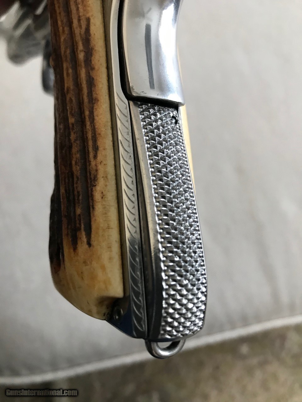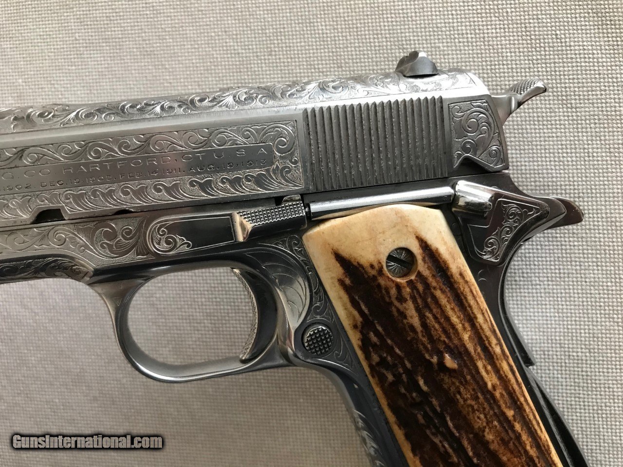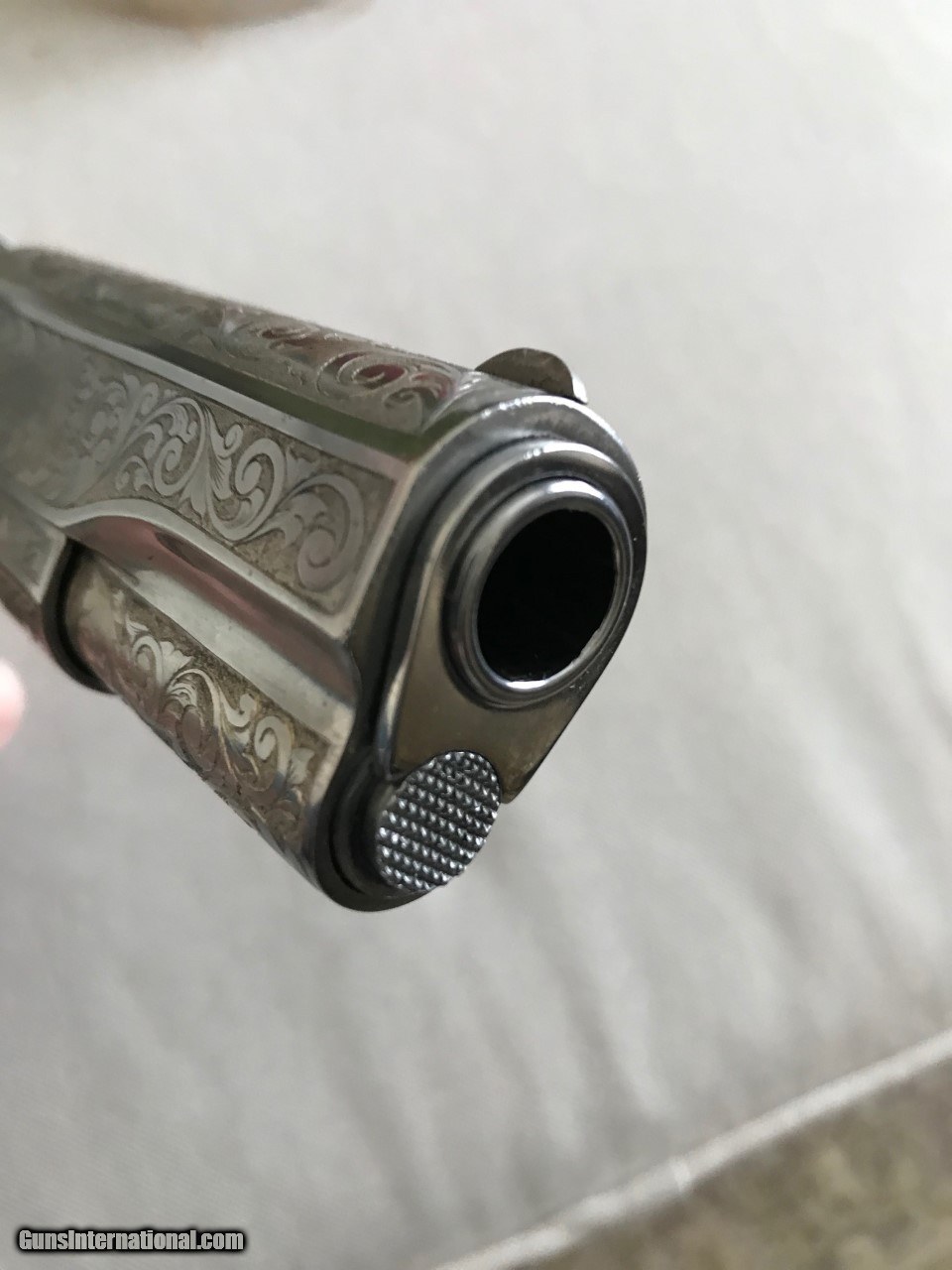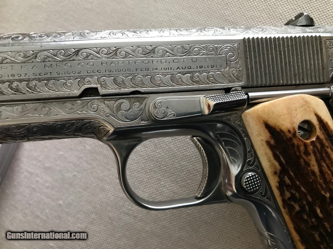 Description: Colt 1911 Government Model Ser # C 149871 mfg. in 1926 45 acp Stag grips Engraved by J.R.French Master engraver in 1967. The slide is numbered to the gun.This piece is engraved and silver plated,The engravers name in tiny engraves letters and date under the grip. The silver finish has been handled and a percentage ? has been worn off. still looks great but some of the piece is in the white and cleaned and polished to match . under the slide is blackish inside do to silverr going black with age.The grips are real stag, the barrel is unmarked as it should be. The barrel and the correct magazine are in the white as well. The bore is very good and the mechanics are perfect with a very nice trigger pull making it a good shooter. All the parts are correct for its vintage, A great looking gun for being 97 years old and still a functioning as new. Comes with a colt factory letter , shipped to Shapleigh Hardware ,St. Louis Missouri april 23 1928. (Price Reduced) Need a FFL or C+R to purchase. Call with any questions Tom 612 859 5673 SOLD |