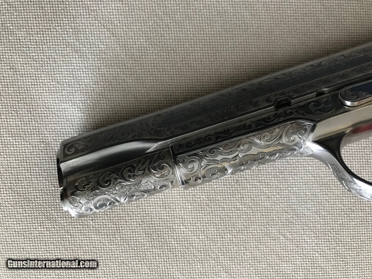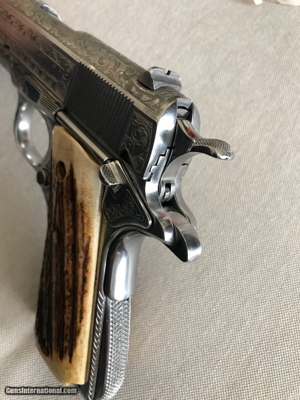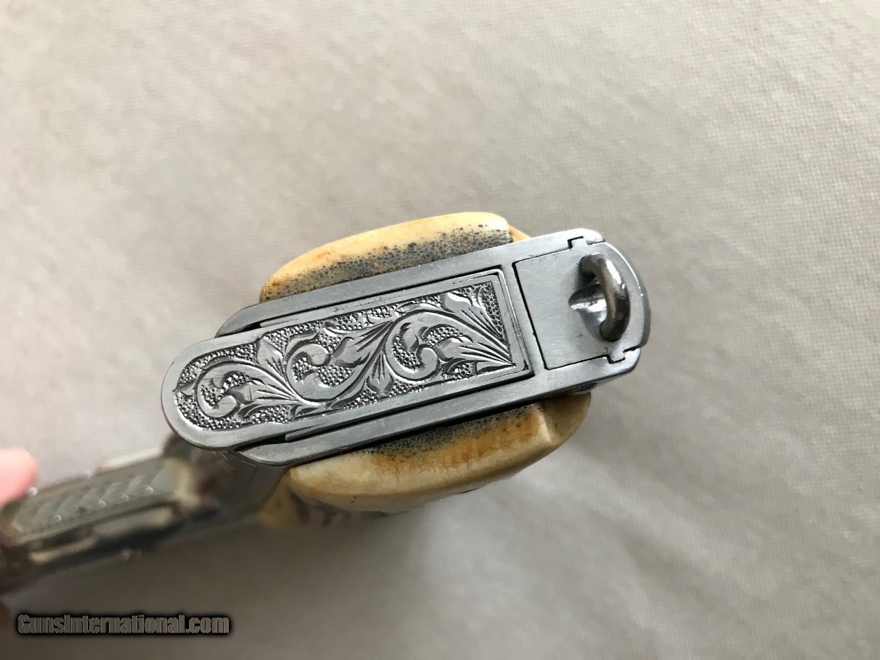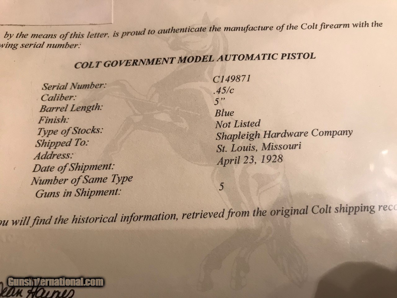 Description: Colt 1911 Government Model Ser # C 149871 mfg. in 1926 45 acp Stag grips Engraved by J.R.French Master engraver in 1967. The slide is numbered to the gun.This piece is engraved and silver plated,The engravers name in tiny engraves letters and date under the grip. The silver finish has been handled and a percentage ? has been worn off. still looks great but some of the piece is in the white and cleaned and polished to match . under the slide is blackish inside do to silverr going black with age.The grips are real stag, the barrel is unmarked as it should be. The barrel and the correct magazine are in the white as well. The bore is very good and the mechanics are perfect with a very nice trigger pull making it a good shooter. All the parts are correct for its vintage, A great looking gun for being 97 years old and still a functioning as new. Comes with a colt factory letter , shipped to Shapleigh Hardware ,St. Louis Missouri april 23 1928. (Price Reduced) Need a FFL or C+R to purchase. Call with any questions Tom 612 859 5673 SOLD |