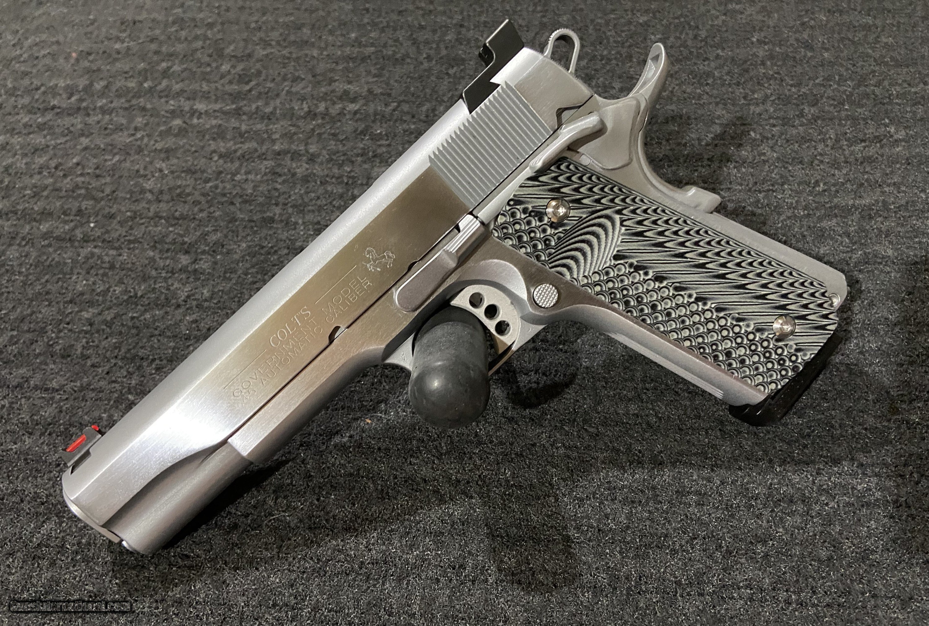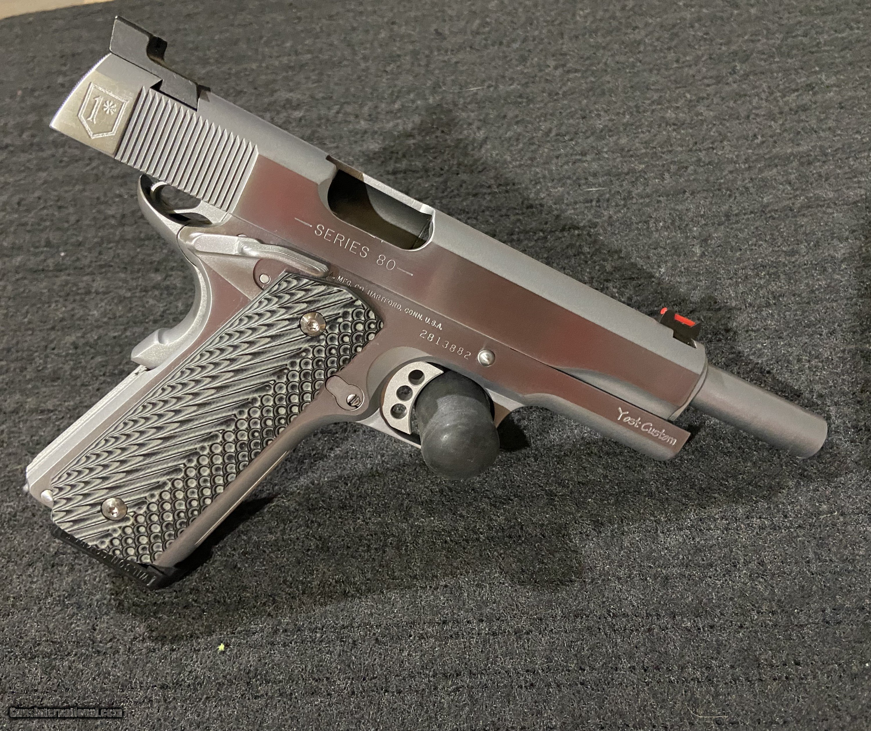 Description: • Best quality trigger job • Fitted beavertail grip safety • Trijicon Fiber Front and Target Rear Sights • Tool steel slide stop • Extended thumb safety • Lower & flare ejection port • Serrate front strap in point pattern 20lpi • Complete 1911 dependability package including; Wilson Bulletproof extractor, tune ejector, polished feed ramp, throated barrel, polished breech face, polished cartridge pick-up rail, chamfer firing pin hole, polished chamber, ream chamber if necessary • Flatten & serrate slide top 50 lpi • Steel serrated mainspring housing • Hand-filed beveled magazine well • Extended ejector • Match grade barrel bushing in stainless • Re-crowned barrel • Complete de-horning • stainless finish • Polished slide flats • G10 Grips • 5 8-round Wilson Combat magazines, tested and tuned with each gun for maximum reliability • Gun rug plus voodoo tactical soft case SOLD Handgun Caliber: .45 ACP (.45 Auto) Manufacturer: Colt Model: Government Serial Number: 2813882 Barrel Length: 5 Bore: 45ACP Condition: Excellent Metal Condition: Like New Bore Condition: Like New Action: Single Action Case: VooDoo Tactical and Ted Yost *1 Item Location: Knoxville, TN |