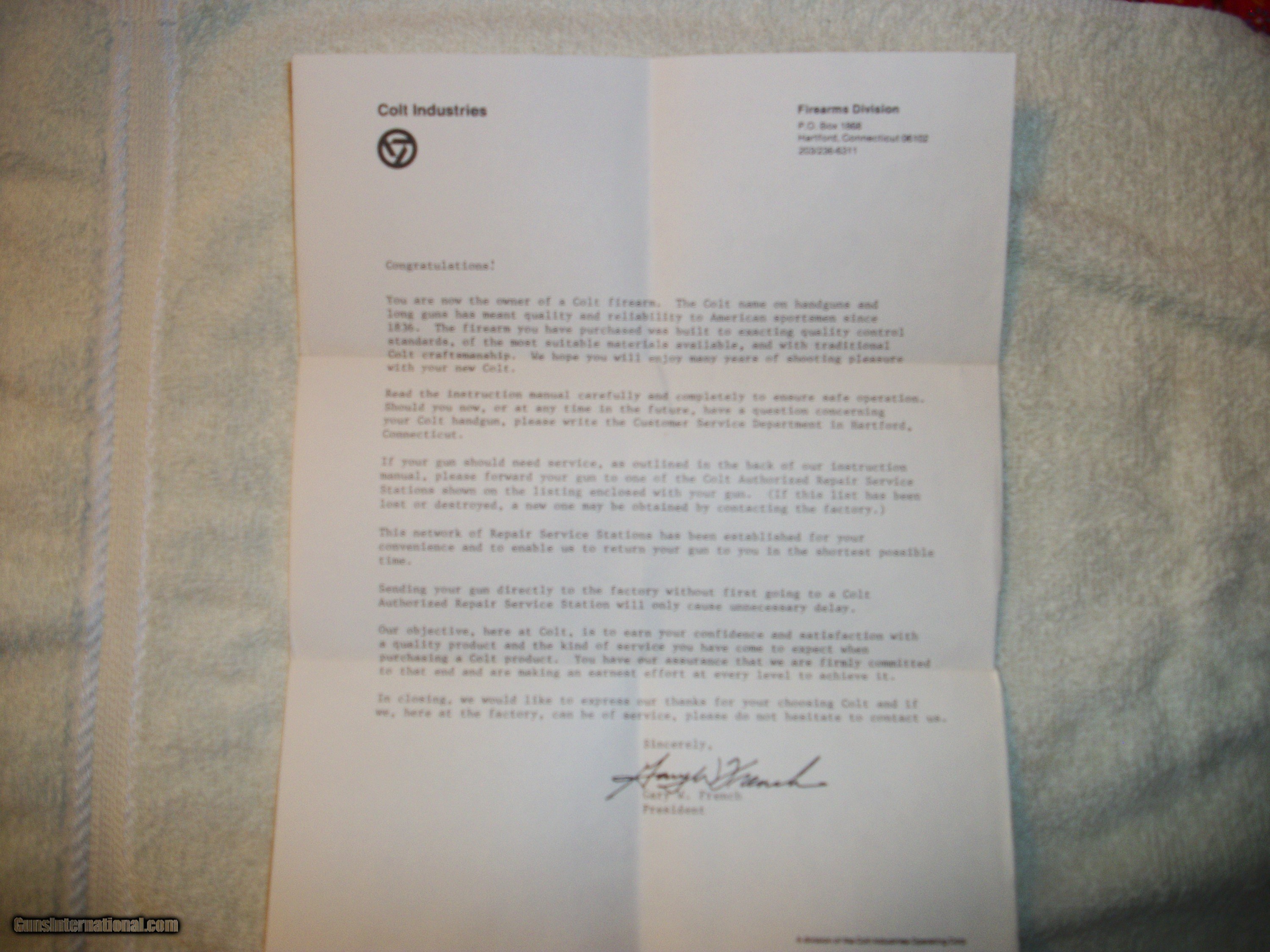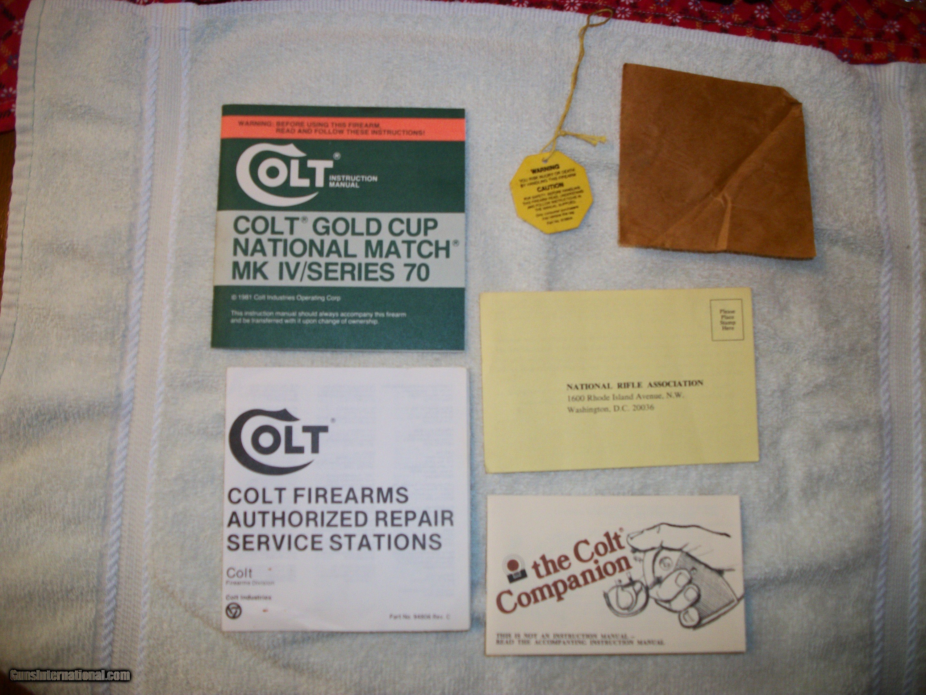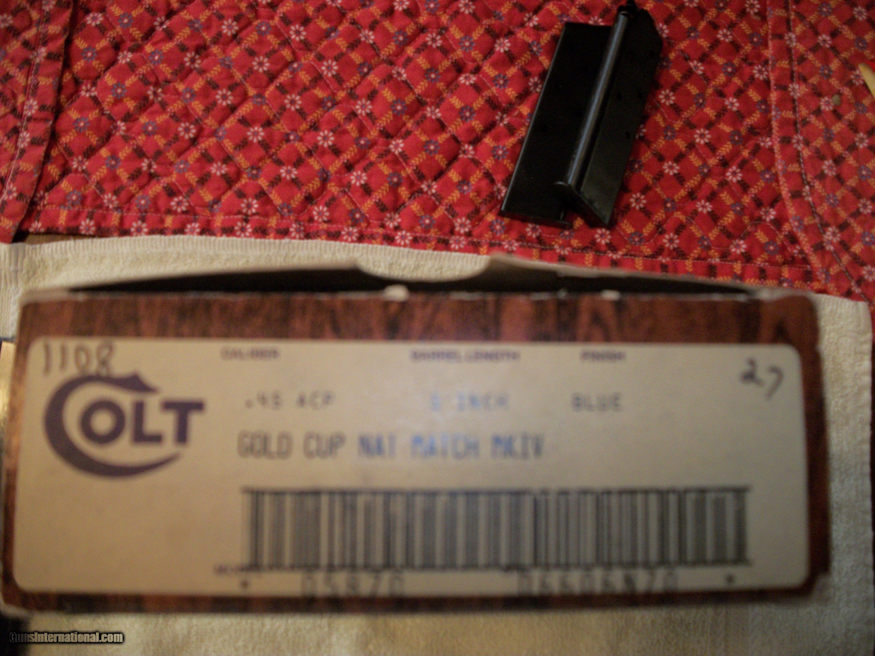 Description: New in Box Colt 1911A1 MK IV Series 70 Gold cup National Matc still in original box with all paperwork.With magazines.,2 Originals and 2 colt replacements.I only ship to the lower 48 to an FFL of your choice for $45.00.I accept MONEY ORDERS ONLY. Pistol was manufactured in 1981. SOLD Handgun Caliber: .45 ACP (.45 Auto) Manufacturer: Colt Model: 1911A1 Gold Cup National Match Serial Number: 06606N70 Barrel Length: 5in Condition: New in Box Metal Condition: New Wood Condition: Excellent Bore Condition: New |