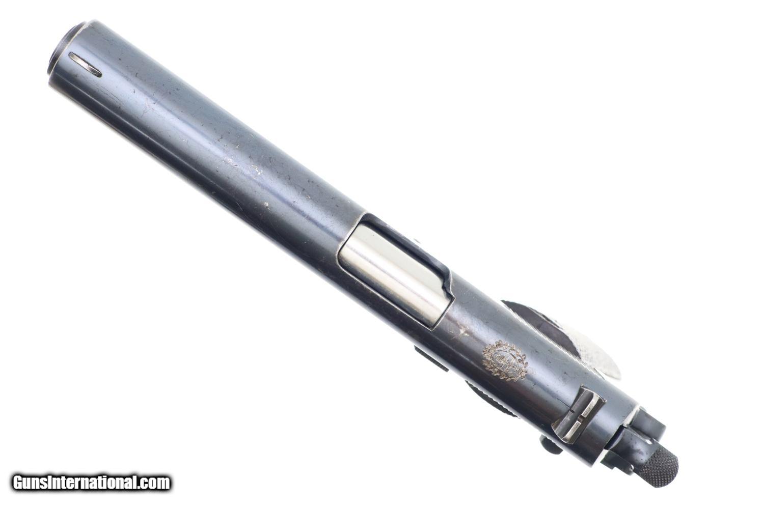 Description: Synopsis: Colt 1911A1, Prewar Commercial, Argentine Navy, C199511, FB01349 Description: Relatively scarce Colt 1911A1 Prewar Commercial Government Model pistol with matching slide and Swartz safety, Cal .45 ACP, 1 of 500 pistols issued to the Argentine Navy in 1941. The pistol is a standard Prewar Commercial Government model with fixed front sight and drift adjustable rear sight. The left side of slide marked with two line address referencing Colts location and series of patents. The right side of the slide COLT AUTOMATIC CALIBRE 45 suffixed by rampant Colt with the right side of the frame market GOVERNMENT MODEL overlying the serial number. As true for the Argentine Navy contract pistols upon receipt the top of the slide was marked with the Argentine crest while the right side of the slide was panto-graphed: REPULICA ARGENTINA/ARMADA NACIONAL-1941. Fitted with usual coarsely checkered walnut grips. Fixed lanyard ring at the bottom of mainspring housing. Blued magazine with pinned floorplate marked COLT 45 AUTO. Condition: VG original Prewar Colt blue with sharp edge wear, speckling, handling marks, and frontstrap thinning as befitting a service pistol that has seen moderate use. Comparable condition grips that are oil darkened with diamond blunting. Bright bore, light erosion, easily discernible rifling. Correct manual mechanics. An attractive and entirely original Colt Prewar Government Model as used by the Argentine Navy. SOLD Curio/Relic: Yes Manufacturer: Colt Model: 1911A1 Serial Number: C199511 Caliber Info: .45 ACP Condition: VG |