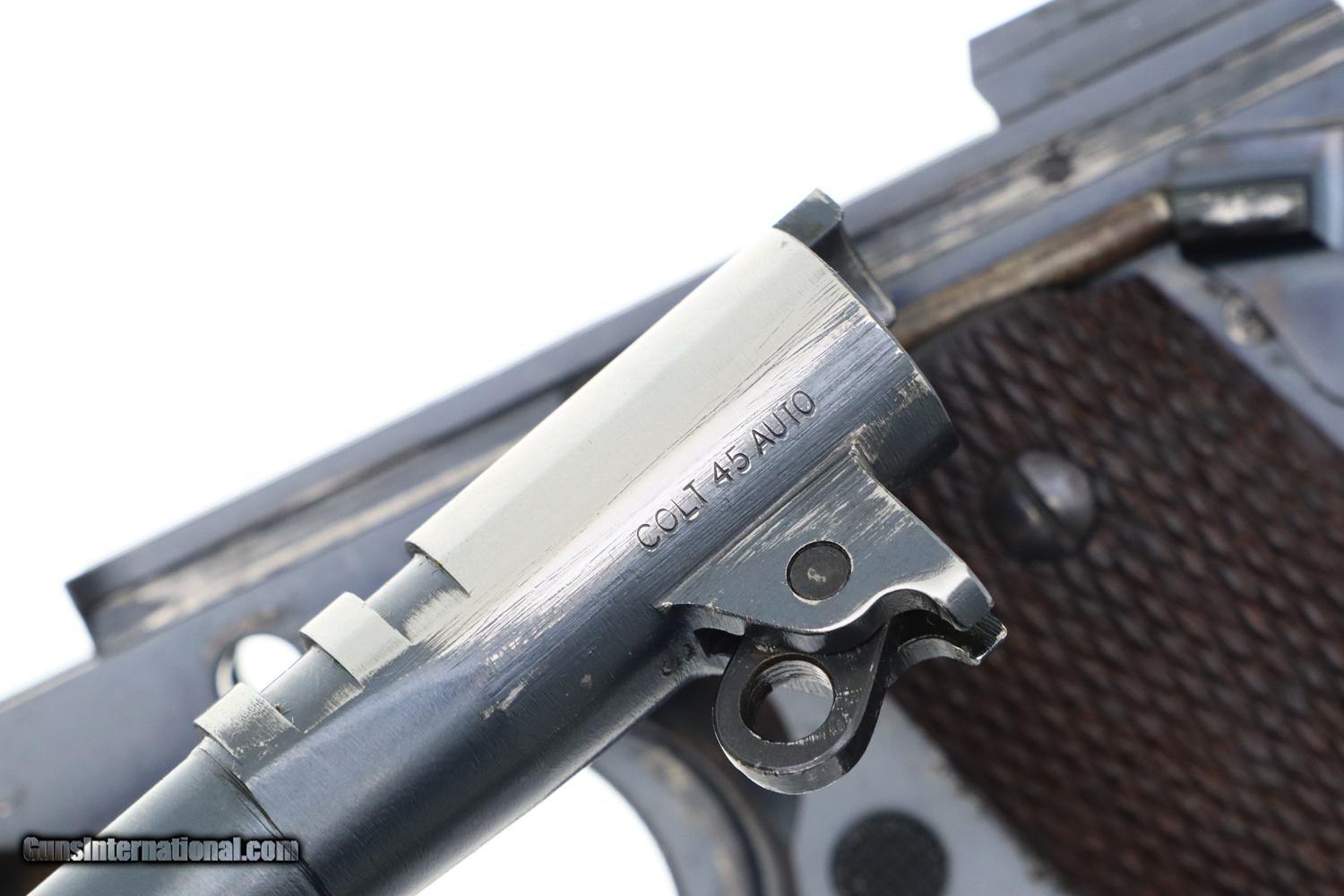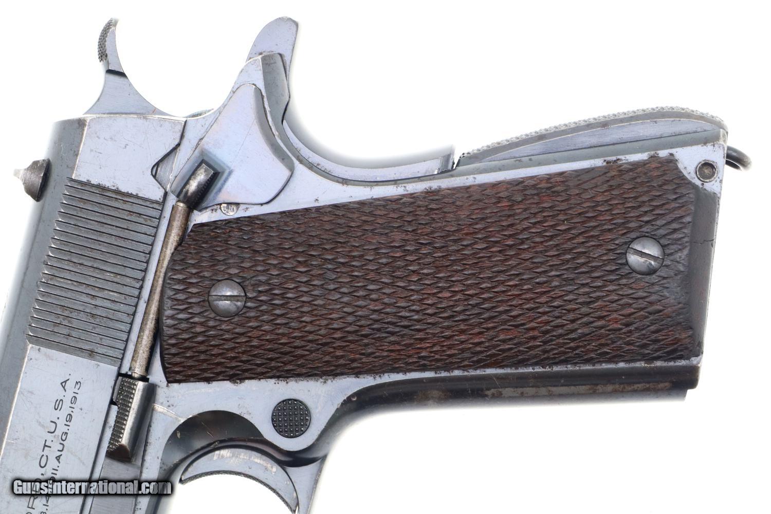 VG original Prewar Colt blue with sharp edge wear, speckling, handling marks, and frontstrap thinning as befitting a service pistol that has seen moderate use. Comparable condition grips that are oil darkened with diamond blunting. Bright bore, light erosion, easily discernible rifling. Correct manual mechanics. An attractive and entirely original Colt Prewar Government Model as used by the Argentine Navy.
