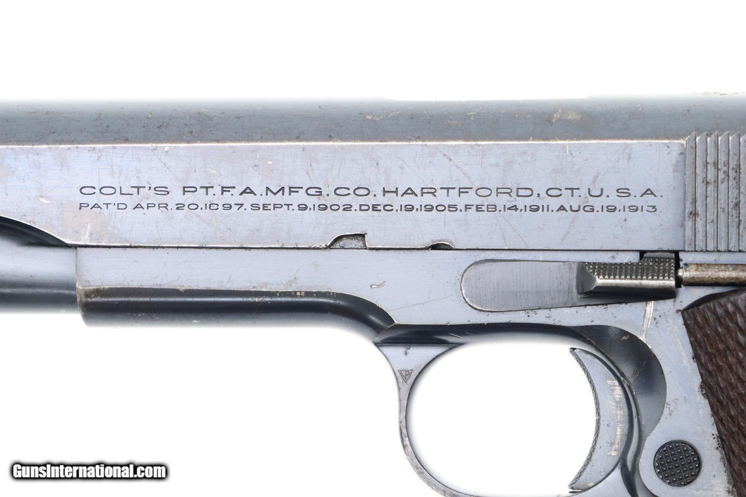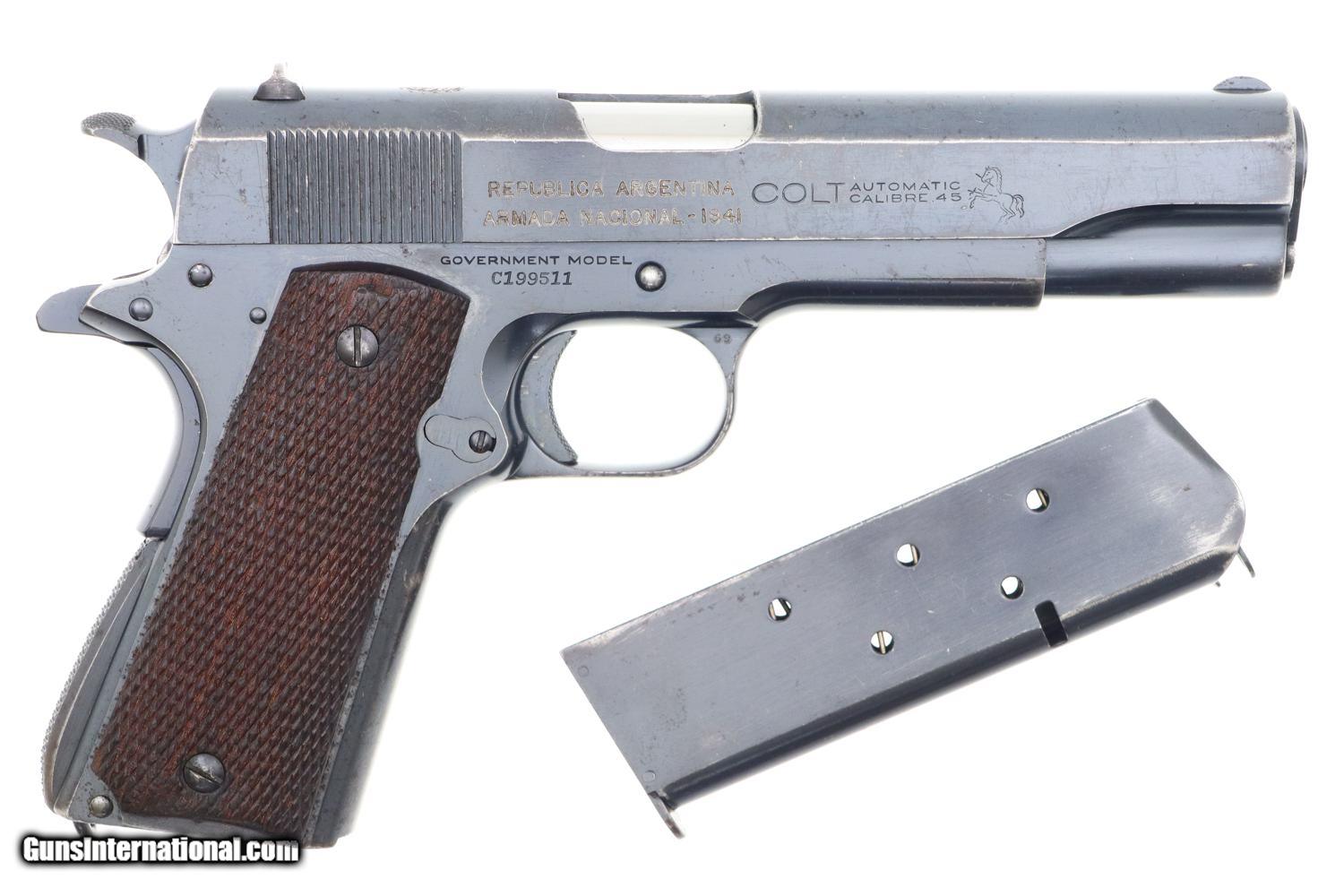 Relatively scarce Colt 1911A1 Prewar Commercial Government Model pistol with matching slide and Swartz safety, Cal .45 ACP, 1 of 500 pistols issued to the Argentine Navy in 1941. The pistol is a standard Prewar Commercial Government model with fixed front sight and drift adjustable rear sight. The left side of slide marked with two line address referencing Colts location and series of patents. The right side of the slide COLT AUTOMATIC CALIBRE 45 suffixed by rampant Colt with the right side of the frame market GOVERNMENT MODEL overlying the serial number. As true for the Argentine Navy contract pistols upon receipt the top of the slide was marked with the Argentine crest while the right side of the slide was panto-graphed: REPULICA ARGENTINA/ARMADA NACIONAL-1941. Fitted with usual coarsely checkered walnut grips. Fixed lanyard ring at the bottom of mainspring housing. Blued magazine with pinned floorplate marked COLT 45 AUTO.