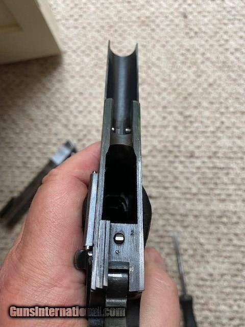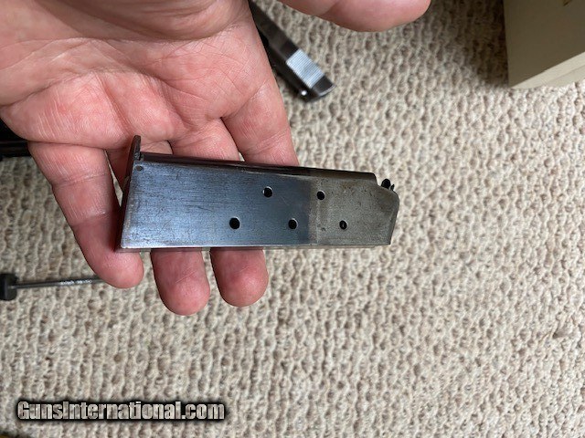 Description: This is a Colt Commercial Government Model 1911 in 45ACP, early built in 1917. This pistol features a 5” barrel, hardwood grips, manual safety, smooth straight backstrap, and TWO magazine. It is in very good HONEST ORIGINAL condition with original finish remaining and a light gray patina over some of the metal surface as shown, no rust or pitting .All stampings as sharp and easily seen with the naked eye. The barrel is only marked with "P" , no other stampings visible, frame and slide have typical stampings as shown. The bore is bright with strong rifling and the action of the pistol is very smooth. The slide to frame fit is snug with little to no wiggle. Overall an excellent example of one of the most iconic pistols ever made! C&R OK, LAYAWAY with 20% down and 90 days terms. AS IS NO refund or return. SOLD Curio/Relic: Yes Manufacturer: Colt Model: 1911 Condition: Good Metal Condition: Good Wood Condition: Good Bore Condition: VG Manufacture Date: 1917 |
