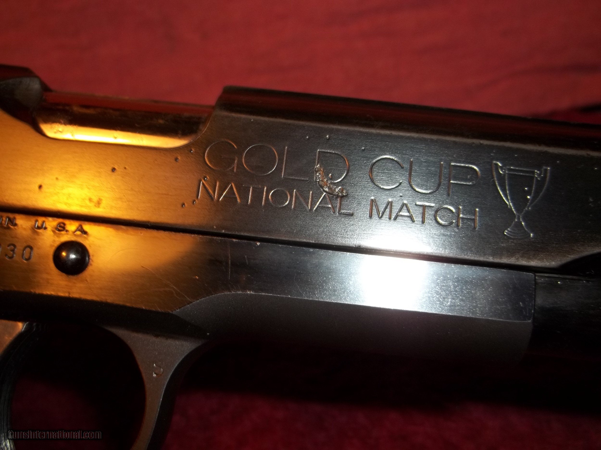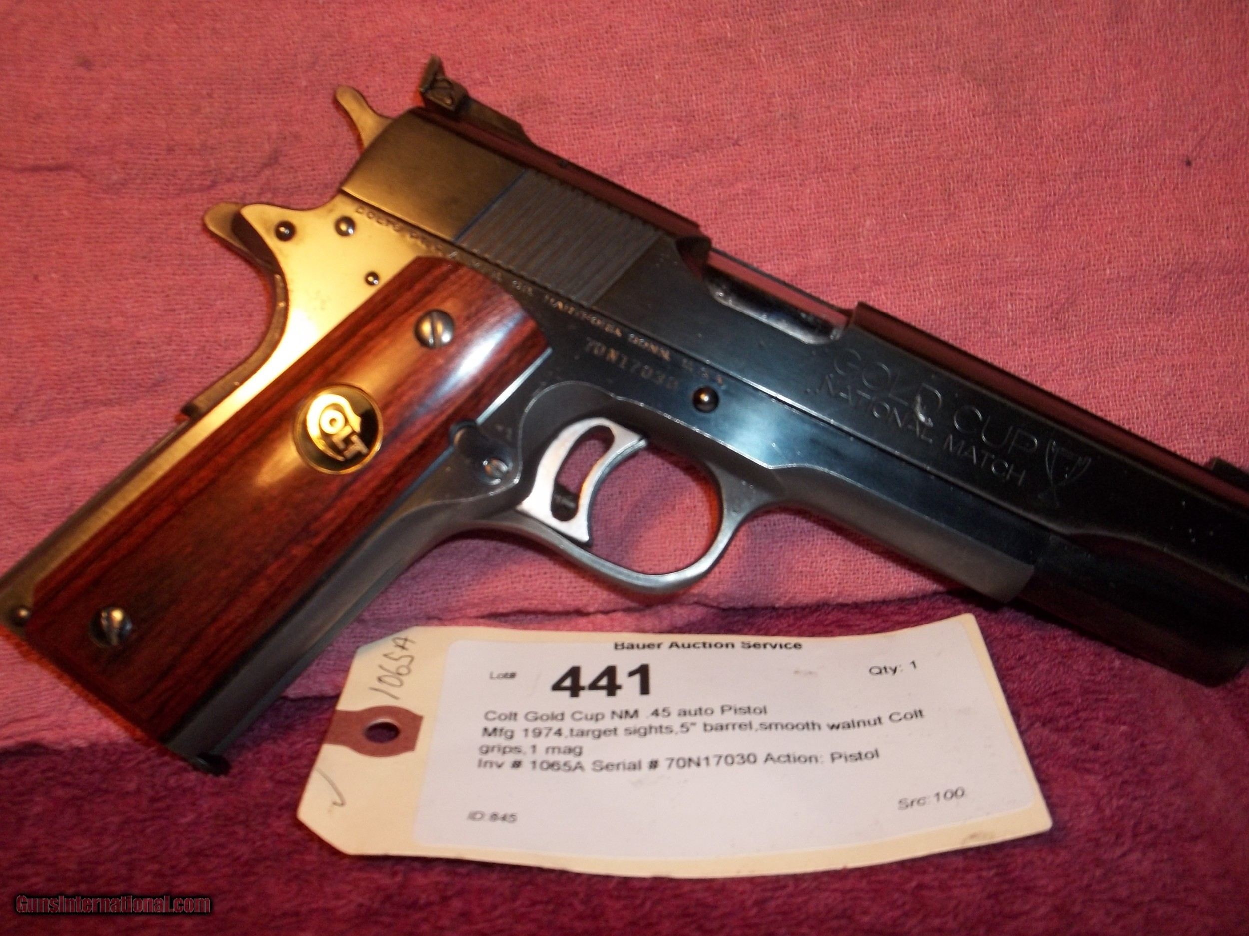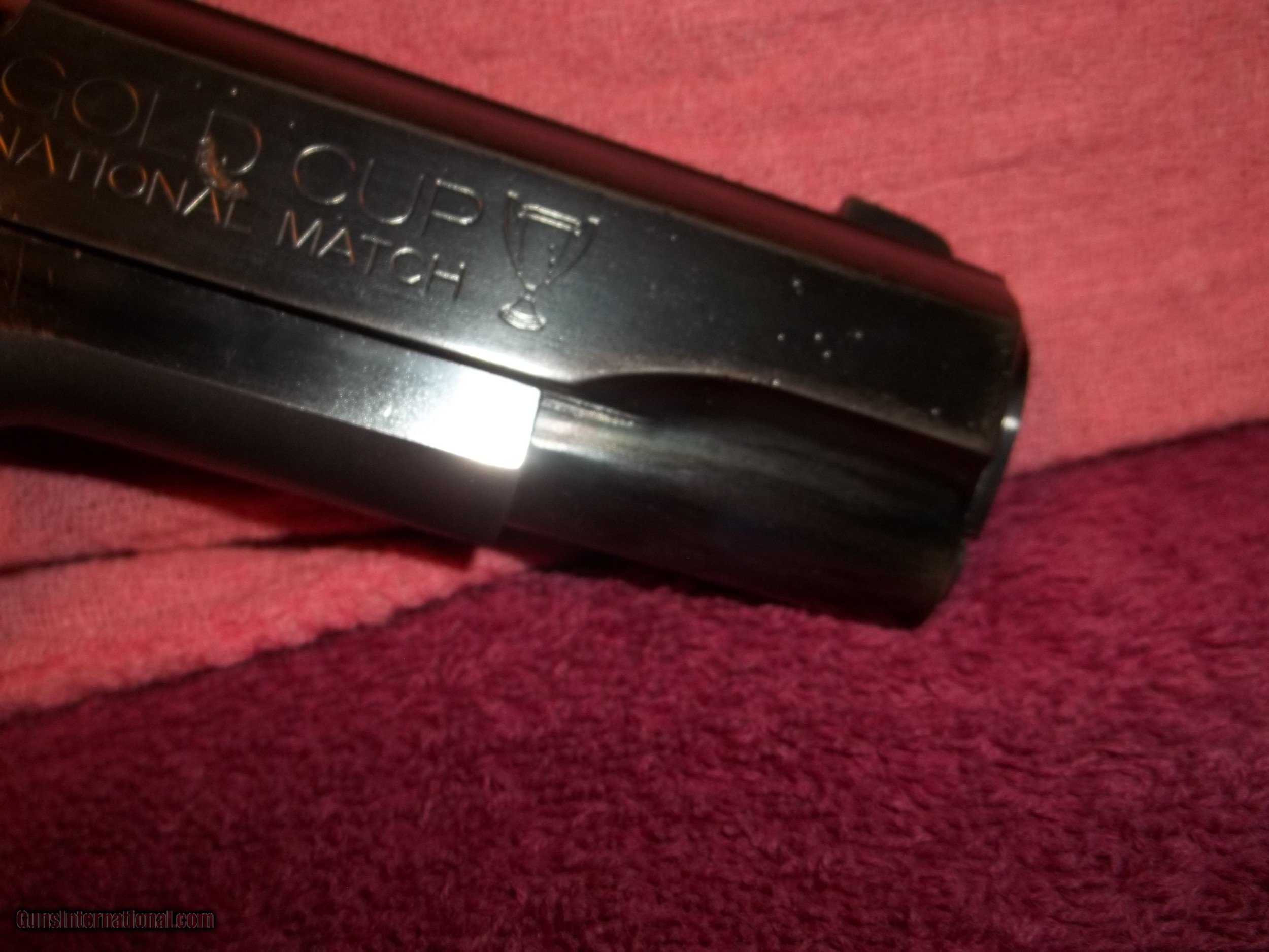 Description: Colt Gold Cup National Match...45ACP...5 Inch Barrel...Colt Dark Blue Frame & Slide...Accurizer Barrel & Bushing...Colt-Ellison Rear Adjustable Sight...Blade Front Sight...Smooth Walnut Grips with Colt Blue Madellion...Flat Mainspring Housing...Adjustable Trigger...Target Hammer...7rd Magzinine...Mfg. 1974...Good Condition ( ding under letter "D" on RT side on Slide & slight pitting on Slide Rt side near front).....This gun would make a great shooter...Personal Check or Money Order...Lawayay Available...If using Layaway contact us at (352)352-0830....Shipping & Insiurance $ 35.00 SOLD |