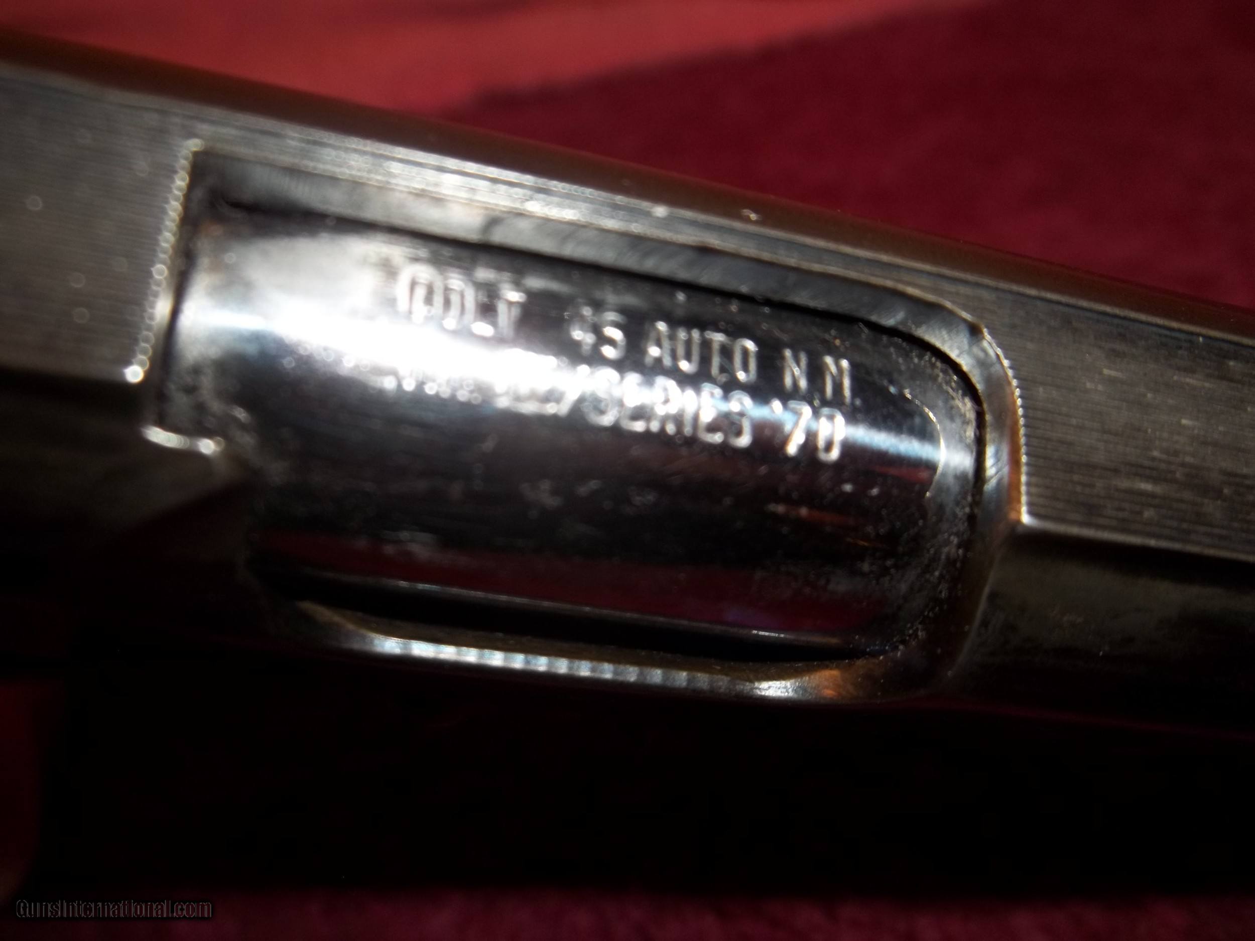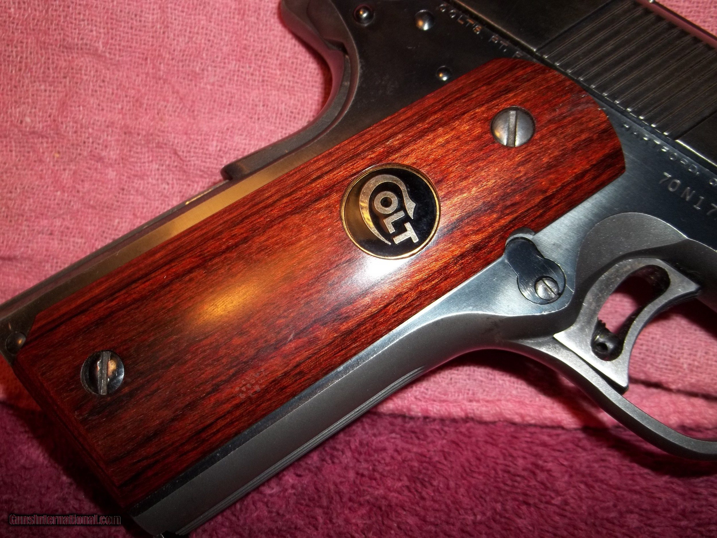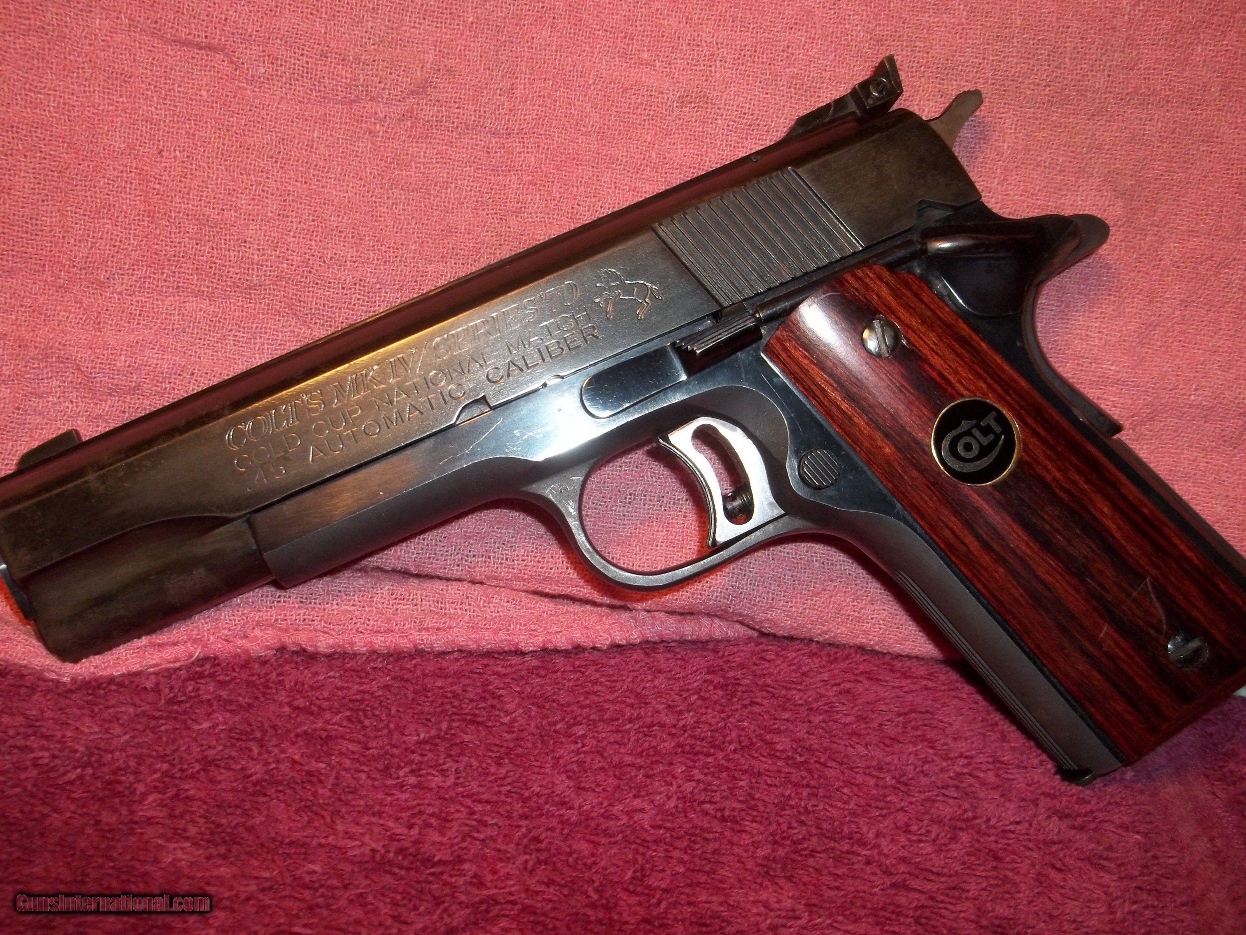 Description: Colt Gold Cup National Match...45ACP...5 Inch Barrel...Colt Dark Blue Frame & Slide...Accurizer Barrel & Bushing...Colt-Ellison Rear Adjustable Sight...Blade Front Sight...Smooth Walnut Grips with Colt Blue Madellion...Flat Mainspring Housing...Adjustable Trigger...Target Hammer...7rd Magzinine...Mfg. 1974...Good Condition ( ding under letter "D" on RT side on Slide & slight pitting on Slide Rt side near front).....This gun would make a great shooter...Personal Check or Money Order...Lawayay Available...If using Layaway contact us at (352)352-0830....Shipping & Insiurance $ 35.00 SOLD |