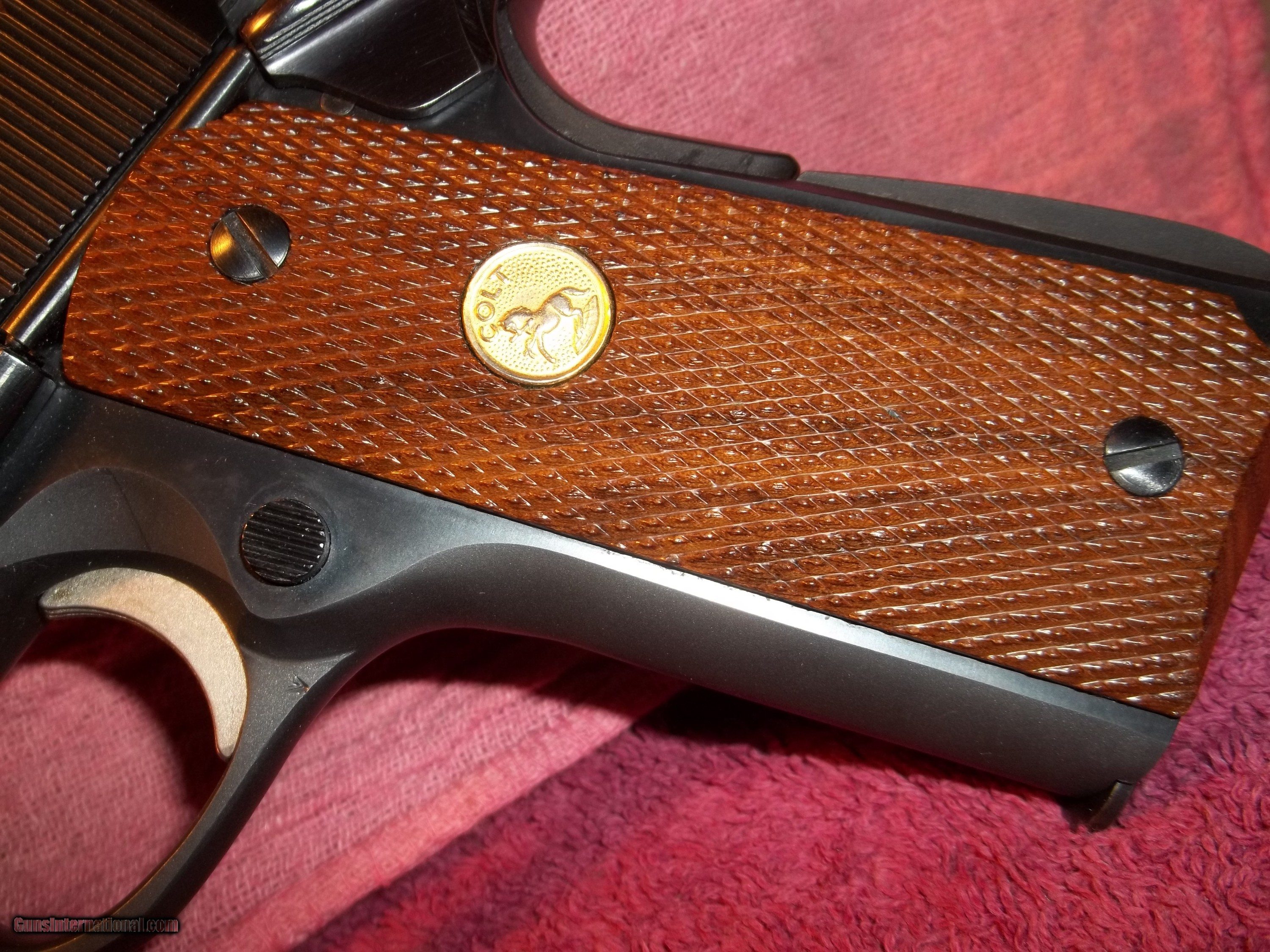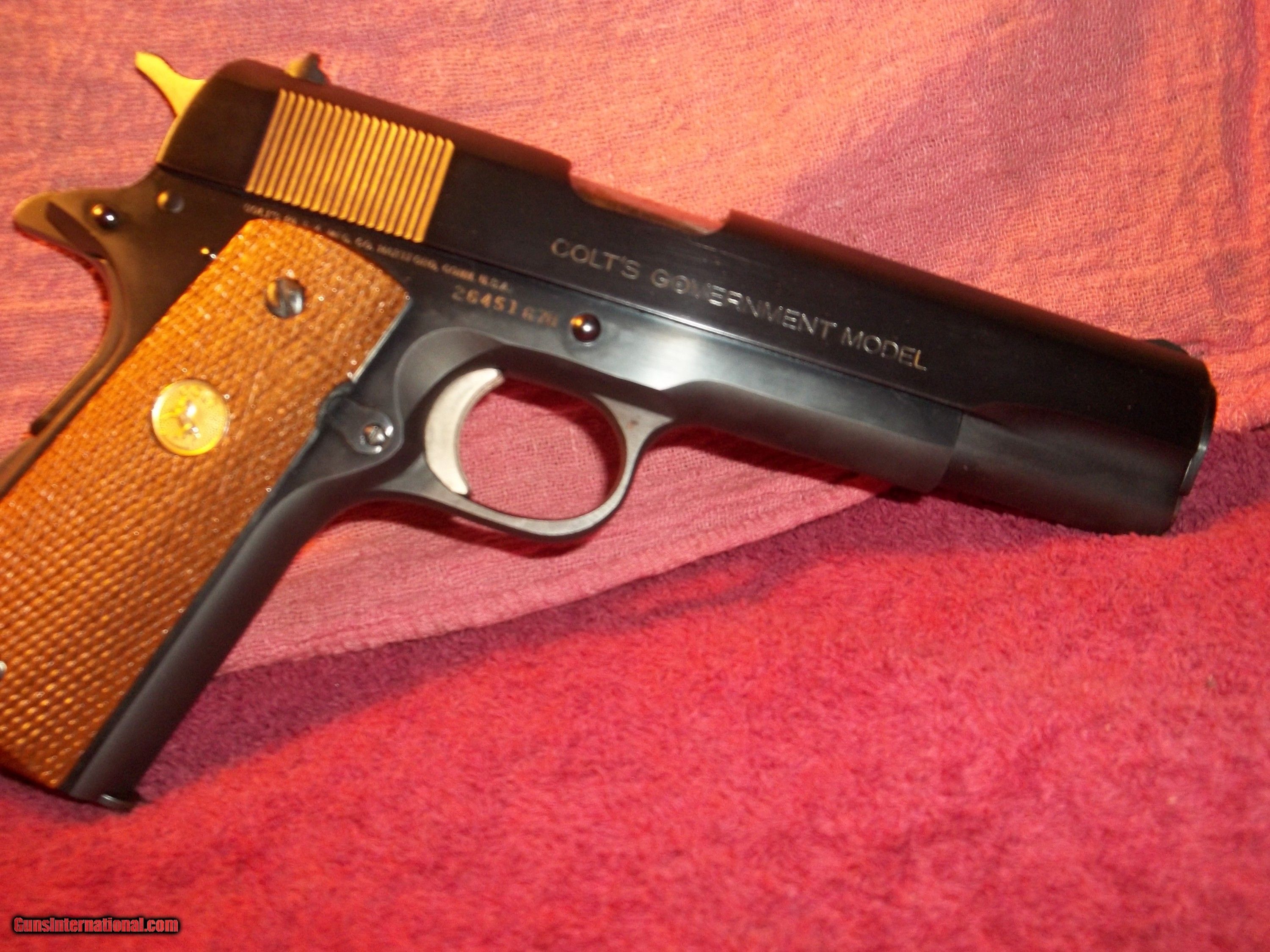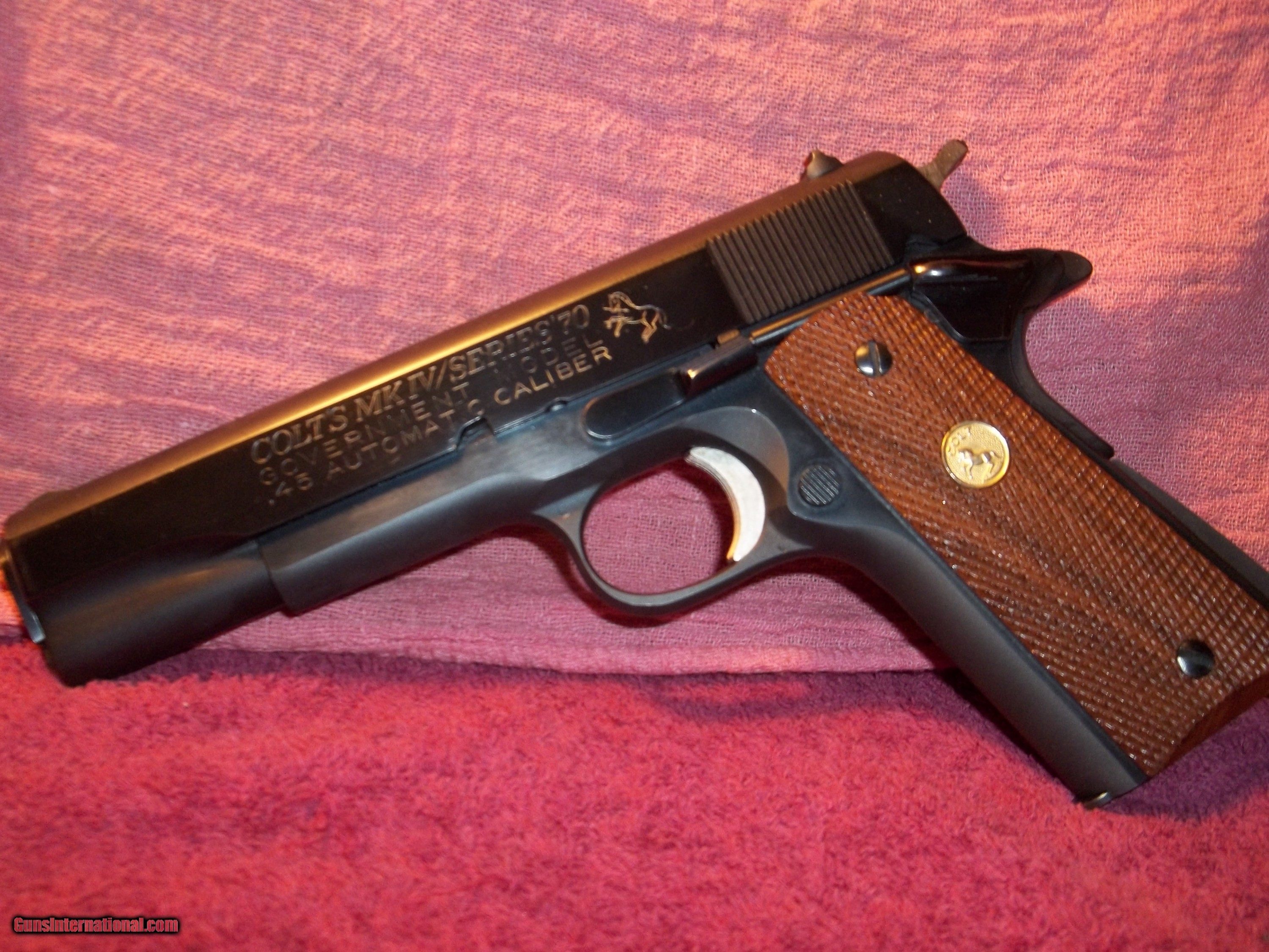 Description: Colt Government MKIV series 70...45ACP...5-inch Barrel...Excellent condition, looks to have never been fired...Colt Blue Frame and Slide...Walnut grips w/Gold Colt Medallions...Mfg. 1977...Personal Check...Lawayay Available... SOLD Handgun Caliber: .45 ACP (.45 Auto) |