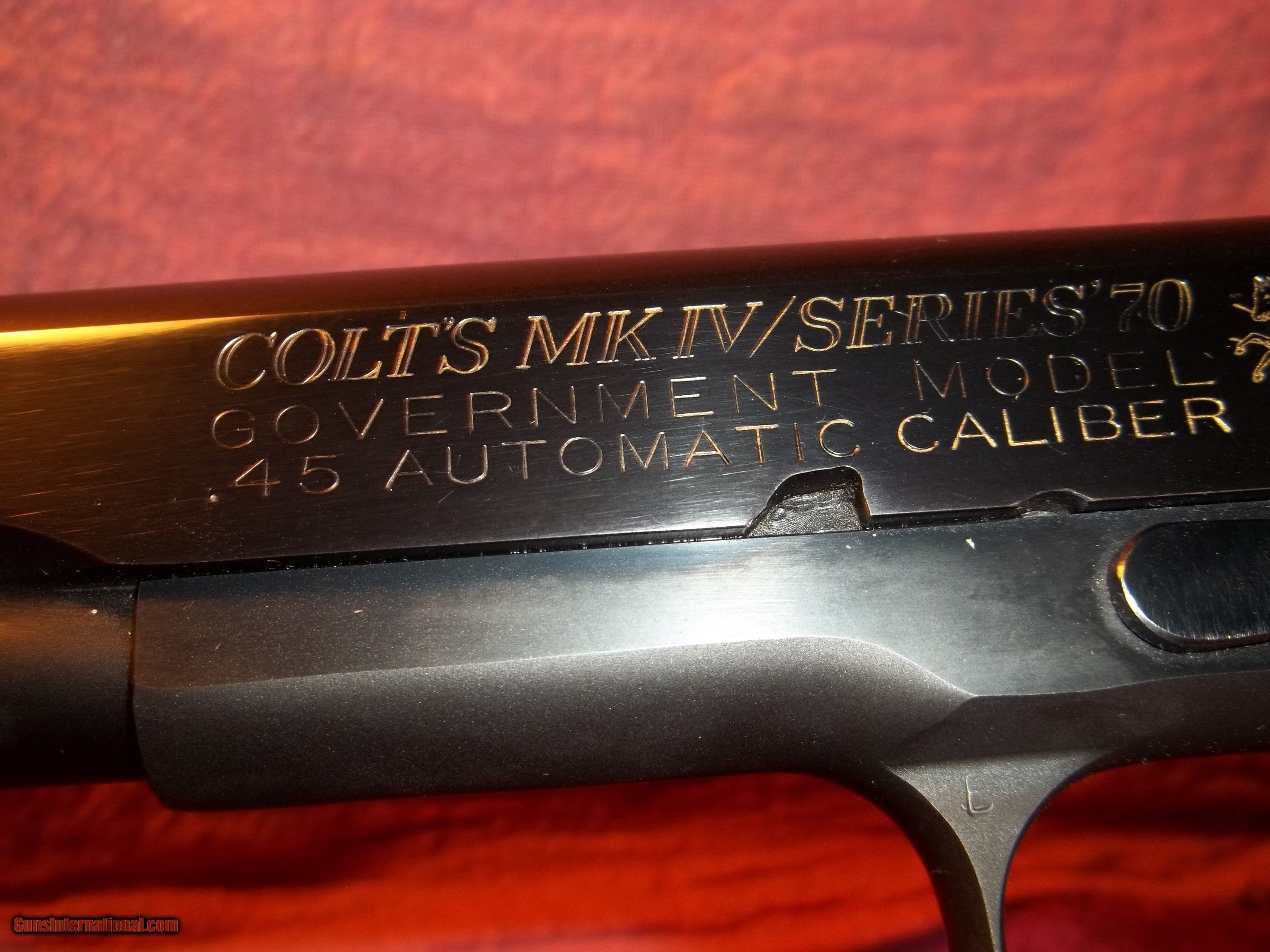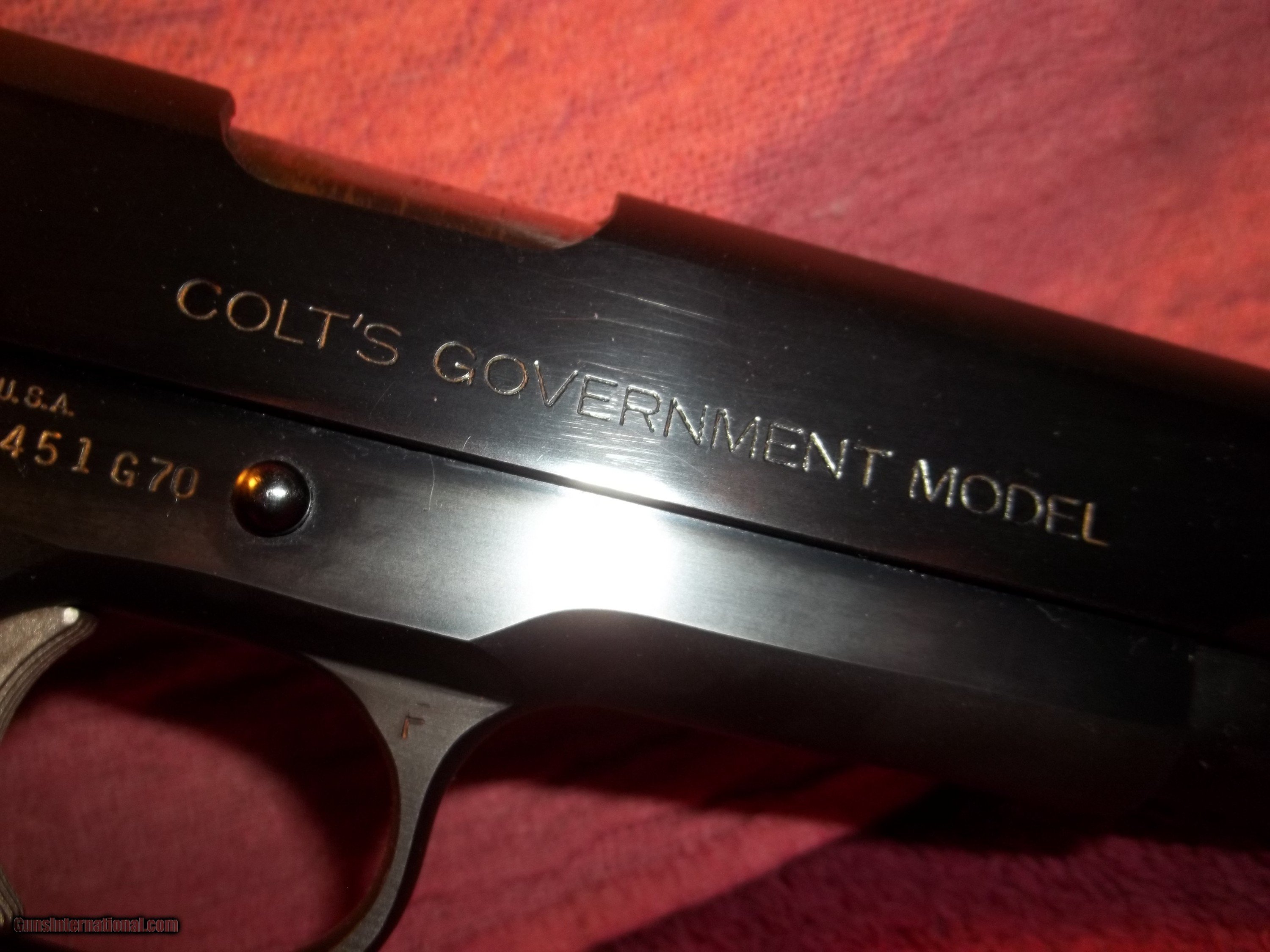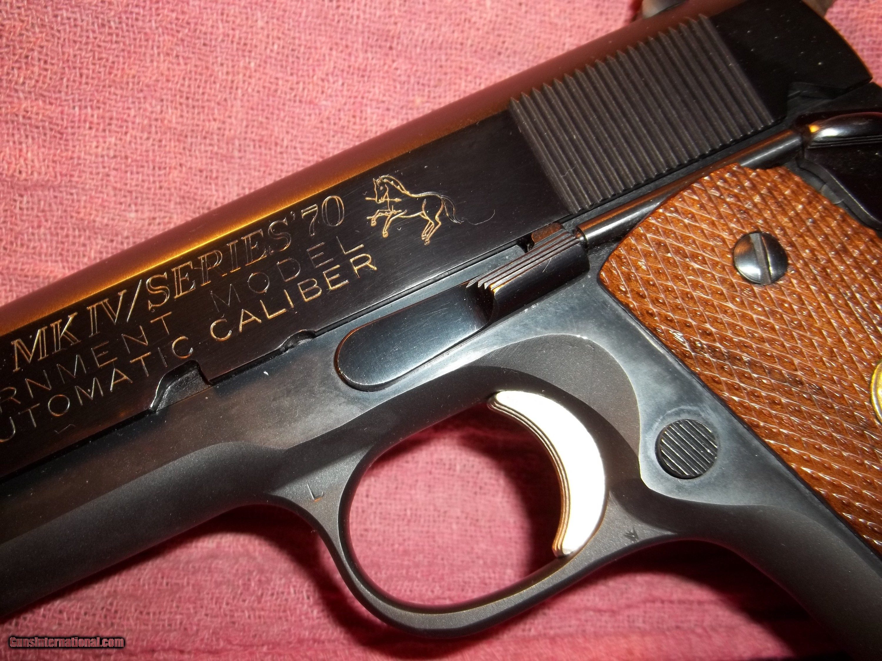 Description: Colt Government MKIV series 70...45ACP...5-inch Barrel...Excellent condition, looks to have never been fired...Colt Blue Frame and Slide...Walnut grips w/Gold Colt Medallions...Mfg. 1977...Personal Check...Lawayay Available... SOLD Handgun Caliber: .45 ACP (.45 Auto) |