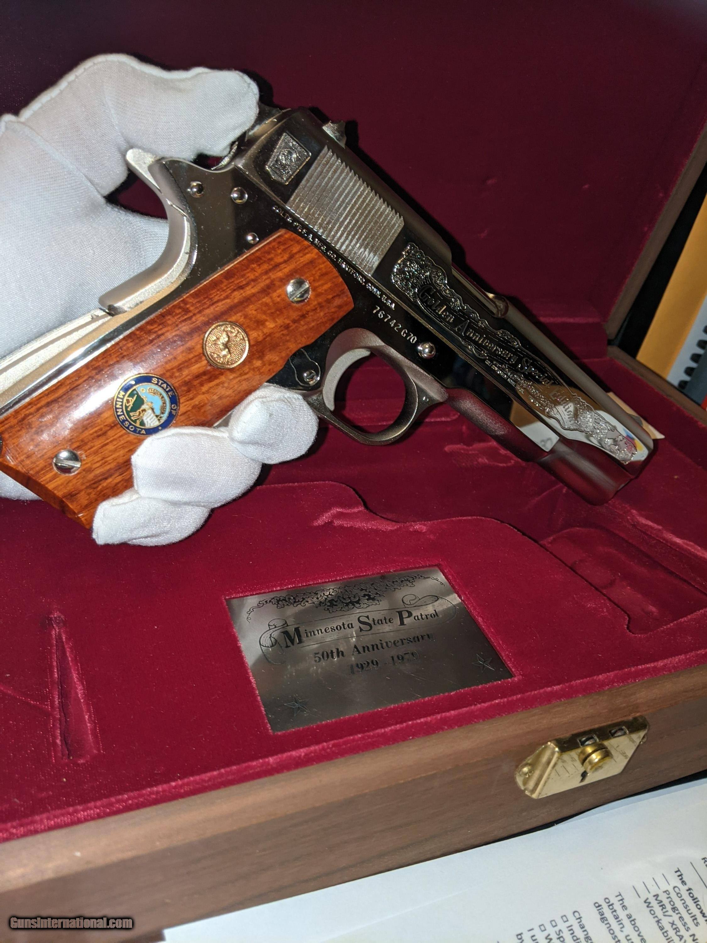 Description: Minnesota state patrol limited special edition 1 of 500 never fired in felt lined wooden box. This 1911 is engraved on both sides of the slide with different engraving and is nickel plated polished with the state patrol logo in the grip along with the colt medallion. Highly collectable rare 1911 SOLD Handgun Caliber: .45 ACP (.45 Auto) Manufacturer: Colt Model: 1911 government mark IV Series 70 Barrel Length: 5 inch Bore: Excellent Chambers: Excellent Ejectors: Excellent Condition: Excellent Metal Condition: Excellent Wood Condition: Excellent Bore Condition: Excellent Barrels: Excellent Barrel Type: Stock Action: Auto Triggers: Stock Stock: na Stock Dimensions: Na Stock Drop: Na Stock Comb: Na Stock Heel: Na Stock Cast: Na Fore End: Na Butt Pad: Na LOP: Na Rib: Na Finish: Polished Sights: Stock Manufacture Date: 1978 Chokes: Na Choke Left: Na Choke Right: Na Engraving: Yes Extras: Display box with plaque Case: Na Item Location: Minnesota Minimum Wall Thickness Left: Na Minimum Wall Thickness Right: Na |