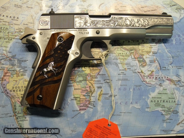 Description: NEW COLT 1911A1 GOVERNMENT MODEL P/N O1091 TDI TALO SPECIAL EDITION, #112 OF 300, IN .45ACP. FULL SIZE, WITH MT. SURIBACHI FLAG RAISING ENGRAVED ON THE LEFT SIDE OF THE SLIDE. THE RIGHT SLIDE IS A JUNGLE SCENE ON IWO JIMA ENGRAVED ON THE SLIDE IN POLISHED STAINLESS STEEL. IT IS A SEMI AUTO PISTOL WITH SAO TRIGGER SYSTEM . COMES WITH 5 INCH BBL,CUSTOM WALNUT GRIPS WITH THE AMERICAN FLAG ENGRAVED ON THE GRIPS AND THE RAMPANT COLT HORSE LOGO INLAY. HAS WHITE FIXED SIGHTS, MANUAL SAFETY, GRIP SAFETY,GROOVED TRIGGER, SERVICE HAMMER. COMES WITH TWO SEVEN RD MAGS,TRIGGER LOCK, HARD PLASTIC CASE, FACTORY WARRANTY & MANUAL. Mastercard/Visa no fee S&H with insurance is $45.00. SOLD |