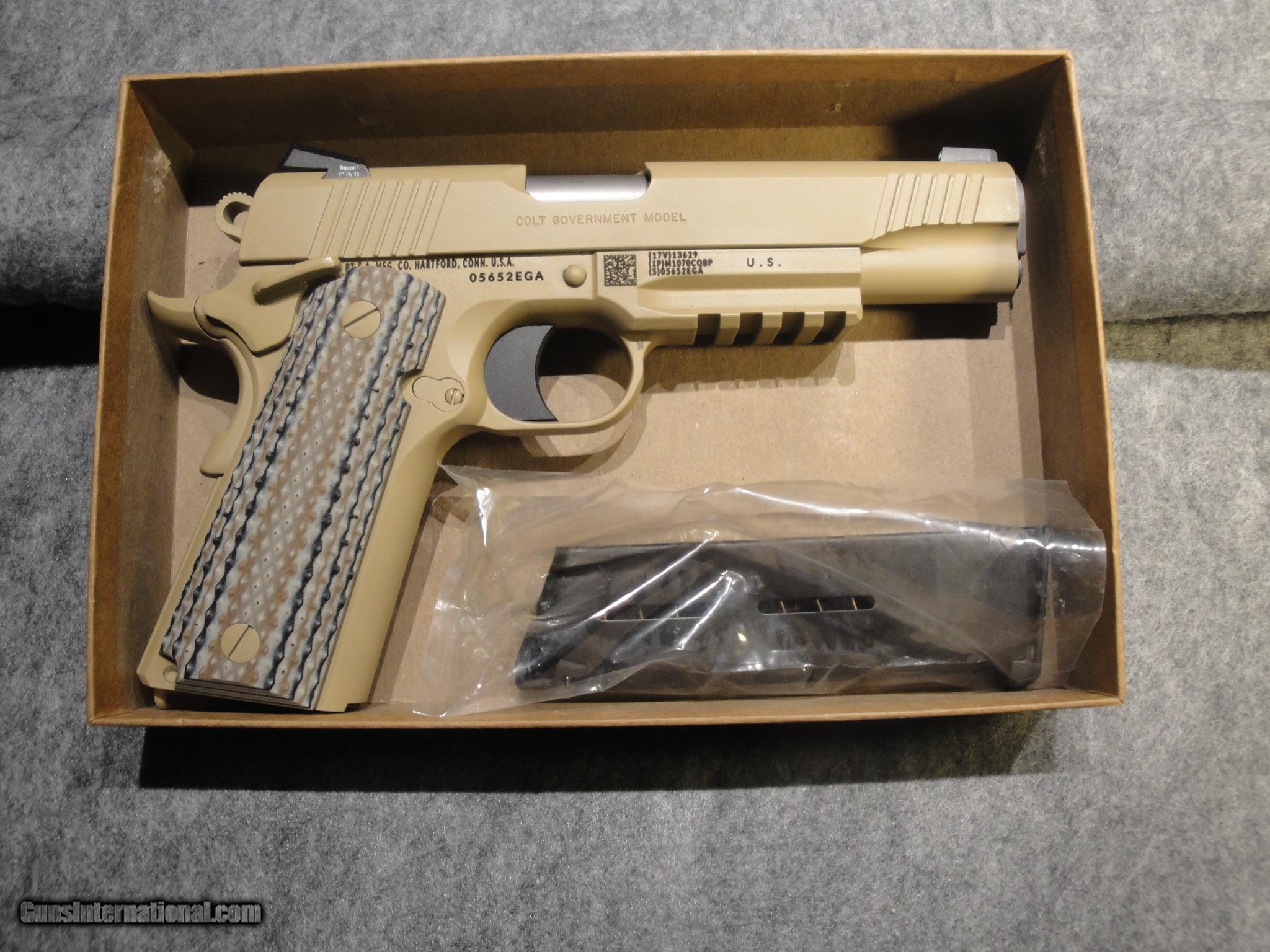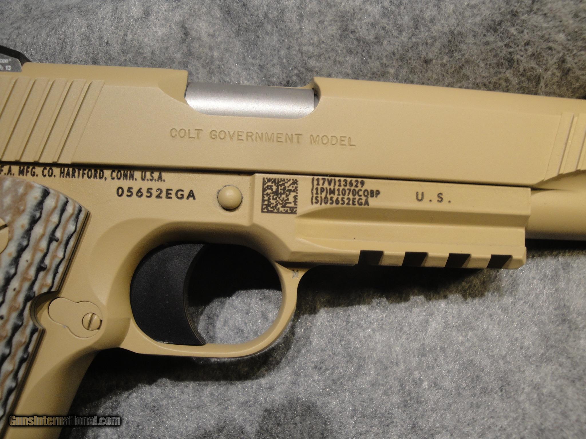 Description: Colt M45A1 Close Quarter Battle Pistol USMC Decommissioned Cal.45 Desert Tan Cerakote Finished Stainless steel slide and receiver MIL-STD-1913Picatinny accessory rail National Match Barrel Colt Letter with all the details SOLD Manufacturer: Colt Model: Colt M45A1Close Quarter Battle Pistol USMC Decommissioned Unit Serial Number: 05652EGA Caliber Info: 45 Bore: Great Condition: 100% Metal Condition: 100% Bore Condition: great Action: pistol Triggers: solid aluminum |