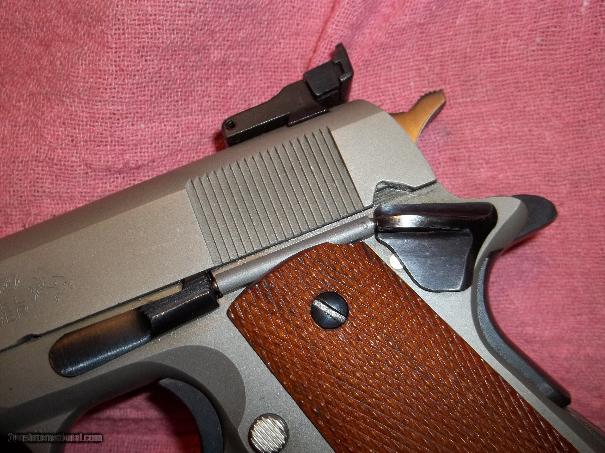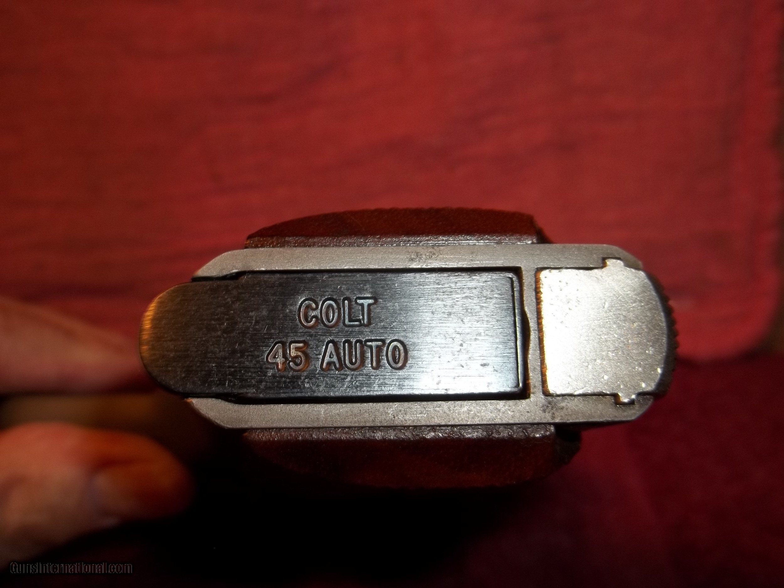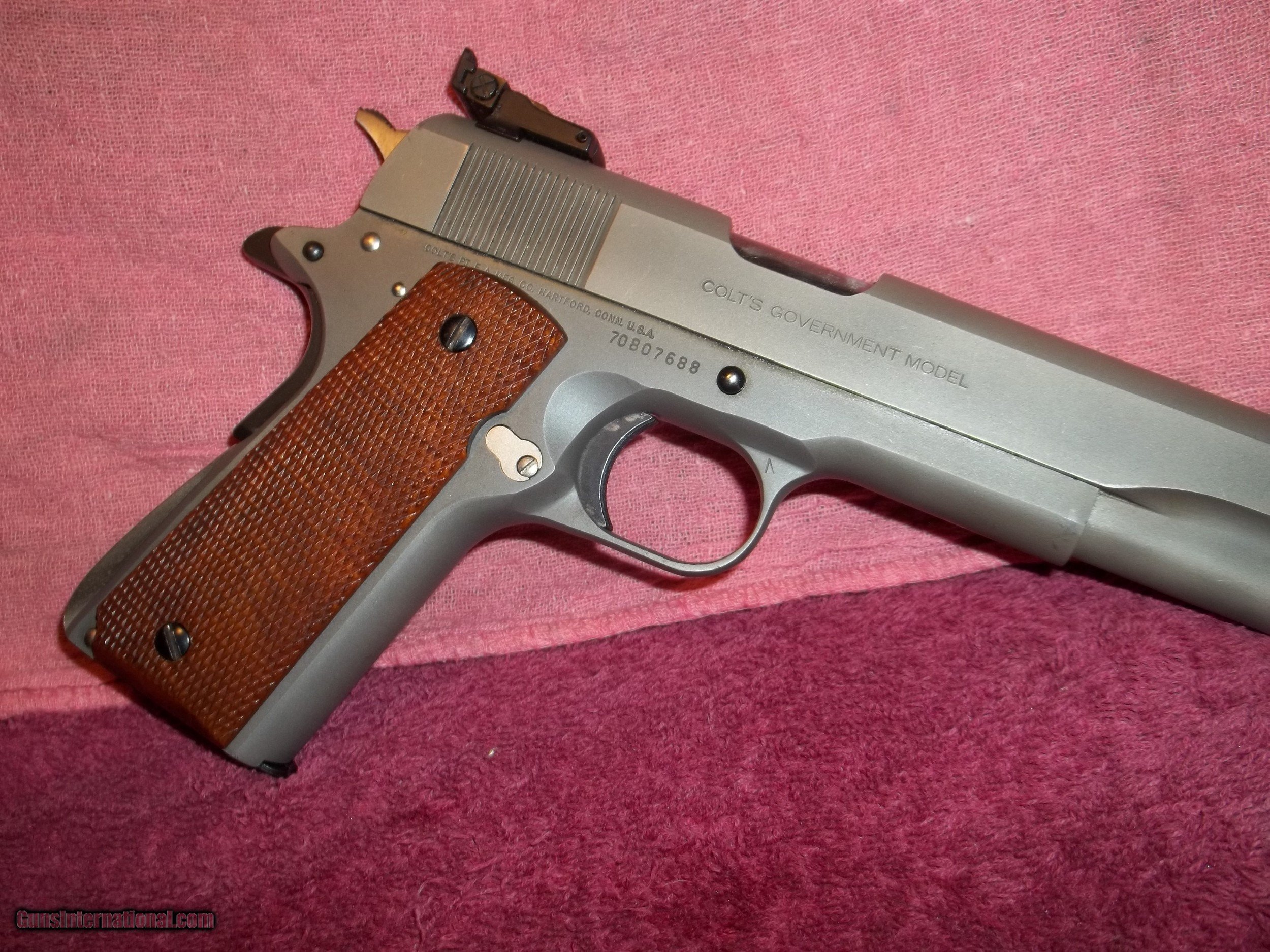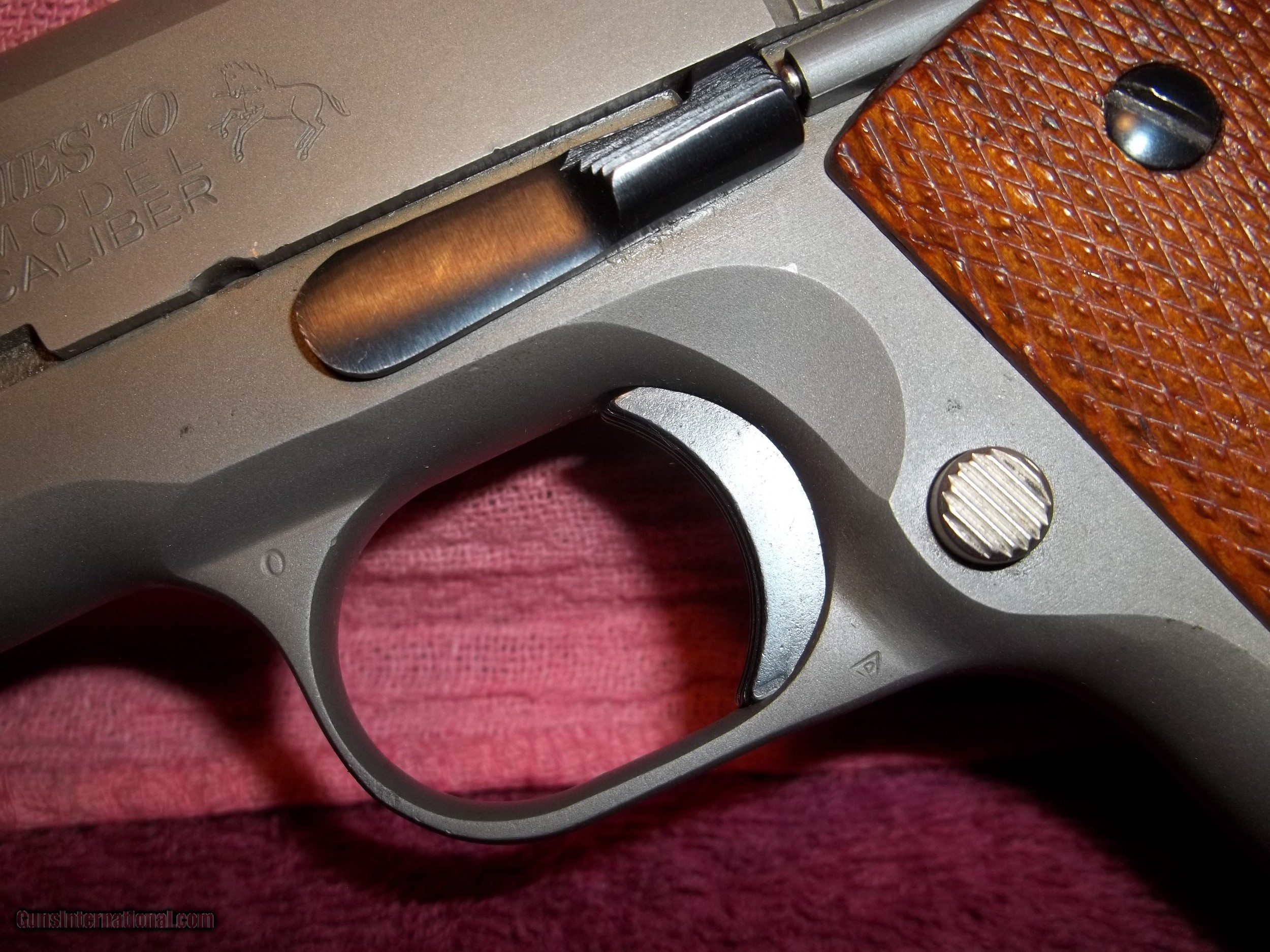 Description: Colt MKIV Governemnt series 70...45ACP...5 Inch Barrel..."BLACK" Safety Lock, Slide Safety, Barrel Bushing, Grip Safery, Blade Front Sight w/Red Insert & Adjustable Rear Sight...Short Trigger...Arched Main Spring Housing...Mfg.1981...7rd Magzaine...Walnut Checked Grips...Perkerized Frame & Slide...May have been Arsenal refinished ?...Personal Check or Money Order...Layaway Available... SOLD |