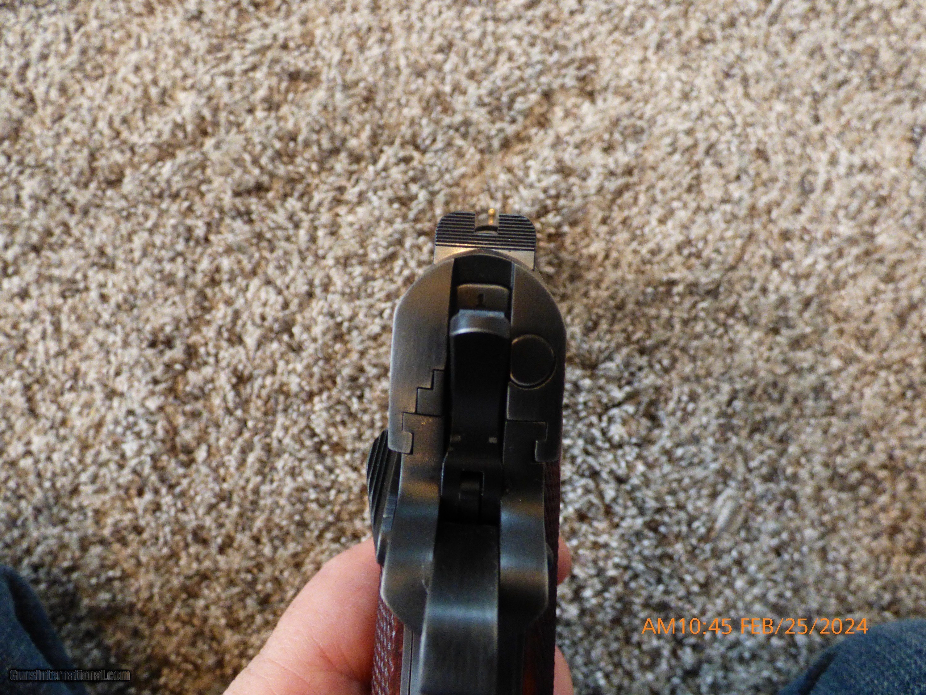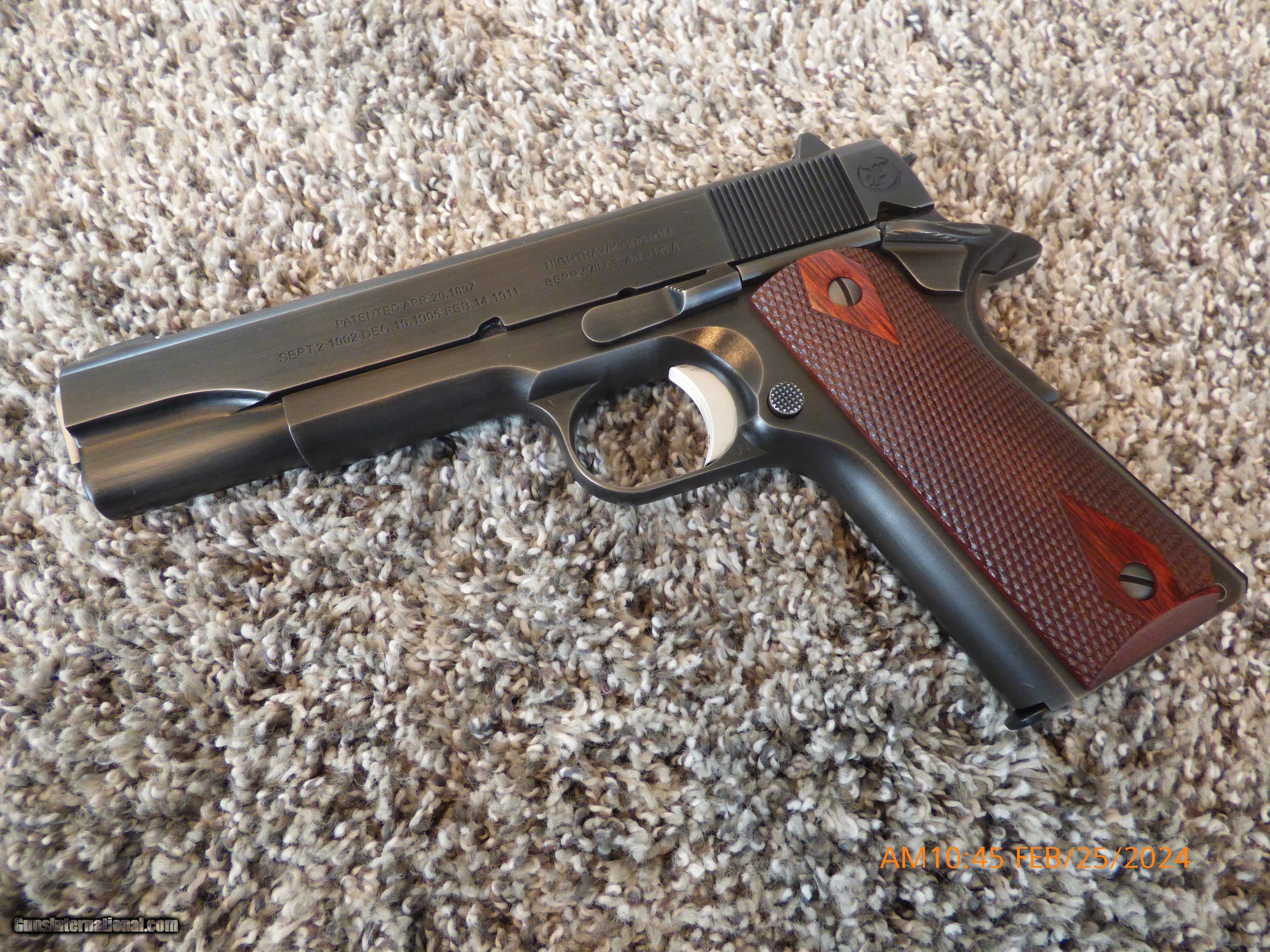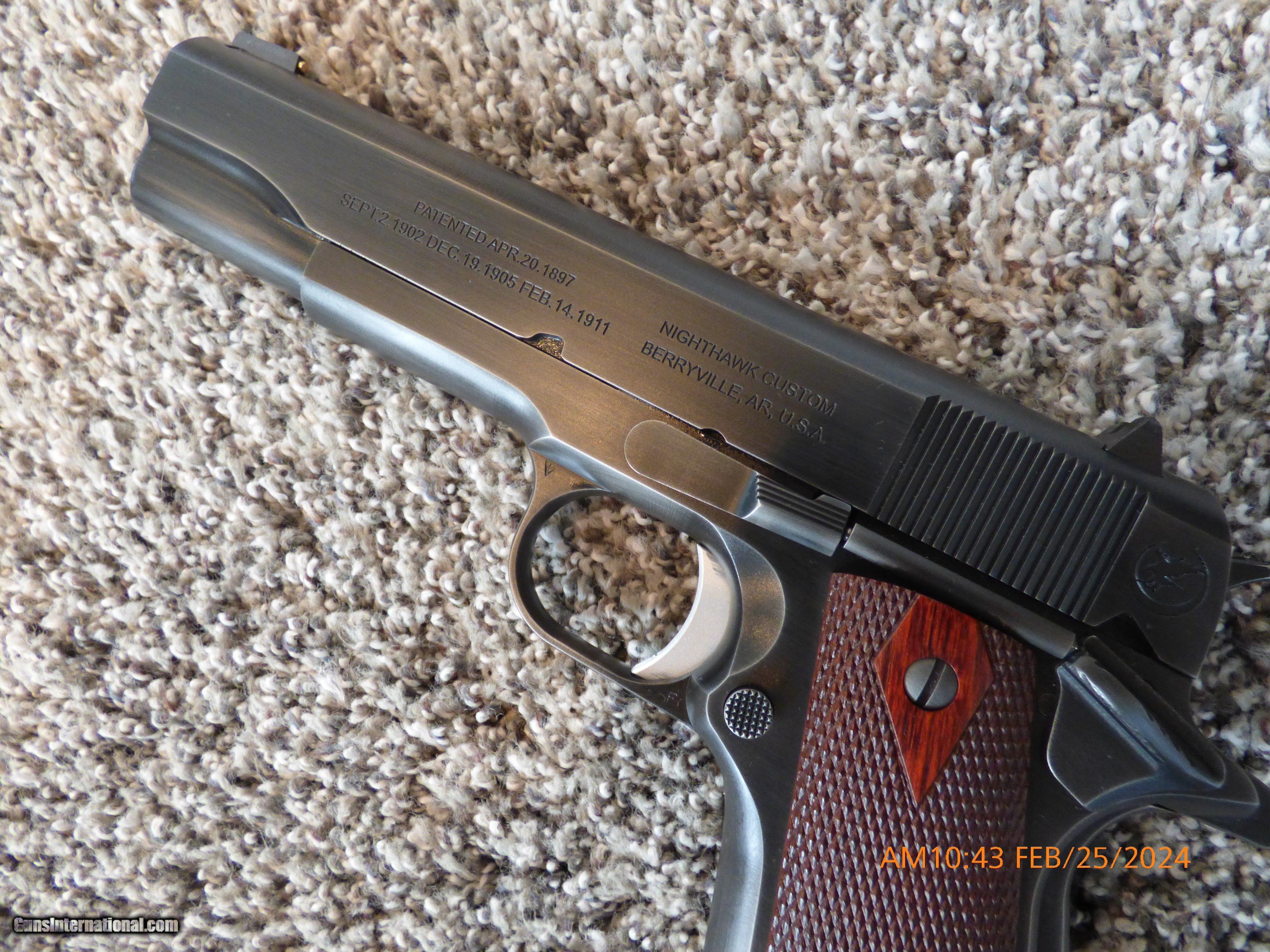 Description: The Nighthawk Custom Colt Series 70 offers several functional and aesthetic upgrades to a timeless classic. Nighthawk Custom has taken the Colt 1911 Classic and brought it back to a period correct Colt 1911 "1912 Commercial" model with rollmarks and engraving. An all-new trigger system has been installed with a match grade, solid short trigger, fully machined disconnector, sear, hammer strut, and pin. The rear sight has been replaced with a fully machined retro sight while the front sight features a Nighthawk Custom 14k gold bead. The Colt Series 70 has been outfitted with a retro hammer, mainspring housing, and match barrel bushing. While not offering a slide-to-frame fit, Nighthawk Custom has upgraded the performance of the Colt Series 70 with a full reliability enhancement and action tune. The performance upgrade began with the flattening and polishing of the breech face. The feed ramp was then machined to the proper dimension before being polished. The barrel was throated and polished while the chamber was reamed and polished. The Colt extractor was polished and tuned before both the Colt ejector and slide stop were adjusted and tuned. The Colt mag release was also tuned and polished for smoother function. A new Nighthawk Custom 17 lb. recoil spring was added, as was a Nighthawk Custom extra power firing pin spring. The mainspring was replaced by a Nighthawk Custom 19 lb. mainspring to complete the action tune. After hand-beveling the edges of the slide, the Colt Series 70 received a Smoked Nitride distressed finish to make this pistol a functional work of art. This pistol is priced to sell with less than 100 rounds through it. Shipping is $50 to your FFL. Make sure you FFL will accept this pistol from a non FFL holder. Offered at $1000 less than retail. It is extremely accurate and a joy to hold and shoot. SOLD Handgun Caliber: .45 ACP (.45 Auto) Manufacturer: Colt Nighthawk Model: 1911 Condition: as new Metal Condition: as new Wood Condition: as new Bore Condition: as new Finish: Smoked Nitride |