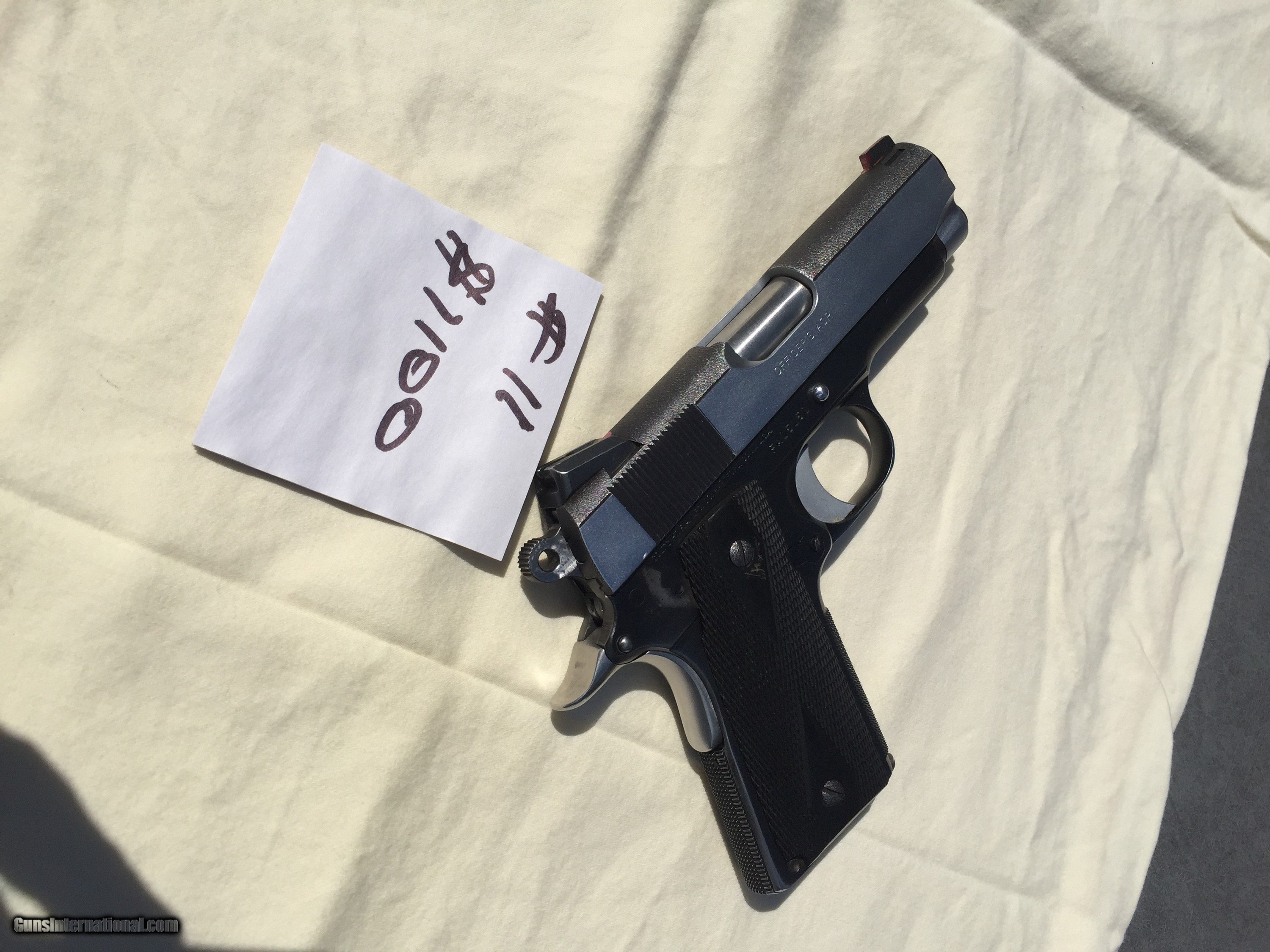 Description: PISTOL: Colt Officer’s model, caliber .45 acp, blue frame, hard chrome slide, novak sights, long trigger, checkered front and rear backstrap, beveled magazine well, beavertail grip safety, custom thin stocks. One Colt Magazine. SOLD Handgun Caliber: .45 ACP (.45 Auto) Manufacturer: COLT Model: MK4 SERIES 80 OFFICER'S MODEL Serial Number: FA15150 Barrel Length: 3.5 Condition: GOOD Metal Condition: EXCELLENT Bore Condition: EXCELLENT Weight: 34 OZ Extras: 1 COLT MAGAZINE Item Location: BOWLING GREEN, VA |