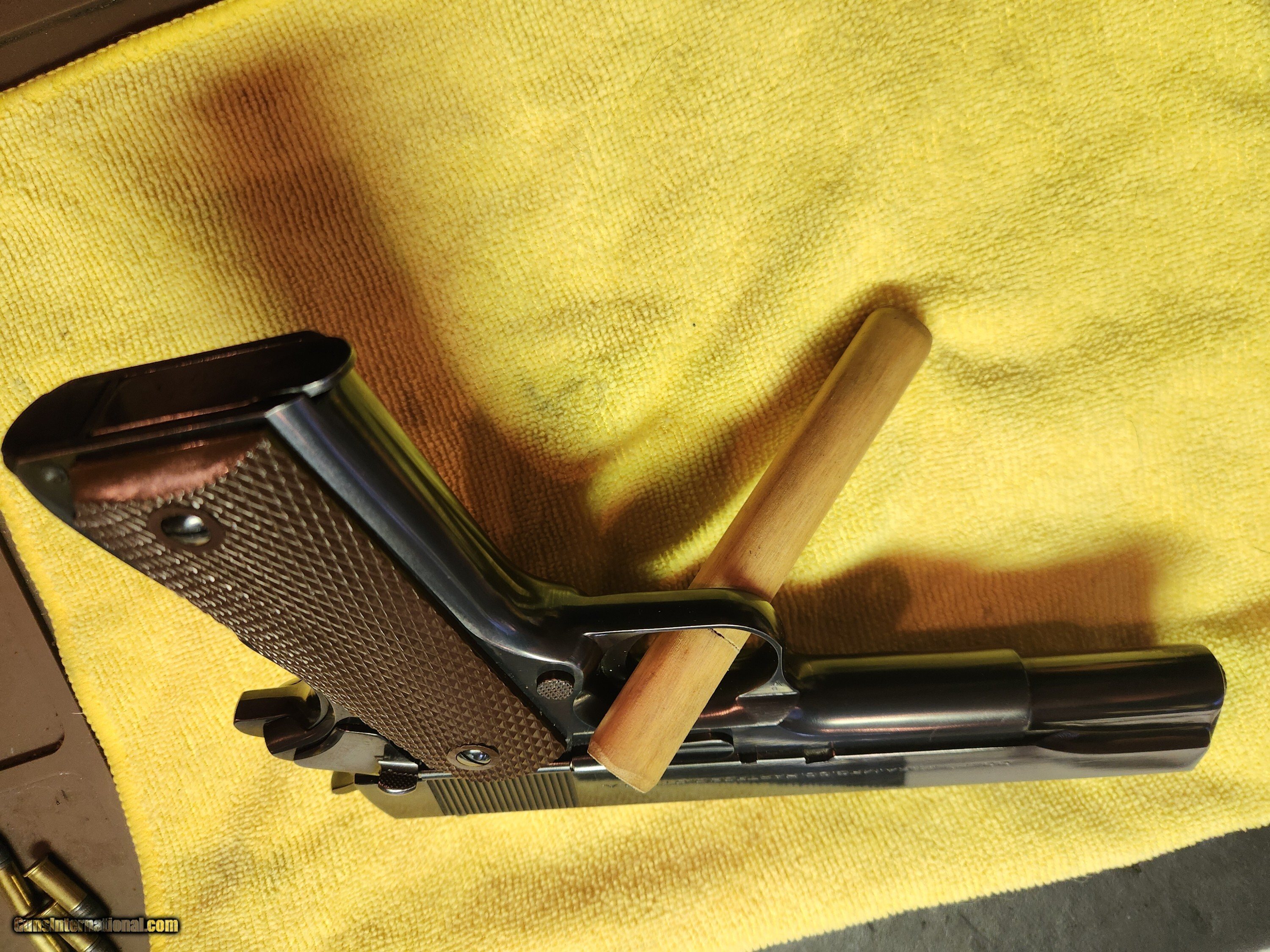 Description: Foe sale is a very early post-war Colt Government Model .45 automatic! These Colt pistols are very scarce. As the WWII ended, Colt never disposed of military spare parts. As Colt started commercial production, the company used many military components left over from war-time 1911A1 production. Since the Government Model was just a better finished 1911A1, these surplus parts were worked into commercial production as a cost saving measure. Only the earliest post-war commercial pistols are manufactured with nearly all military components. The frame also in production as a military part when the Army contract was canceled. The hammer, slide stop, safety, mainspring housing with lanyard loop, and stamped trigger are all military pieces as well. The stocks are likewise surplus WWII Coltwood plastic. The slide and tip of the muzzle are polished bright as was normal on commercial production. The This pistol is in excellent, new condition. I'd grade the factory blue finish about 99%+++ overall. The bullet feed ramp is properly milled in the white and internal wear patterns show that the frame, slide and barrel are all original to one another. The stocks are in new shape with no wear and free of cracks or chips. The mechanics are in perfect working order and the bore is excellent showing bright, sharp rifling. This hard to find Colt .45 variation were made between 1946 - 1947. This is an exceptionally nice exam Curio/Relic: Yes Manufacturer: Colt Model: 1911 Condition: New Metal Condition: excellent Bore Condition: New Finish: Blue Item Location: Scottsdale, AZ Grips: excellent Price: $4,200.00 Contact Seller |