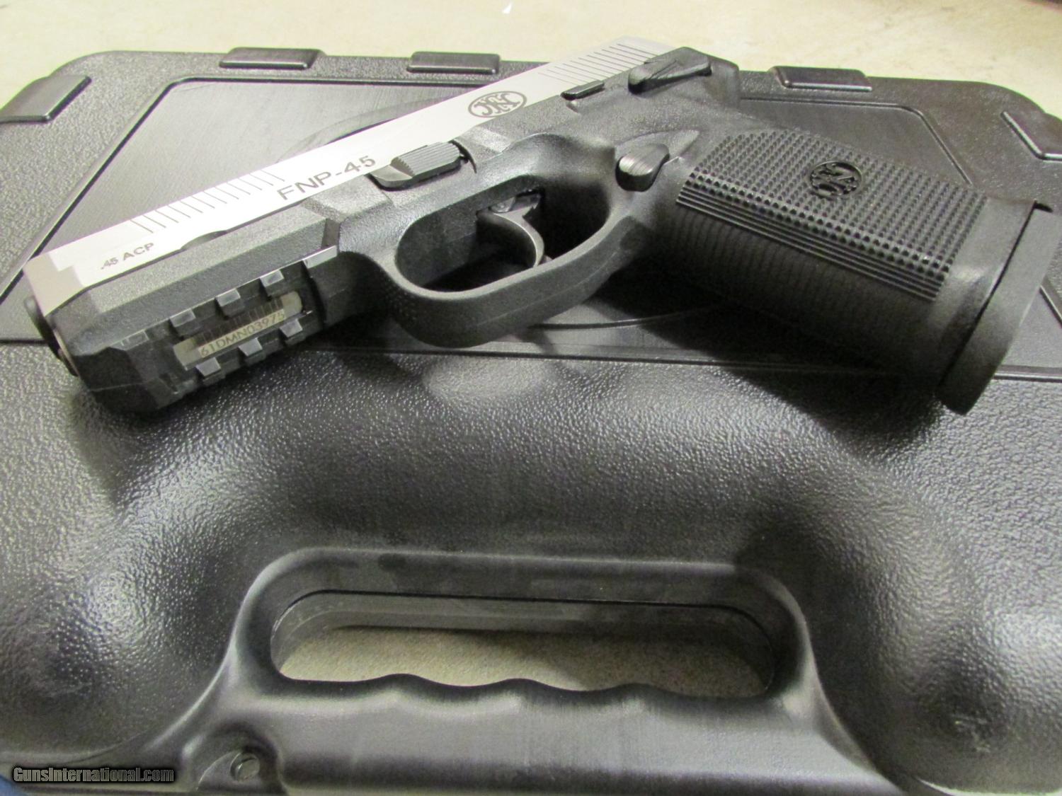 Description: Lightly Used in the Box, Ready to Ship! Buy It Now!! The FNP-45 USG features an external hammer, 4.5" hammer forged stainless steel barrel, stainless steel slide, full length guide rod, C-More Systems fixed three combat sights and a checkered polymer frame with interchangeable backstraps and an integrated accessory rail. Every FNP-45 comes standard with three magazines, a locking device and a lockable fitted hard case. This gun is used, but is still in excellent condition. The gun looks great showing little wear and only a few tiny scratches. This gun comes with the orginal case with 2 magazines as pictured. Pictures are of the actual gun and the best representation of it and its condition. Caliber: .45 ACP Barrel: 4.5" hammer forged Twist: 1:16" RH twist Capacity: (2) 14 Round Magazines Frame: Black checkered polymer frame Slide: Matte stainless Steel Sights: C-More Systems fixed 3 combat sights Height: 6.33" Width: 1.58" Overall Length: 7.85" Weight: 32.4 oz. (unloaded) Other Features:
