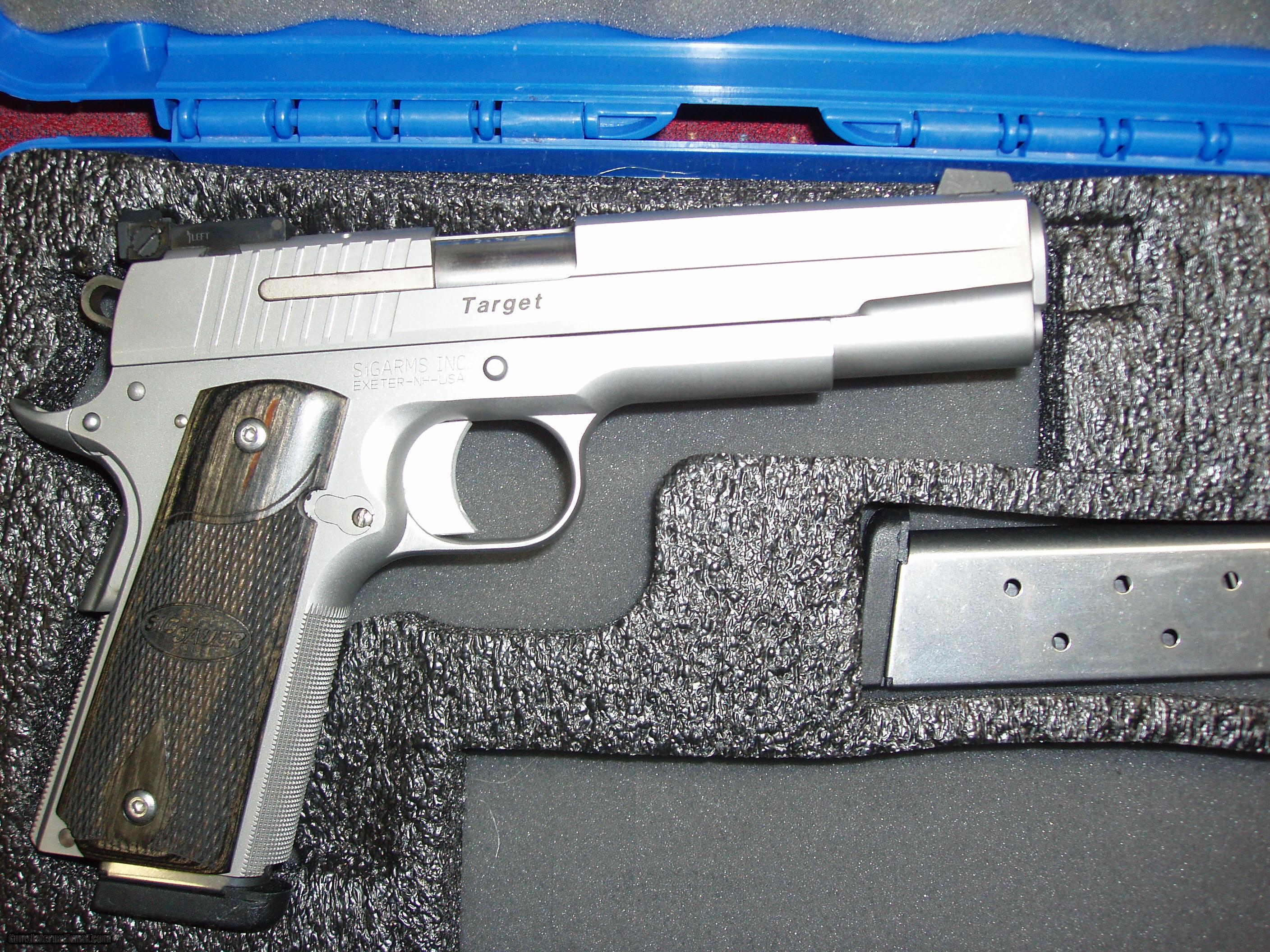 Description: Sig Sauer Full size 1911 GSR Stainless Target model .45 ACP. Excellent condition, lightly used, has target sights and original grips,2 mags & original box. No marks or scratches. Very accurate, but used very little. I'm in NY State so FFL to FFL only.$35.00 transfer SERIOUS BUYERS ONLY please. No Trades Thanks. SOLD Manufacturer: SIG Sauer Model: GSR Target Caliber Info: .45 Condition: Perfect Metal Condition: Perfect Wood Condition: Perfect Bore Condition: Perfect Finish: Stainless Sights: AdjustableTarget Manufacture Date: April 2008 Case: YES |