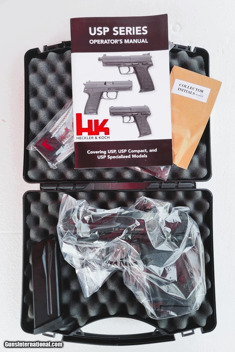 Description: NIB Unfired one owner German made H&K USP Compact chambered in .45ACP. This is a new old stock pistol that was purchased new and stored away unfired. All polymer and metal finishes are 100% factory and as new. No scratches on bbl or ejector, no burnishing on any metal internals including ramp and throat. The pistol has a manual safety and decock lever. The plastic case shows storage wear. The pistol is as issued by the factory with 2 8rd magazines, 3 dot white sights, case numbered to the gun and all paper, spent factory test fire case and safety lock. The pistol has the internal lock and comes with key. It is a DAO action, ready to go and priced to sell. Please review and the images and email with any questions you might have. I am a licensened FFL dealer with many years experience selling nationally, internationally and on the Internet. Please read all sale, payment and shipping info as found below. Shipping to your FFL in the lower 48 is $35 - insurance is EXTRA but highly RECOMMENDED. Absolutely NO California, New York, New Jersey or Maryland Sales. No exceptions. No face to face sales - must ship to your FFL - NO EXCEPTIONS- I ship USA only - I live in a remote area and cell service is spotty. The best way to contact me is using the Guns International email that you can access at the upper right panel that says: Email Seller. NO TRADES. ******IMPORTANT**** PLEASE REMEMBER TO REFERENCE MY INVENTORY NUMBER THAT WILL INDENTIFY THE FIREARM YOU ARE WANTING TO PURCHASE. Accepted methods of payment are USPS Money order or cashier's check drawn on your bank. NO CREDIT CARDS Please include a copy of your dealer's FFL with payment. Please contact me with any questions you might have. Mail payment and FFL to: Gary Martin 601 Hale St. Llano, TX 78643 SOLD Handgun Caliber: .45 ACP (.45 Auto) Manufacturer: Heckler & Koch Model: USP Compact Condition: Factory New Metal Condition: Factory New Bore Condition: Factory New Action: Double Finish: Blue Sights: 3 Dot White Case: Factory |