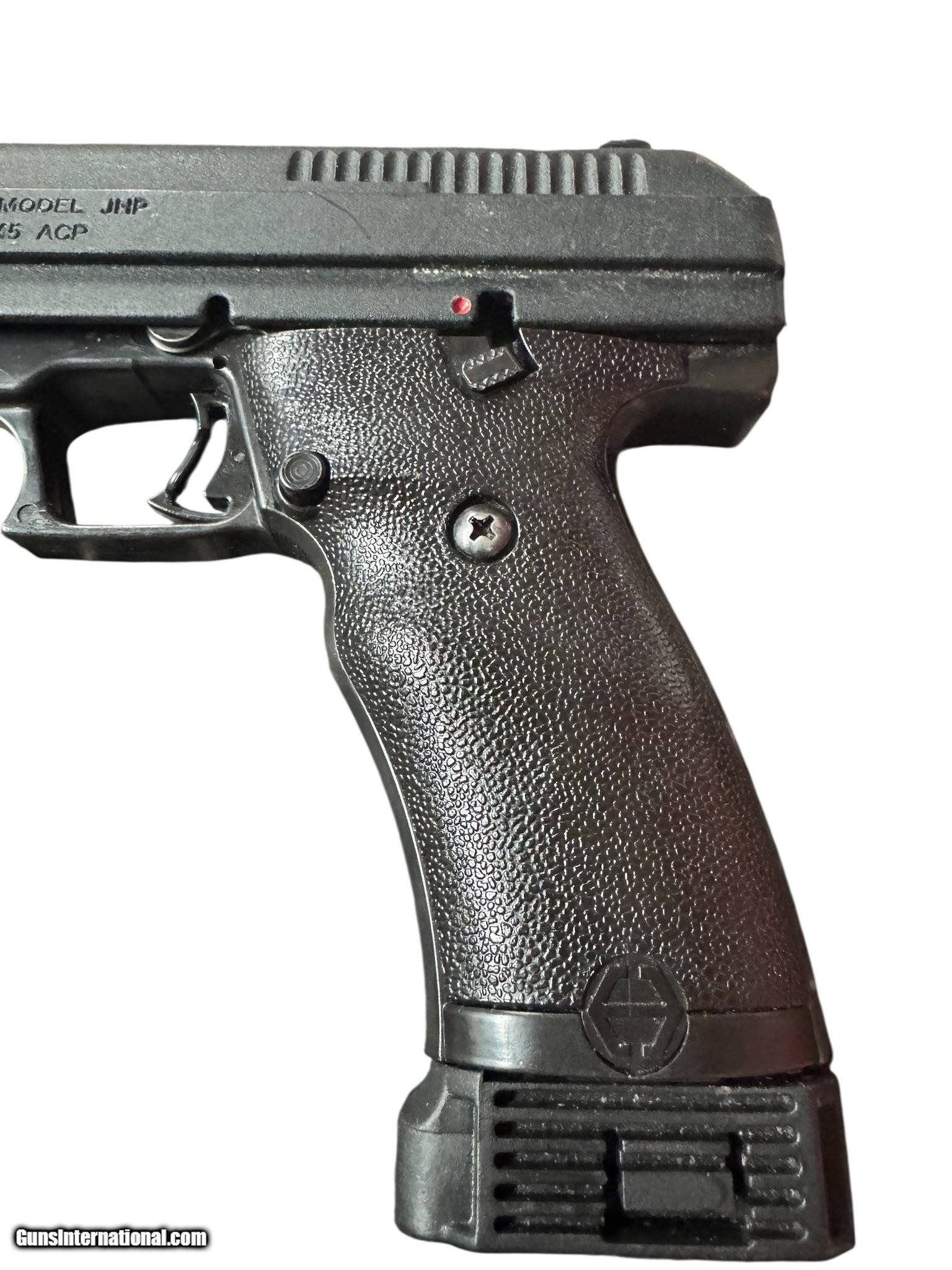 Description: Guns Listing ID: 590511 The Hi-Point JHP 45 Semi-Auto Pistol brings the power of .45 ACP to your hands. The JHP frame is constructed of high-impact polymer. The frame safety is right-hand only. The polymer grip panels feature an easy-grip finish. Three-dot sights come on the pistol and a ghost-ring-style rear peep sight is included. You‚ll get last round lock back and a magazine disconnect safety, which prevents the gun from firing if you eject the magazine. Earn some bragging rights with this large-framed offering from Hi-Point. Chambered in .45 ACP High-impact polymer frame Frame safety Polymer grips with easy-grip finish 3-dot adjustable sights Finished in black, in good condition, one magazine included with purchase. Manufacturer: HI-POINT Model: JHP Caliber Info: .45 ACP Condition: Used - Non-Certified Barrels: 4.5" BARREL Action: SEMI AUTOMATIC Finish: black Price: $170.99 Contact Seller |