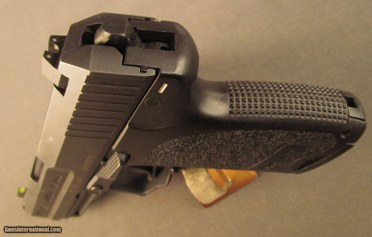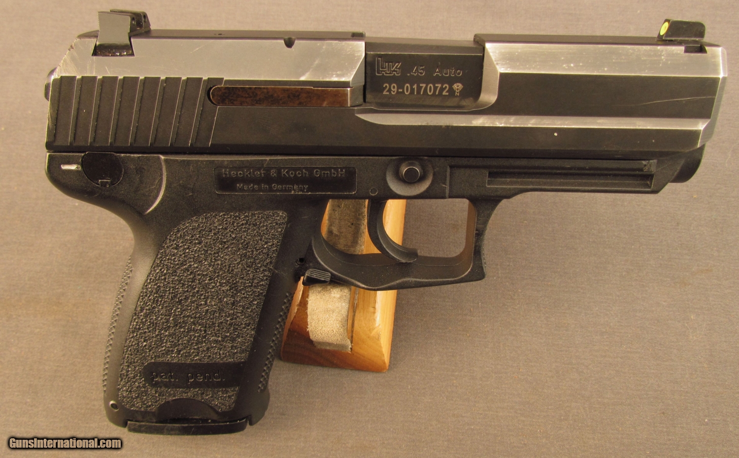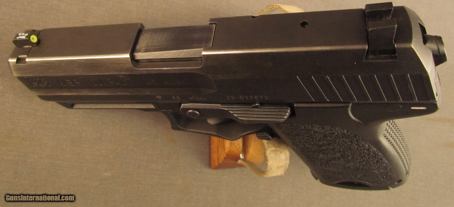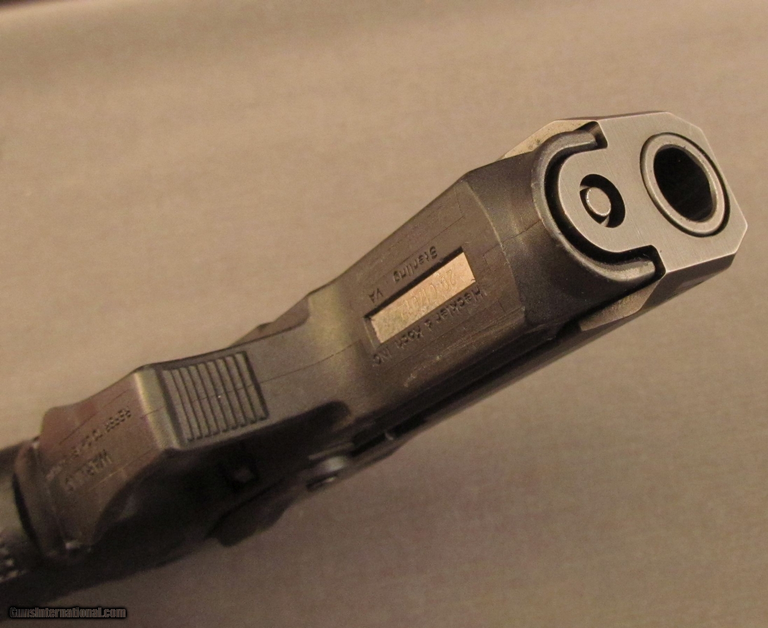 Description: Serial #29-017072, .45 ACP, 3 1/2” barrel with an excellent, bright bore. This modern polymer frame pistol features the Law Enforcement DAO trigger and has 80-85% of the original matte blue finish remaining on the slide which also exhibits moderate holster wear along the high edges, as well as some heavier scratches on the right rear of the slide. The pistol comes with three OEM magazines, a black plastic pancake-style holster, and original gray HK case with papers. This is a nice big bore carry gun that has the desirable LEO trigger and rates very good plus condition overall. FFL SOLD Manufacturer: HK Model: USP Serial Number: 29-017072 Caliber Info: .45 ACP Gauge Info: .45 ACP |