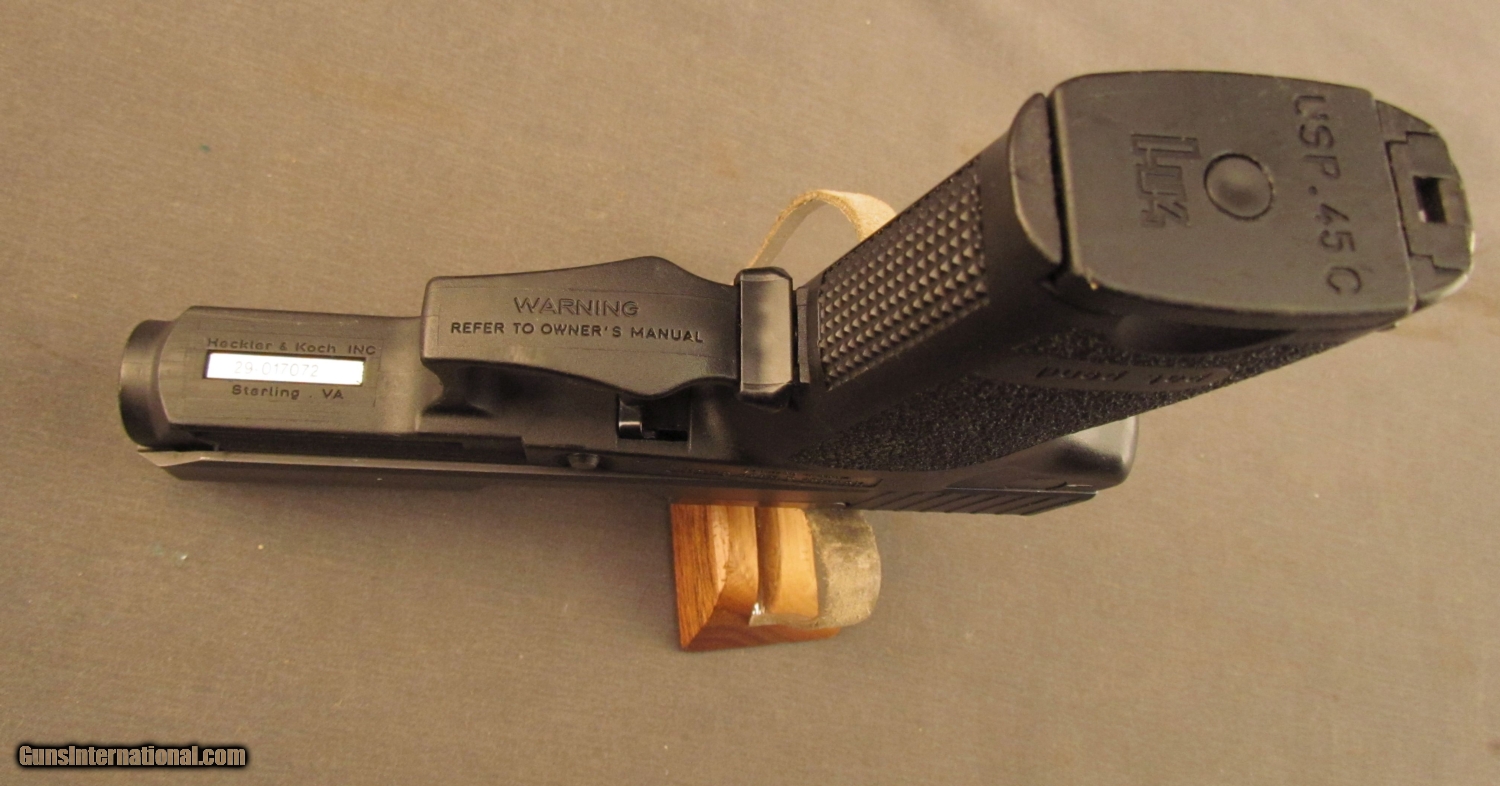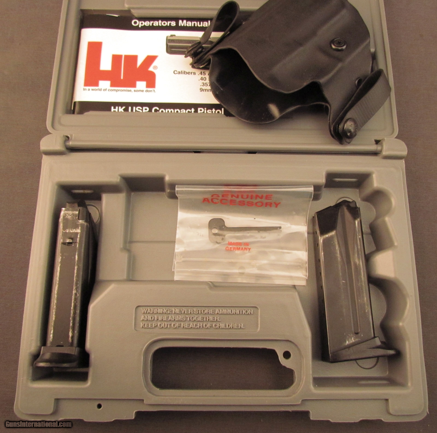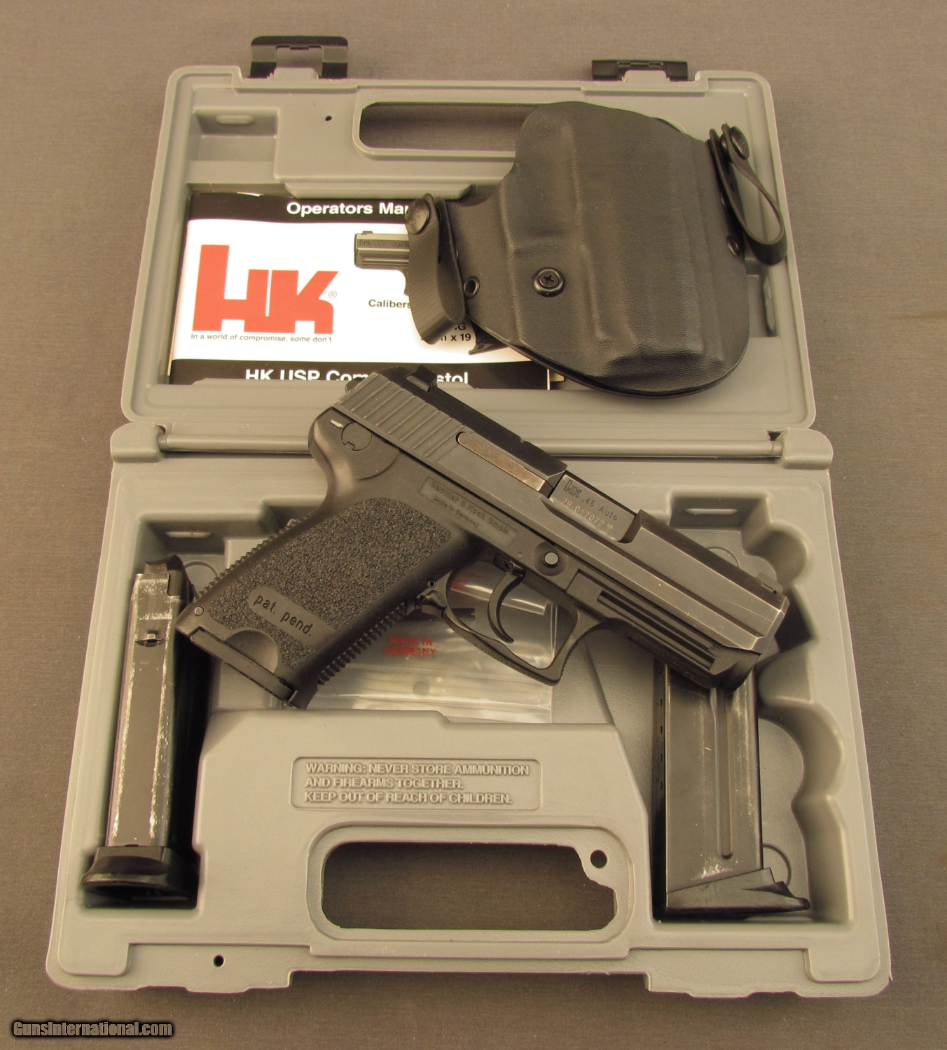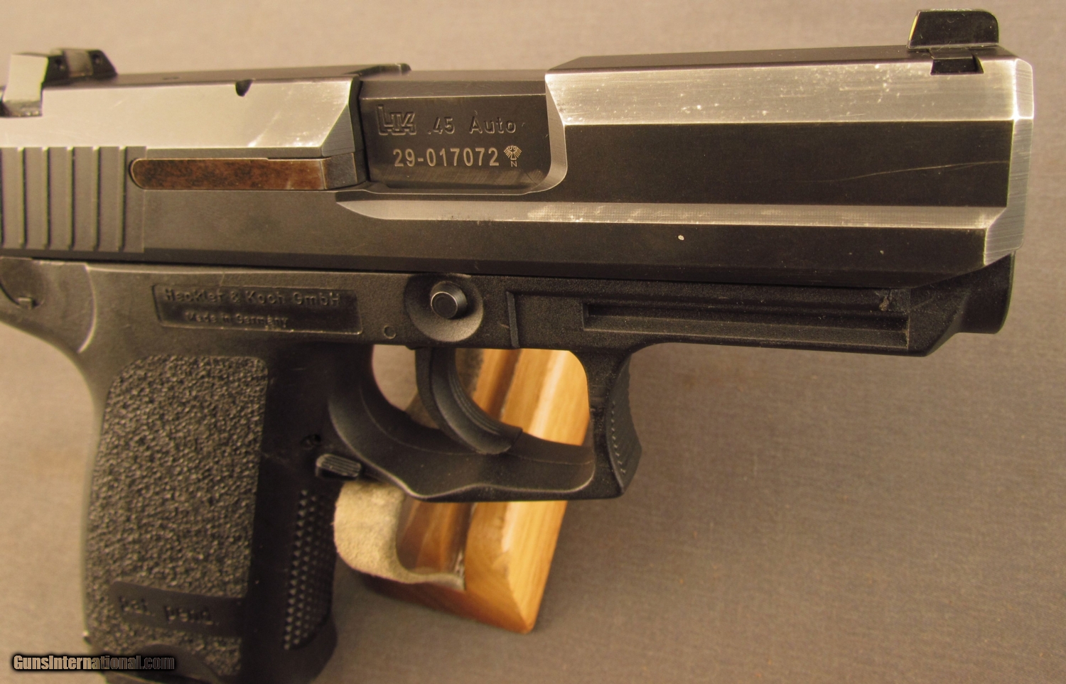 Description: Serial #29-017072, .45 ACP, 3 1/2” barrel with an excellent, bright bore. This modern polymer frame pistol features the Law Enforcement DAO trigger and has 80-85% of the original matte blue finish remaining on the slide which also exhibits moderate holster wear along the high edges, as well as some heavier scratches on the right rear of the slide. The pistol comes with three OEM magazines, a black plastic pancake-style holster, and original gray HK case with papers. This is a nice big bore carry gun that has the desirable LEO trigger and rates very good plus condition overall. FFL SOLD Manufacturer: HK Model: USP Serial Number: 29-017072 Caliber Info: .45 ACP Gauge Info: .45 ACP |
