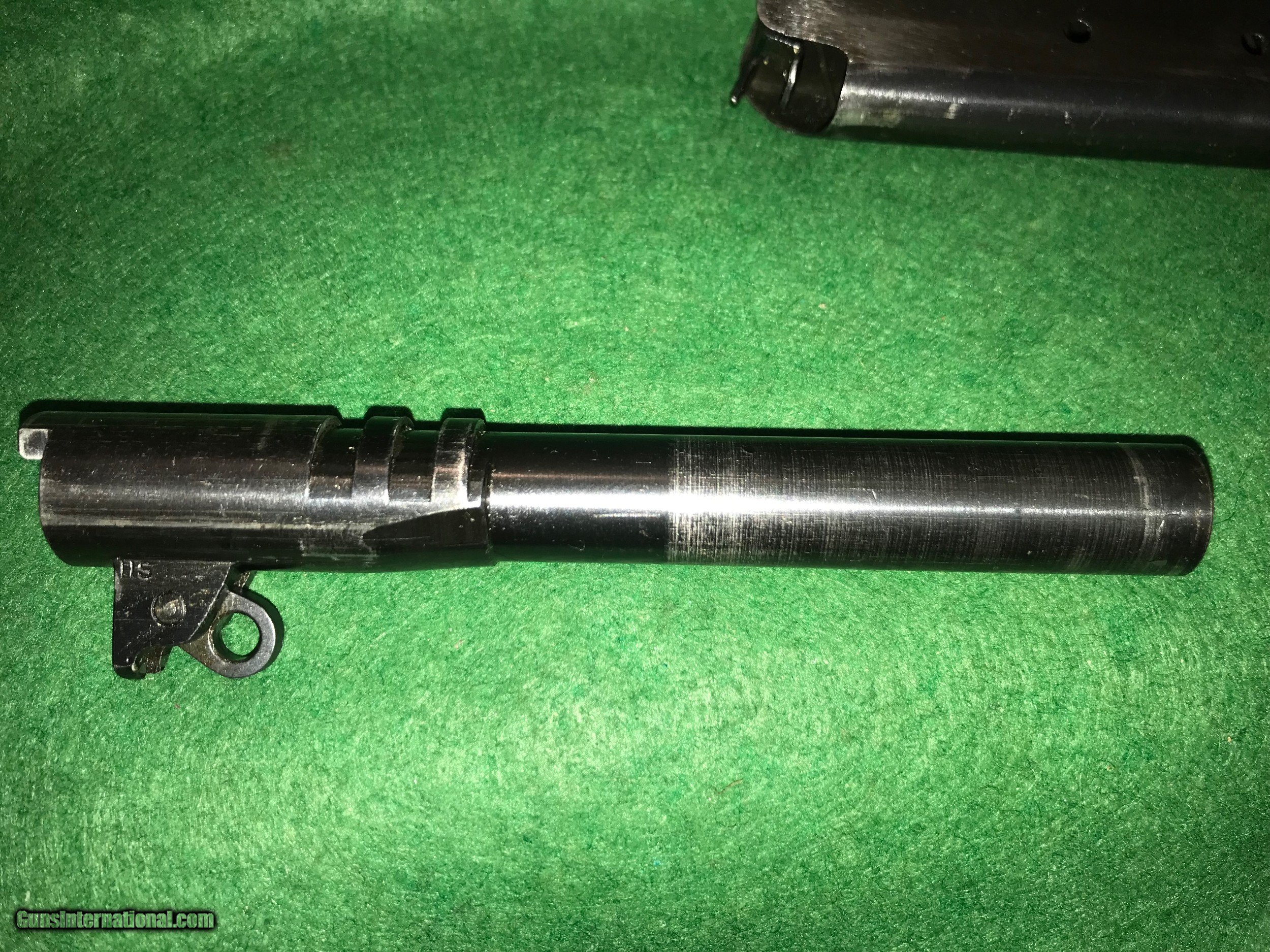 Description: Ithaca 1911A1 99% Original Finish. Serial #1209911. This one falls into the serial block where both the slide and frame were marked with M 1911 A1 U.S. ARMY. The barrel is a "P" Proofed High Standard. Bore is bright. This one went to the Navy in 1943. Great example of a tough to find variant of the Ithaca Production! Any questions please ask. SOLD |