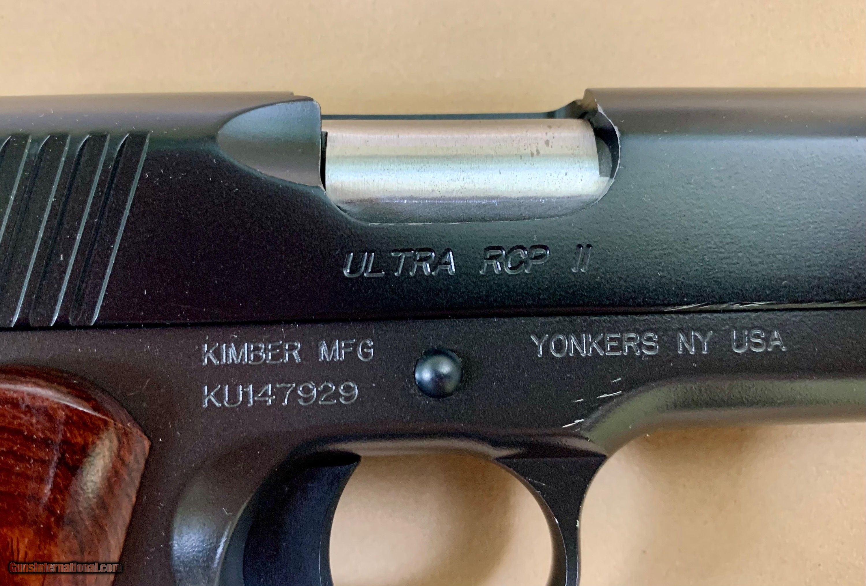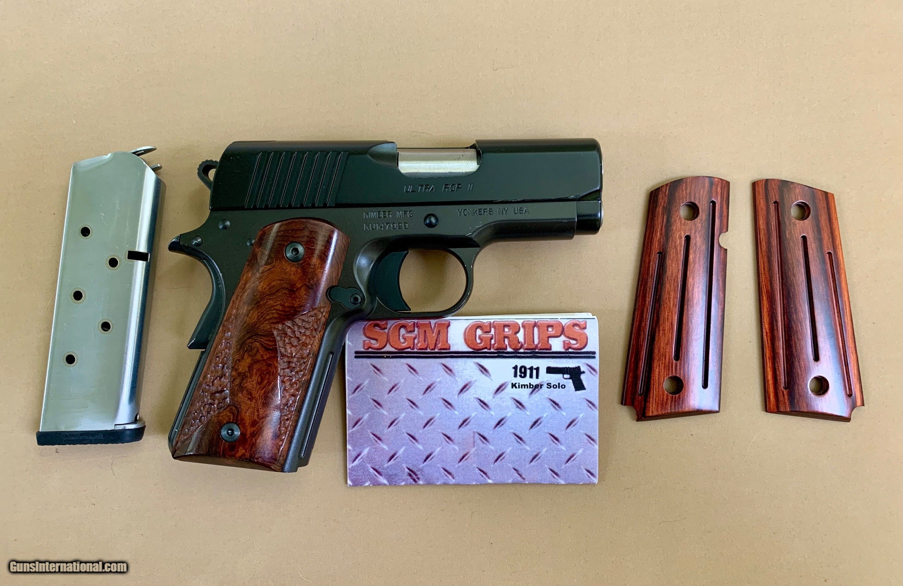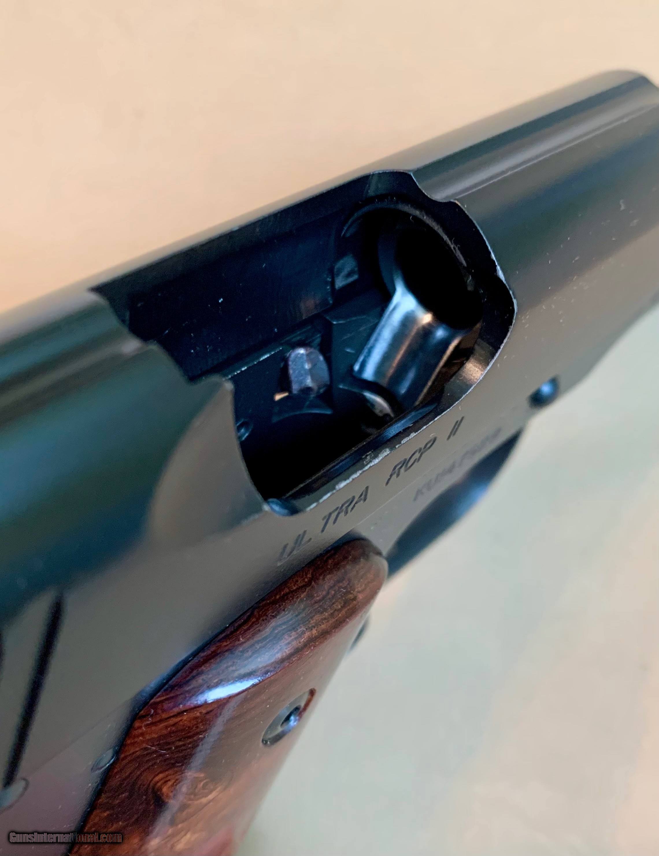 Description: This Custom Shop Ultra RCP II blends Kimber’s precision machining with a purpose-built concealed-carry profile. A lightweight alloy frame, factory Carry Melt de-horning, and integral trench or "gutter" sight eliminate sharp edges, while the match-grade bull barrel and tuned trigger keep accuracy at the forefront. It comes with the original thin, fluted rosewood grips and and extra set of premium SGM grips along with a 7-round magazine. Now out of production, this Ultra RCP II combines Custom Shop craftsmanship and pedigree, scarce availability (limited production), and practical defensive features, which are all qualities that appeal equally to collectors and those seeking a refined, ready-to-carry .45 ACP 1911. Condition Overall Condition: Excellent – shows some minor signs of prior use and handling. Bore Condition: Excellent – clean and shiny. Rifling Condition: Excellent – intact, well-defined lands and grooves. Specific Condition Notes: The pistol is in excellent overall condition with only minor blemishes visible on close inspection. Specifications