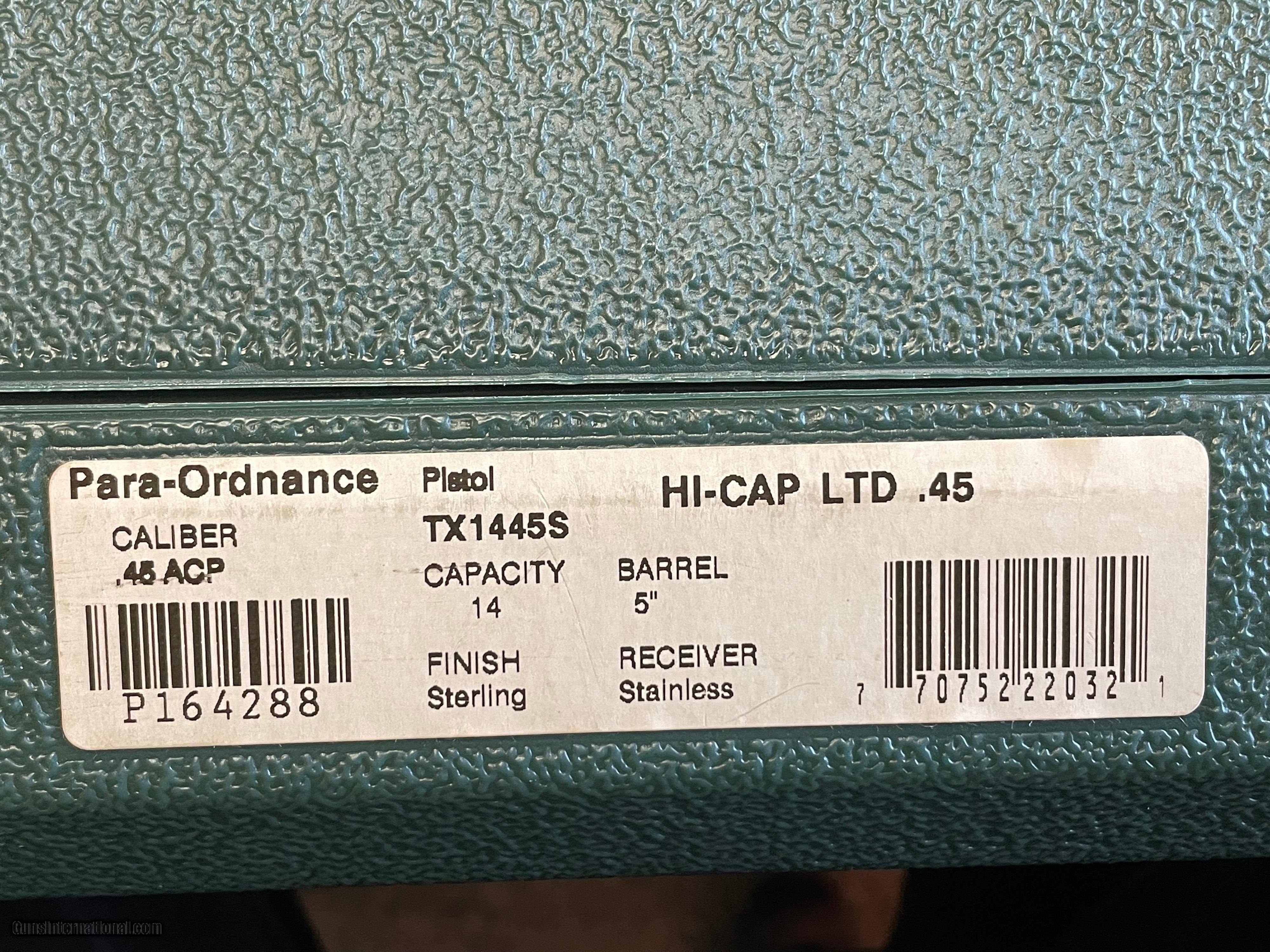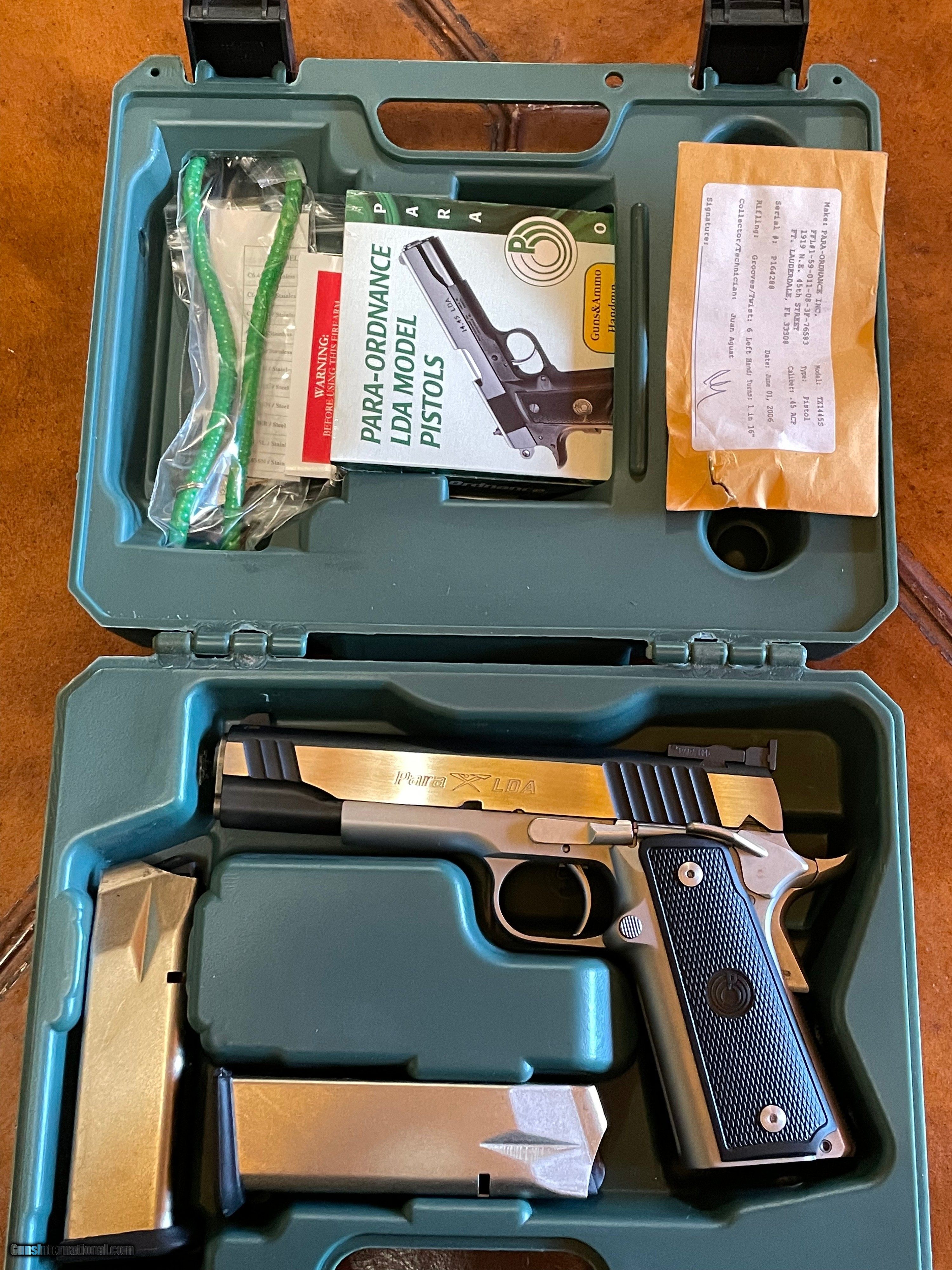 Description: SOLD This LDA (Light Double Action) Para Ordnance pistol is in excellent condition. It is the Hi Capacity Ltd 5" model in .45. Comes with two 14-round magazines, factory box, papers, and manuals. This beautiful gun has been used, but not much, showing very minimal signs of use. Owner bought it for competition shooting but never got around to it. Adjustable rear and fixed front sights. The slide is polished and the frame is matt stainless. Ideal for target shooting and home defense. I'm retired law enforcement but not a dealer, so please refer to photos to personally assess condition of this Para. Must ship to FFL. Please add $25 for shipping and insurance. SOLD Handgun Caliber: .45 ACP (.45 Auto) Manufacturer: Para-Ordnance Inc. USA Model: TX1445S Hi Cap Ltd Serial Number: P164288 Barrel Length: 5 Condition: Excellent Metal Condition: Excellent Action: Double Triggers: LDA Stock: Para Plastic Manufacture Date: 2006 Extras: 2 Hi Cap Mags/Lock/Papers Case: Factory |