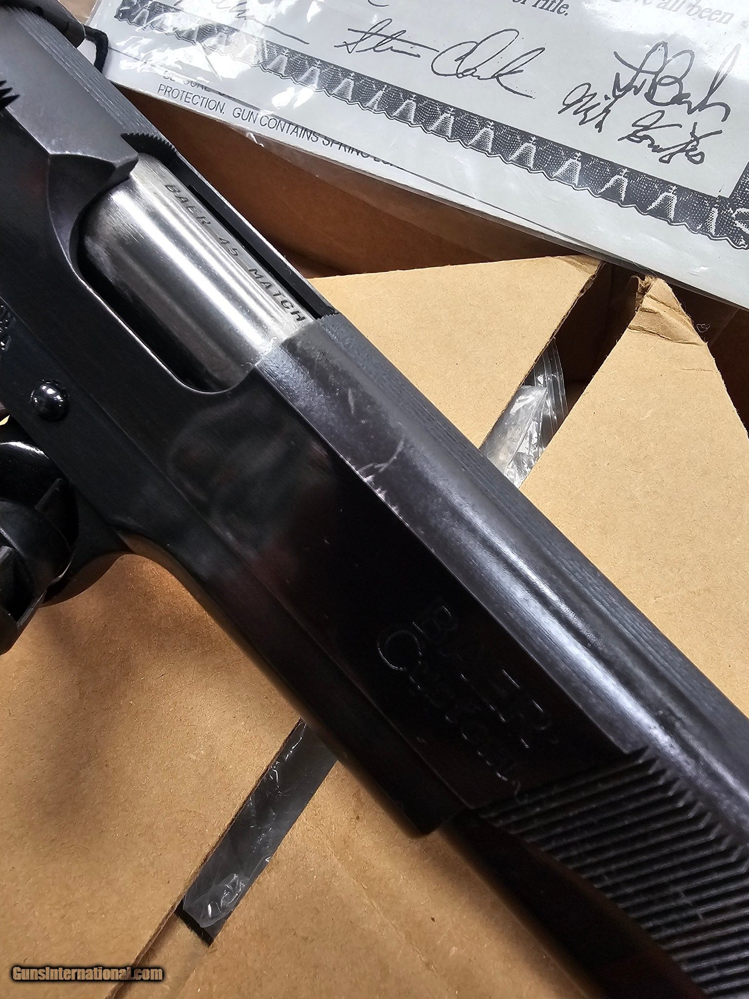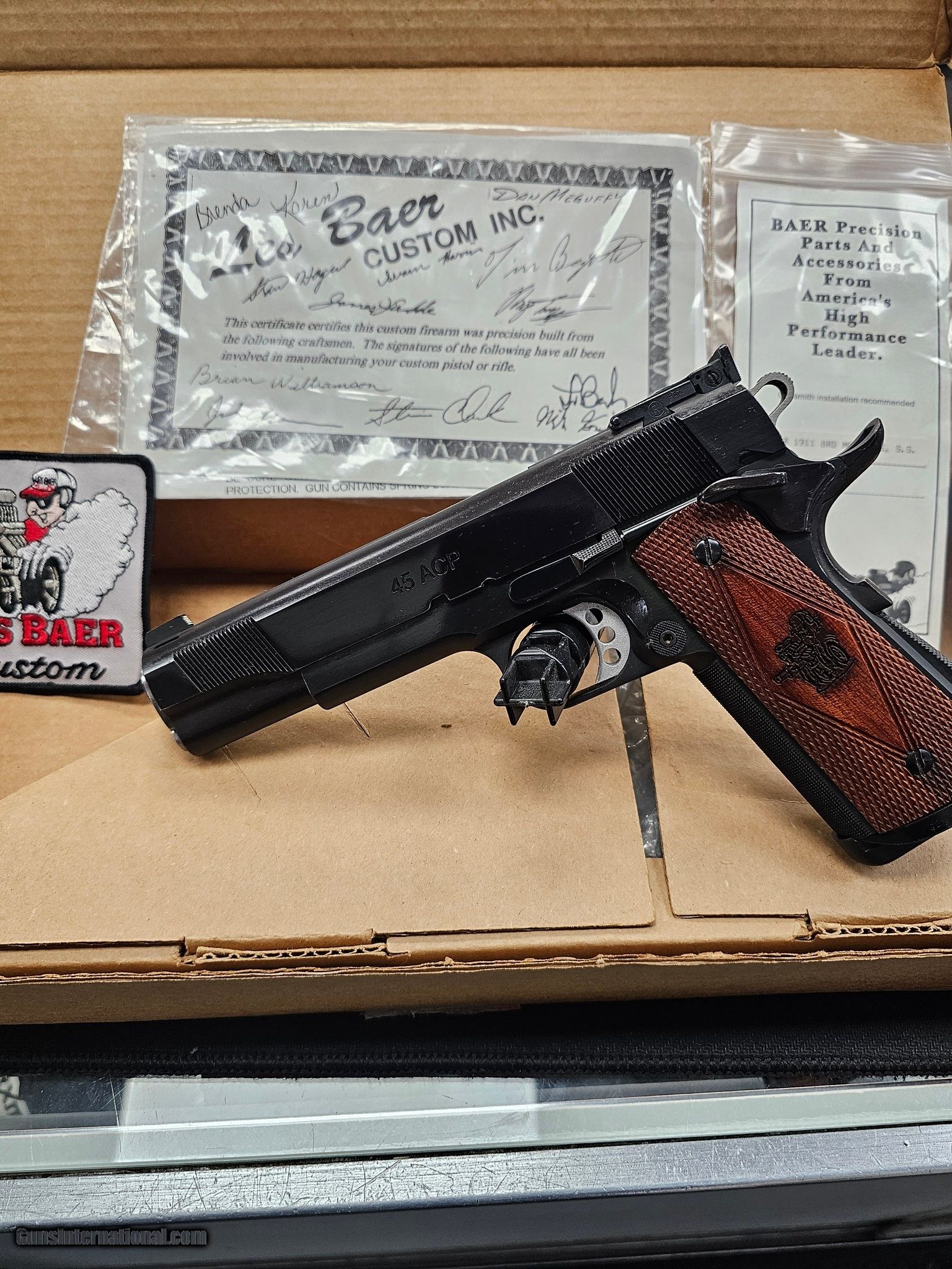 Description: Guns Listing ID: 600957 LES BAER 1911 PREMIER II MANUFACTURED 1996 (PER LES BAER). GUN IS IN NICE CONDITION WITH SOME EXPECTED WEAR, SLIGHT \"IDIOT\" SCRATCH, AND SLIGHT WEAR FORWARD OF THE EJECTION PORT. A NICE OLDER LES BAER BUILD, WITH ORIGINAL BOX, MANUAL, GUNSMITH BUILD SHEET, AND PATCH. GUN IS TIGHT, ALL INTERNALS ARE NUMBER MATCHING. 30LPI CHECKERING, AMBI SAFETY, MAG WELL, ADJUSTABLE BO-MAR SIGHT. Manufacturer: LES BAER CUSTOM, INC. Model: PREMIER Caliber Info: .45 ACP Condition: Used - Non-Certified Barrels: 5" BARREL Action: SEMI AUTOMATIC Finish: black blued Price: $2,200.99 Contact Seller |