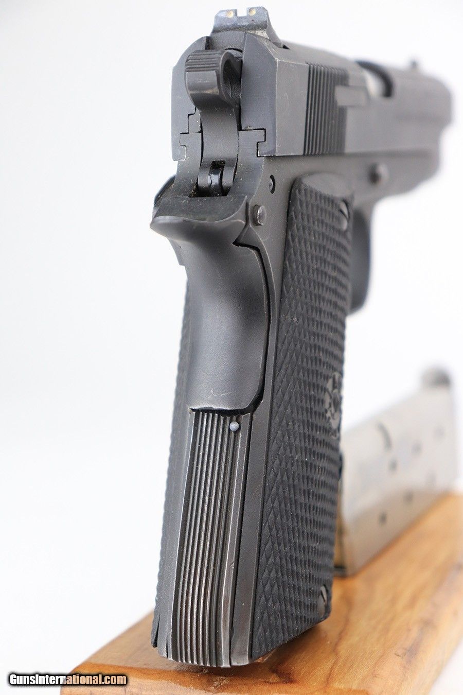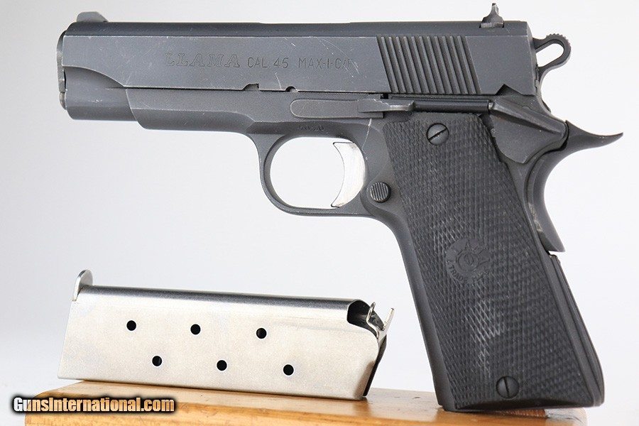 Description: This is an excellent example of a Spanish Llama MAX-I-C/F semi auto pistol, chambered in .45 ACP. It is all matching and has an import mark on the right side of the frame. It has retained about 98% of its finish. There are hints of wear on the high edges and some light surface scratches and scuffs here and there. Comes with very nice black rubber grips and one proper magazine. Excellent bore with strong rifling and some very minor fouling in the grooves. SOLD Handgun Caliber: .45 ACP (.45 Auto) Bore: 9/10 Condition: ~98% |