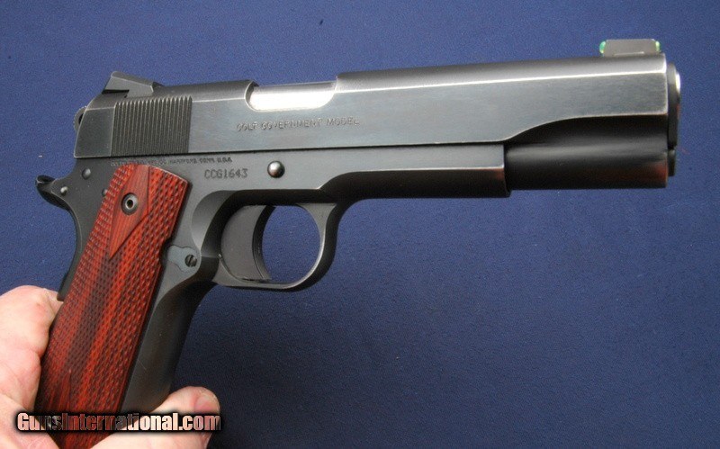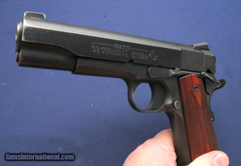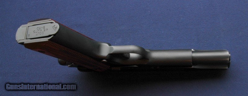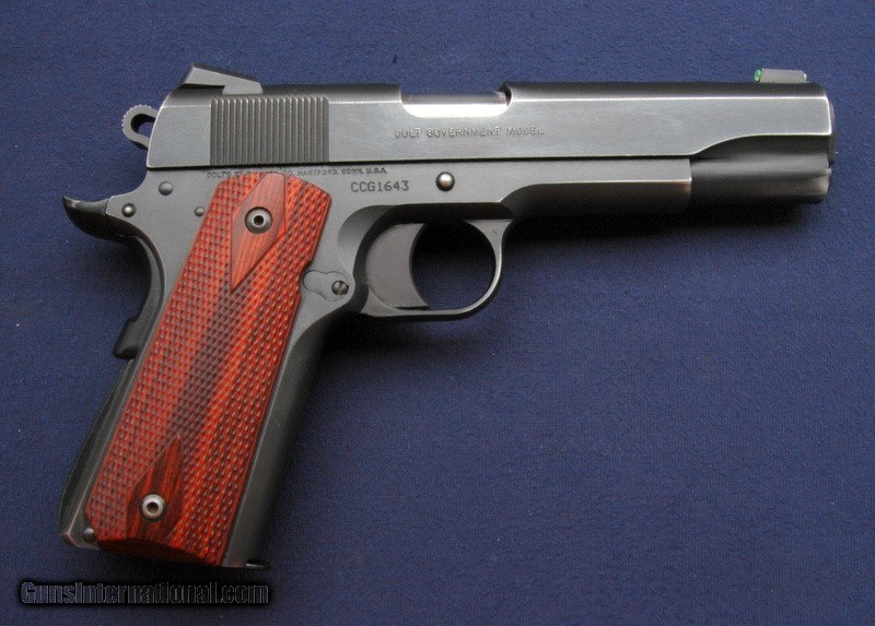 Description: Smoking deal of the day!! Fairly recent manufacture Colt Government Model 1911. This is a Series 80. The previous owner modified the gun from stock by having a beavertail safety installed, a skeletonized round hammer, Novak rear sight and Hi-Viz green front sight. Also fitted a Colt National Match barrel, arched mainspring housing, extended safety and nice double diamond cocobolo grips. Gun has some edge wear as it was carried, but otherwise it was well cared for. It has a bright, clean oiled bore and the trigger breaks crisp at about 4.5 lbs. Comes with OEM box and 2 factory magazines. Priced to sell for sure. I personally wouldn't be afraid to carry this anywhere. It is GTG. $35 shipping to the lower 48, 3% surcharge for using a CC. If you choose to pay with a personal check, we will hold the item for up to 10 days to make sure that it clears. Please expedite such pymts as we will hold an item on your word for 5 days. SOLD |