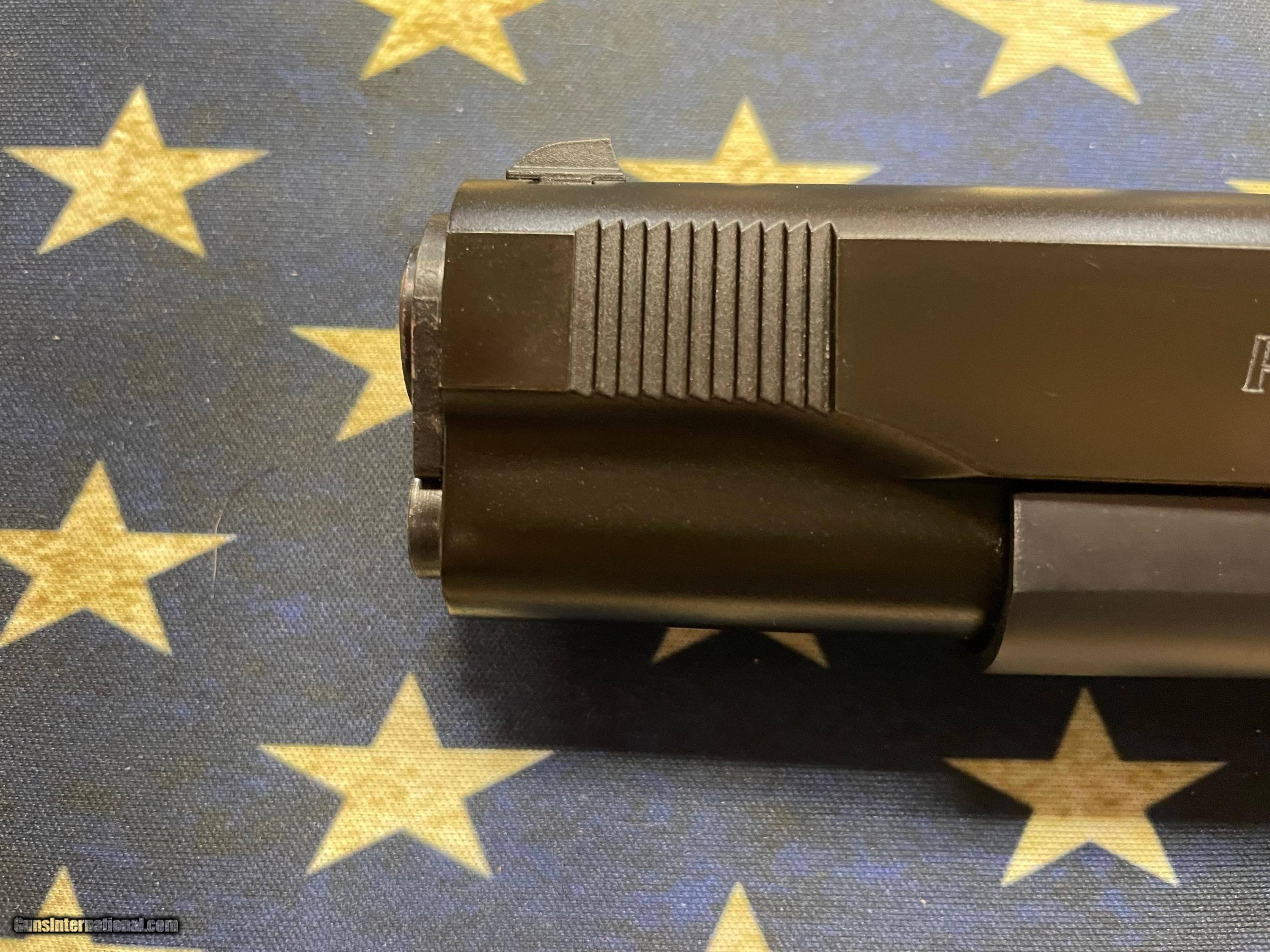 Description: The Para-Ordnance P14-45 (14.45) is an improved derivative of the successful United States Armed Forces' M1911 pistol. Created by Para-Ordnance (now Para USA) in the 1980s, it was the first ever M1911 derivative to feature a high-capacity double-stack magazine. In the late 1980s, Toronto-based Para-Ordnance started selling "high capacity conversion kits" for M1911A1 pistols, consisting of an updated frame with a thicker grip to accommodate a double-stack magazine that was supplied with the kit, which doubled M1911's 7-round magazine capacity to 14; and a new trigger assembly with suitable dimensional changes to fit into the widened grip frame. With the success of the kits, Para-Ordnance began manufacturing complete M1911 pistols of its own in 1990.[1] It was a M1911 variant that could do everything at a reasonable price.[2] In 1999, the double-action-only LDA modification, was introduced.[1] The P14-45 (later 14.45) is the standard model, and as its name hints, it is chambered in .45 ACP and has a magazine capacity of 14. Other versions include P16-40 (16.40) chambered .40 S&W and features a 16-round magazine, and P18-9 (18.9) which is chambered in 9×19mm Parabellum and features an 18-round magazine. The Expert is the basic model of 14.45, it features a 5" match-grade barrel, beavertail grip safety, polymer grips and is available in black nitride or stainless finish.[3][4] The Black Ops is the tactical model, differing from the Expert by having a ramped barrel, integral accessory rail, Trijicon Tritium night sights, ambidextrous thumb safety, VZ Operator Machined G10 grips and is coated in IonBond PVD.[5] The Black Ops model is also available in "Recon" variant with a 4.25" barrel, and Combat variant with high-profile sights and a 5.5" barrel. The Pro Custom is the competition model. It features a match-grade ramped barrel, adjustable sights, ambidextrous thumb safety, and like Black Ops, has G10 grips and coated in IonBond SOLD Handgun Caliber: .45 ACP (.45 Auto) Manufacturer: Para Ordnance Model: 14-45 Condition: like new |