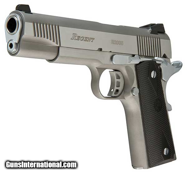 Description: Regent Series 1911 R200S .45ACP R200S Stainless The Regent R200S comes equipped with the same quality as the R100, but with a stainless finish, serrated slide, ventilated trigger, and hammer, a beavertail safety, combat 3- sight system and an extended thumb safety. It is an affordable semi-automatic 1911 pistol built with a level of quality that you can customize. The R200S is a rendition of the M1911A1 that is visually faithful to the original design. It has a spur hammer, M1911A1-style grip safety, and arched mainspring housing. Offered in .45 ACP only, the R200S has a stainless finish and comes standard with Hogue® rubber grips. The slide is manufactured from CNC machined bar stock with a low-cut ejection port, the frame is steel investment cast, and the barrel is hammer forged stainless steel—all manufactured to ISO 9001 and NATO AQAP 120 quality standards.