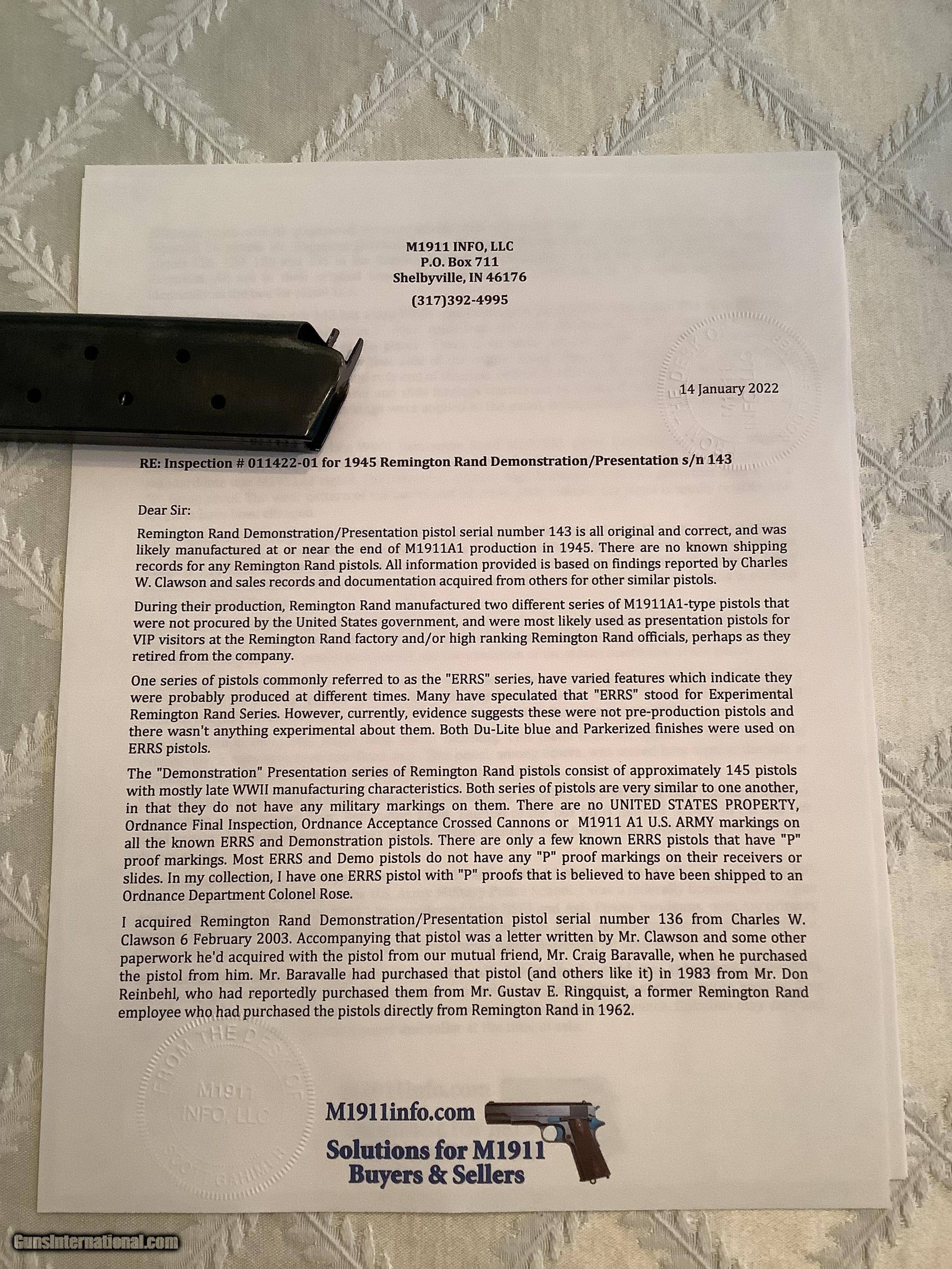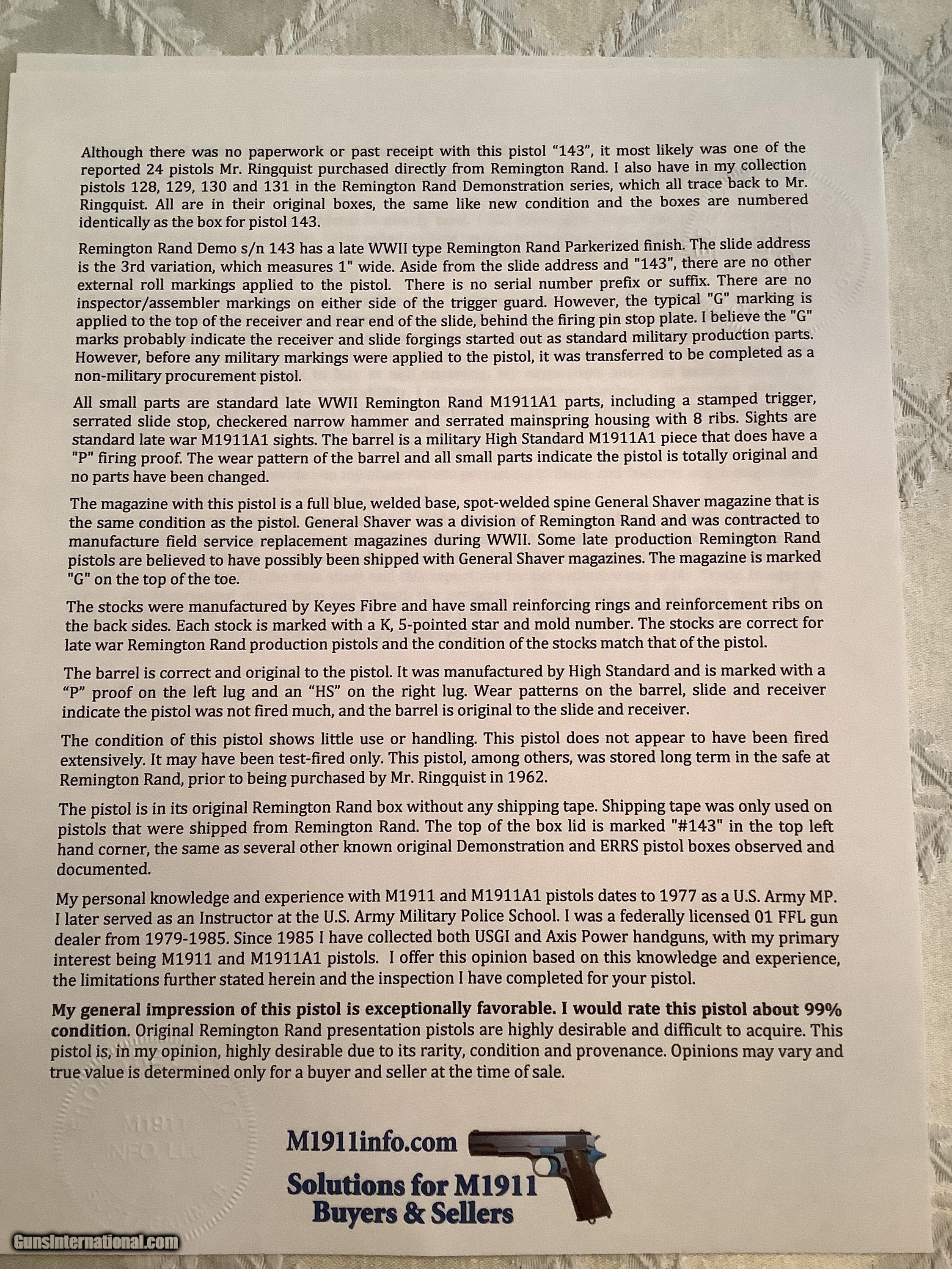 Description: For your consideration, is a very rare 100% original Remington Rand Demonstration / Presentation 1911a1 pistol, one of approximately 150 ever made, produced in 1945. Unique in that it has no outward military markings, in approximately 99 percent condition, with original craft box. Never shot by me and only taken down by me for photos. Acquired from Colt 1911 expert Scott Gahimer and will come with Scott's written assessment and CD photos, a $300 value. US postal service money orders or certified check for payment, and payment must clear my bank before shipping. Will ship from my FFL to yours, for $40.00. Domestic sales only. My FFL can send to any state where this firearm is legal to own, but it is up to buyer to ensure, in advance, that it can be shipped to their state. Thanks for looking. SOLD Handgun Caliber: .45 ACP (.45 Auto) |