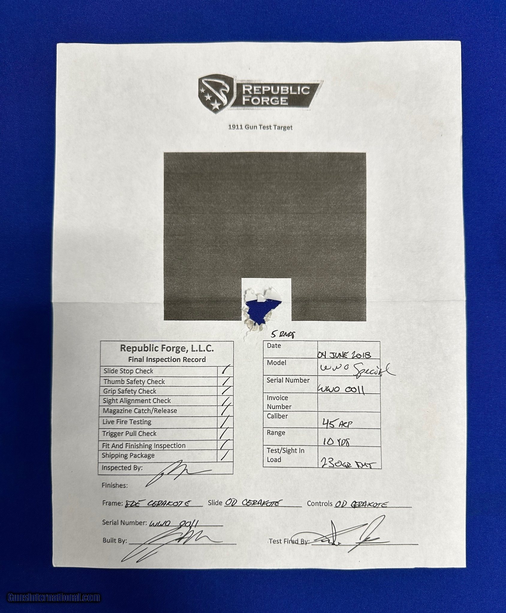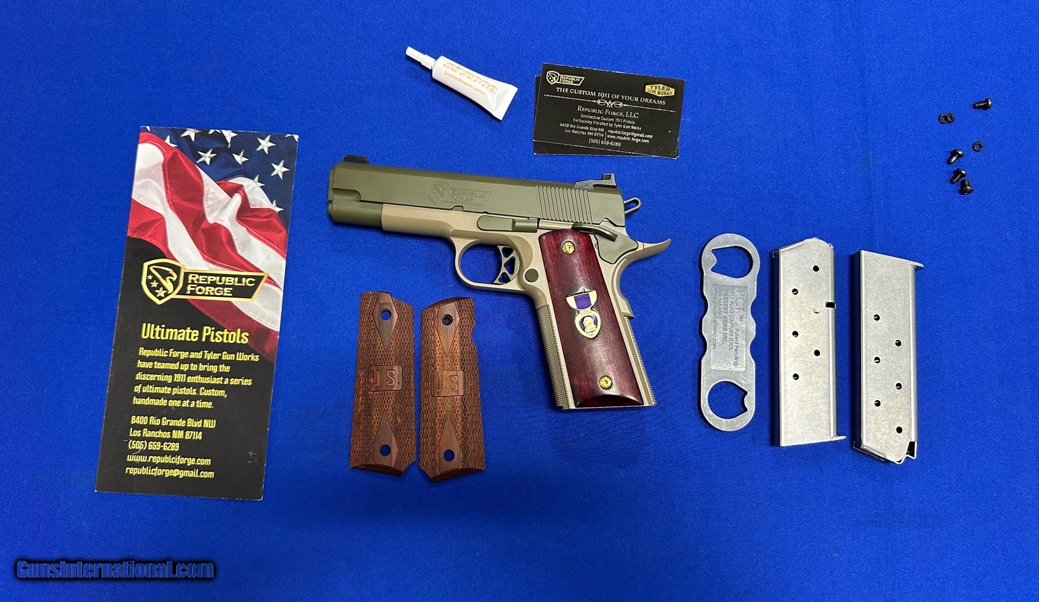 Description: Guns Listing ID: 1317926 Republic Forge builds world-class 1911 pistols made by Americans for the Republic. Our pistols are truly made in the USA, by hand, with American-made parts, one gun at a time, not by ten assembly line workers. Lots of rounds are fired through each gun to make sure everything functions properly. Included is a target from this first test firing to show you the incredible accuracy of our 1911s.. Republic Forge is a high end custom 1911 manufacturer that specializes on one off custom builds. This model is the “Purple Heart” Edition. This “commander” length 1911 boasts of custom hand fitting, two tone cerakote, match fitted bushing, Purple Heart medallion grips, US grips, high ride beavertail, 20 LPI checkering, straight 8 night sights, fusion match barrel, single side thumbsafety, 2 seven round magazines. This is an outstanding high end 1911 that was made with pride in the USA. Features include : Chambered in .45 ACP MAGS INCLUDED- (2) 7rd Steel Mag Straight 8 Republic Forge tritium sights PISTOL SIZE- Commander 4.25” barrel Overall Length: 7.75” Height: 5.5” Width: 1.25” Weight (Unloaded): 33 oz. TRIGGER ACTION- Single action GRIP TYPE- Wood, 2 sets, Purple Heart and US BARREL MATERIAL- Stainless Steel FRAME FINISH- FDE FRAME MATERIAL- steel SLIDE FINISH- Army green SLIDE MATERIAL- steel Includes factory case and 2 mags SOLD Manufacturer: REPUBLIC FORGE Model: WWO Caliber Info: .45 ACP Condition: Used - Non-Certified Barrels: 4.25 BARREL Finish: TWO-TONE |