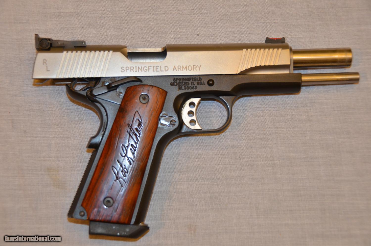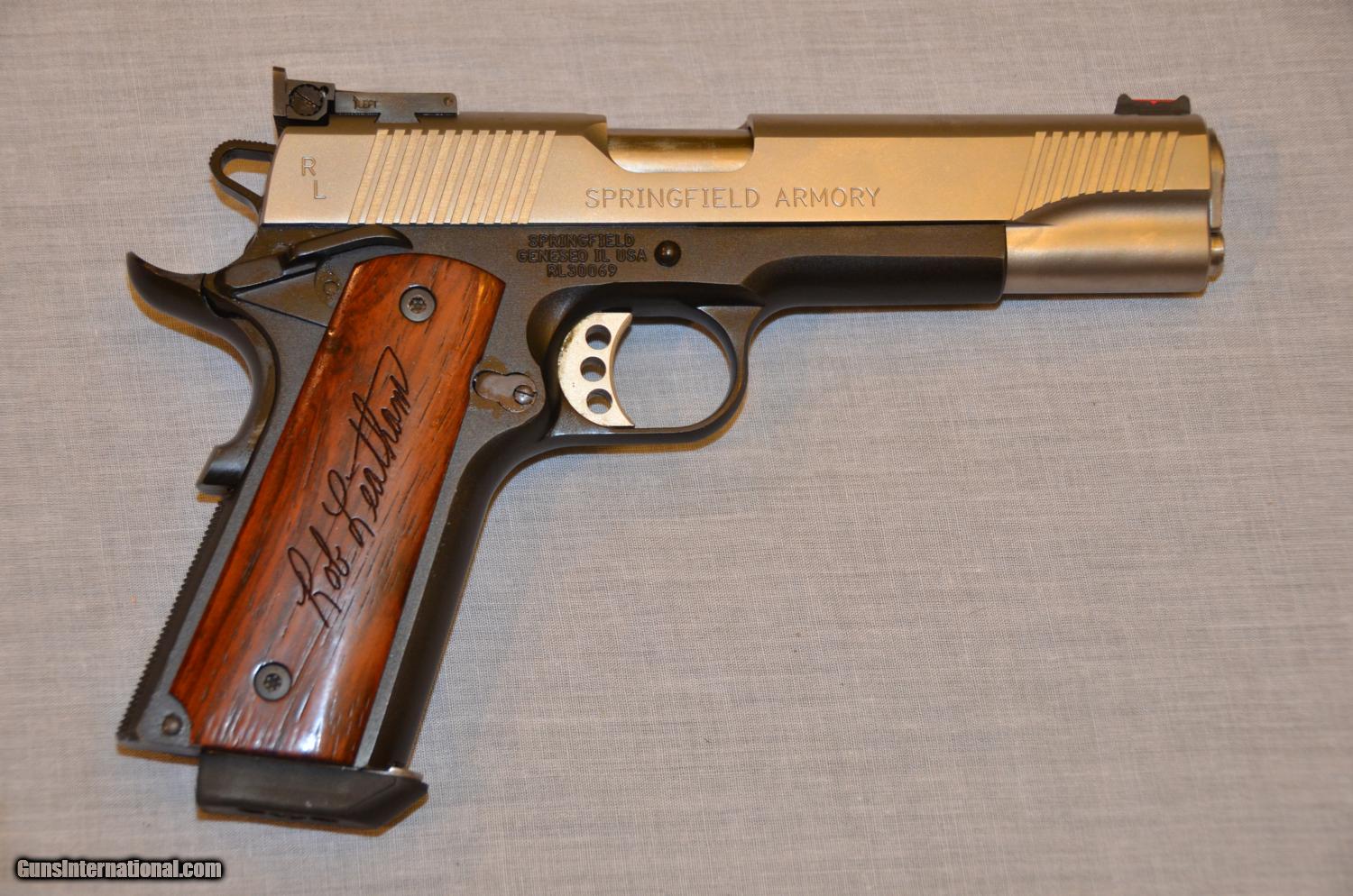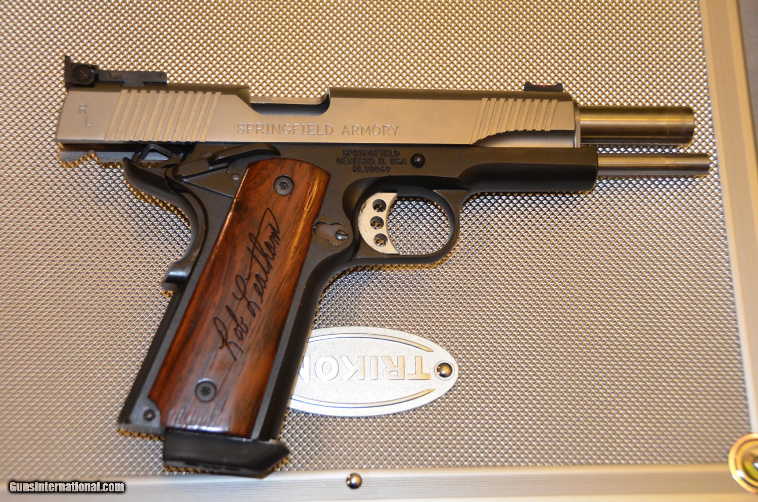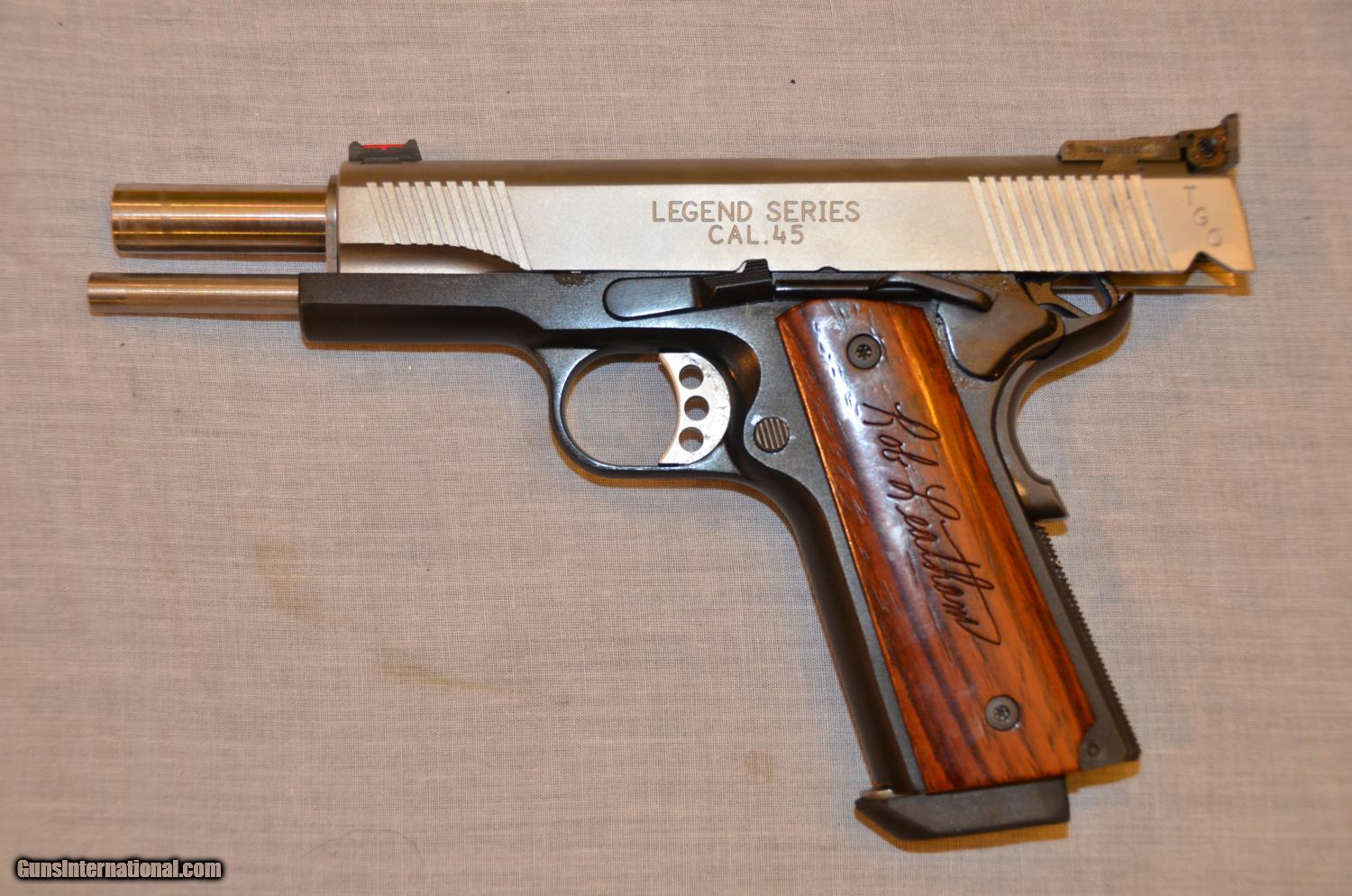 Description: This is a very rare Legend Series Rob Leatham 1911 TGOIII 45 ACP pistol Springfield Armory Custom Shop. It includes a fine case, 4 magazines, extra grips, both a fluorescent green and fluorescent red front sight, a letter from Rob Leatham, a photo and a certificate of authenticity. The pistol has a fine adjustable rear sight and fires both lead and FMJ ball rounds easily and accurately. The pistol has no damage or scratches. This is a very nice pistol and much better than a kimber. Pistol has fired approximately 1,000 rounds. Still very tight and accurate. The frame is aluminum and the slide is stainless steel. Shipping is $50. I was offerred $1800 for the pistol earlier in the year but I didn't take it. The blue book is $2200. Now I am desperate for money to return to Africa. My user name on is "Ek Mis Afrika." I am trying out Gunsinternational for the first time. SOLD |