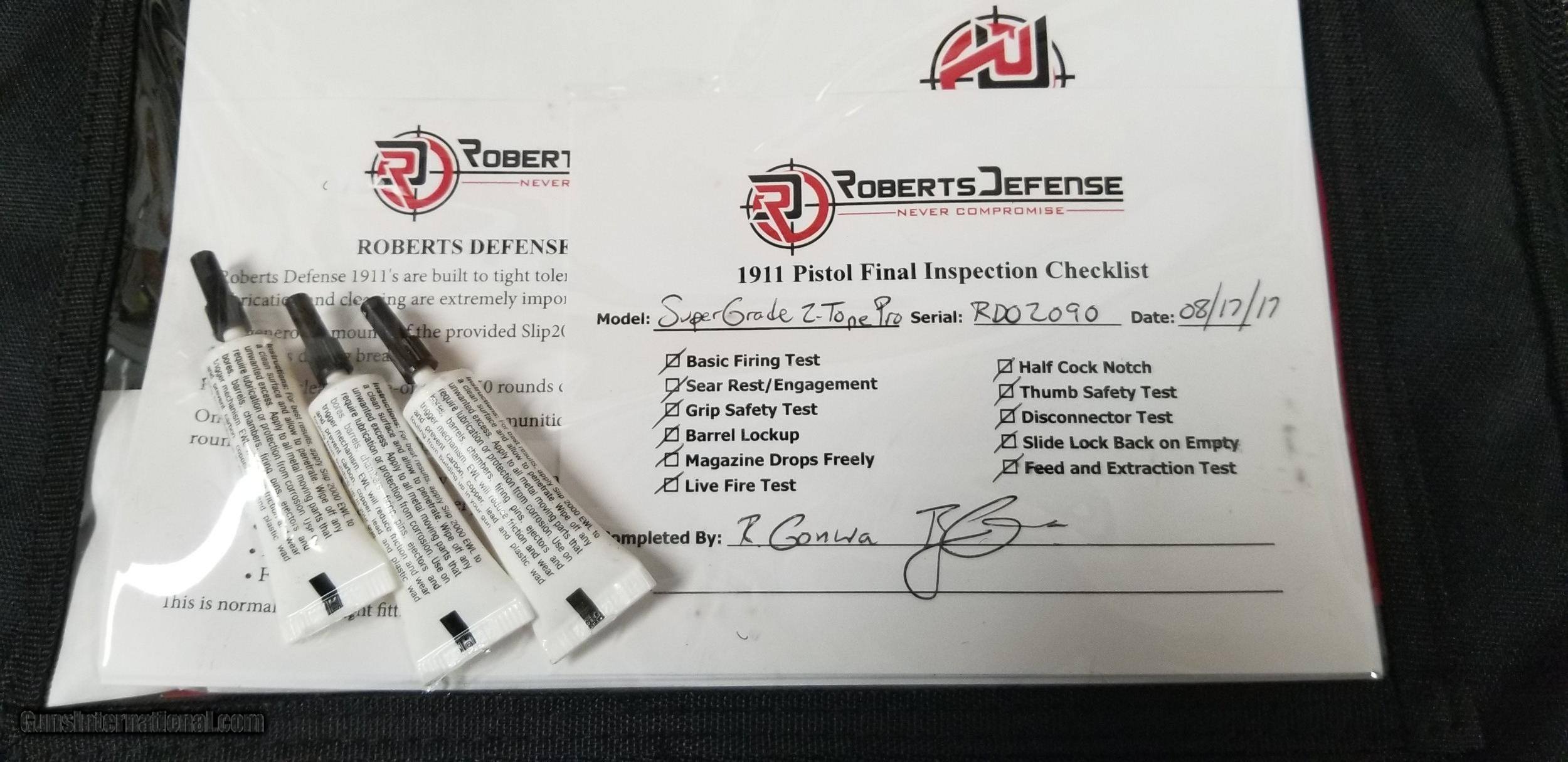 Description: For sale is a new in the case Roberts Defense Super Grade Two Tone Pro 45 acp 1911. It has a 5 inch barrel and comes with everything seen including an extra mag. These were made in Oshkosh Wisconsin and are extremely accurate and reliable. This gun is on sale and priced to move quickly. INSURED SHIPPING TO LOWER 47 IS $35. 2% FOR CARD PAYMENTS (GLOCK, SMITH & WESSON, COLT, SPRINGFIELD) SOLD Handgun Caliber: .45 ACP (.45 Auto) Manufacturer: ROBERTS DEFENSE Model: SUPER GRADE PRO Barrel Length: 5 |