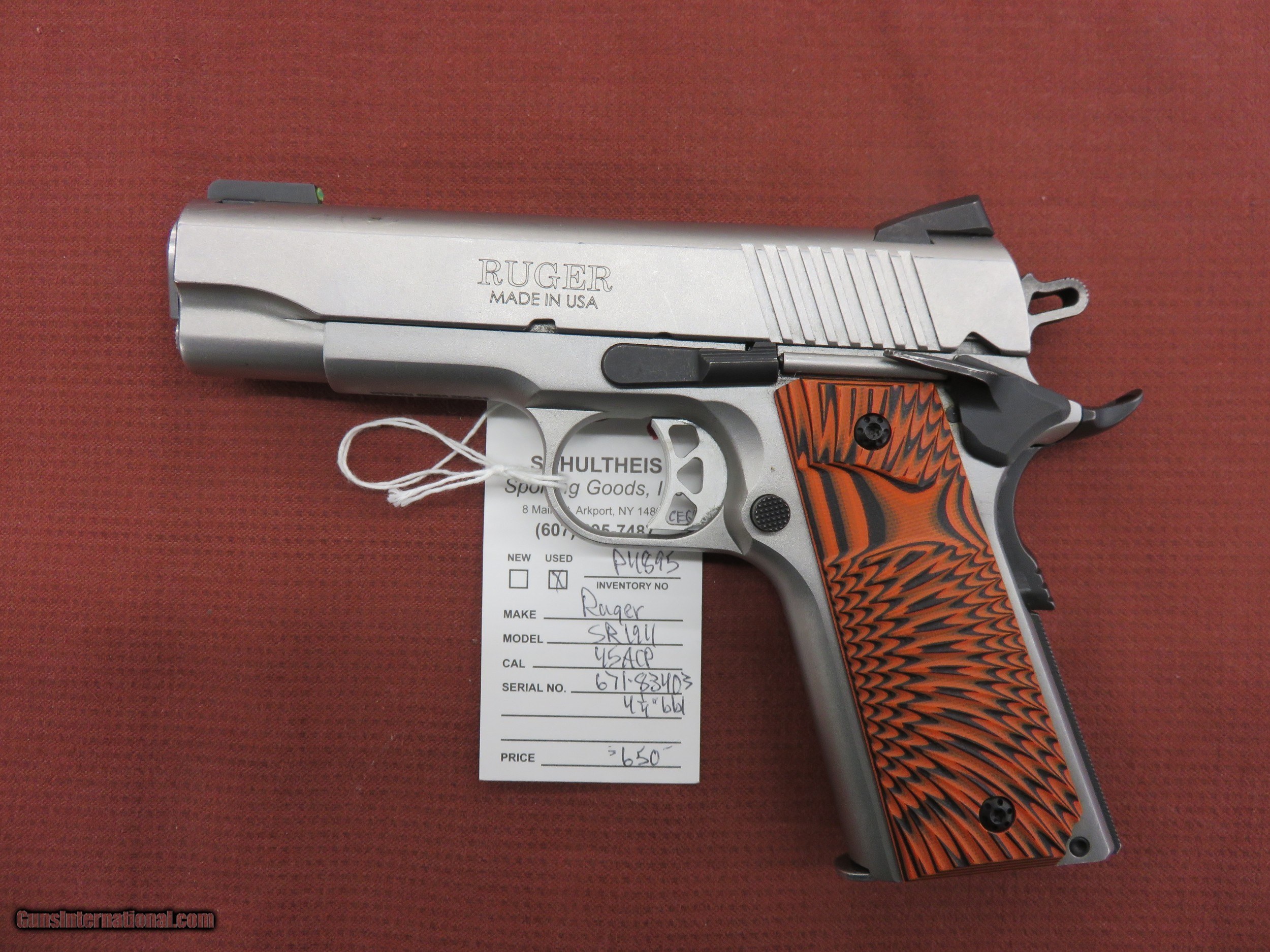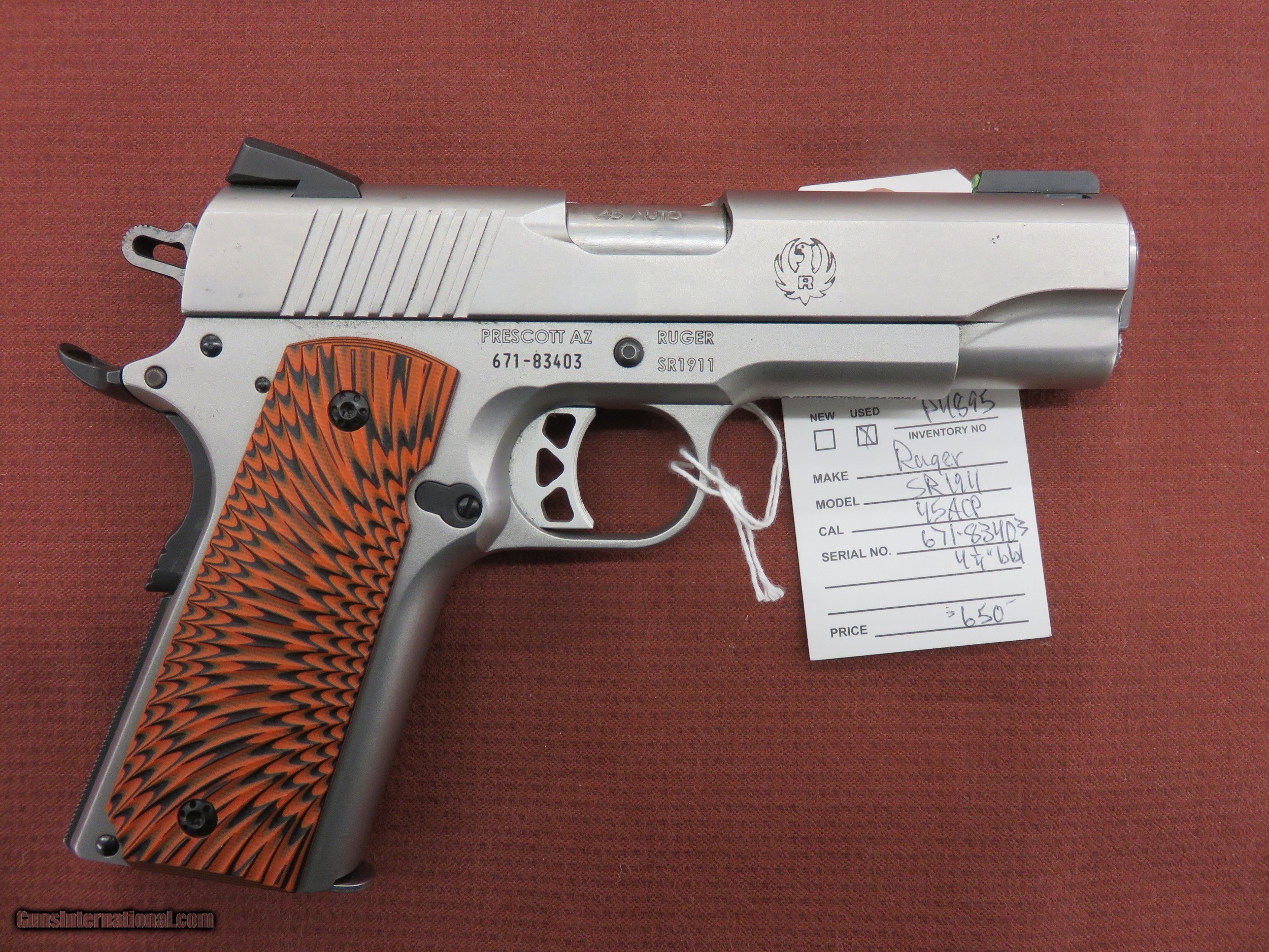 Description: Ruger SR 1911, 45ACP, 4 1/4" barrel, commander style, similar to SR1911 standard except 4 1/4" barrel, stainless steel frame (matte), over-sized beaver-tail grip safety, rear slide serrations adjustable 3 dot sight system, light polish marks on side, overall condition 98% SOLD |