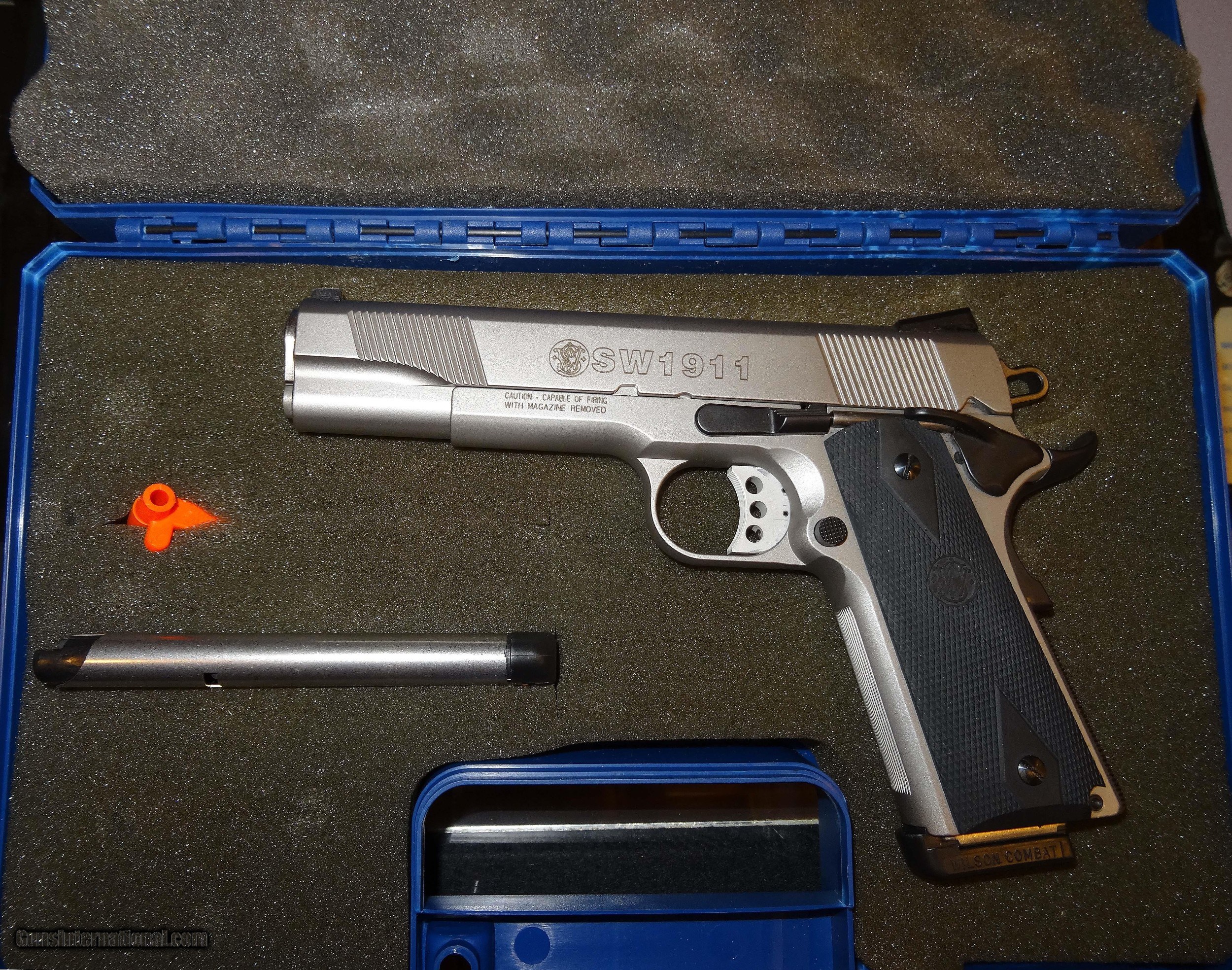 Description: S&W SW 1911 IN .45 ACP CAL., WITH 5" BARREL. COLOR STAINLESS STEEL. CONDITION 98%+ LIKE NEW. SERIAL NUMBER JRD3814. S&W MODEL SW1911, COMES WITH TWO FACTORY MAGAZINES, HARD CASE, 98%+ OVERALL CONDITION, OUR STOCK # D720. SOLD |