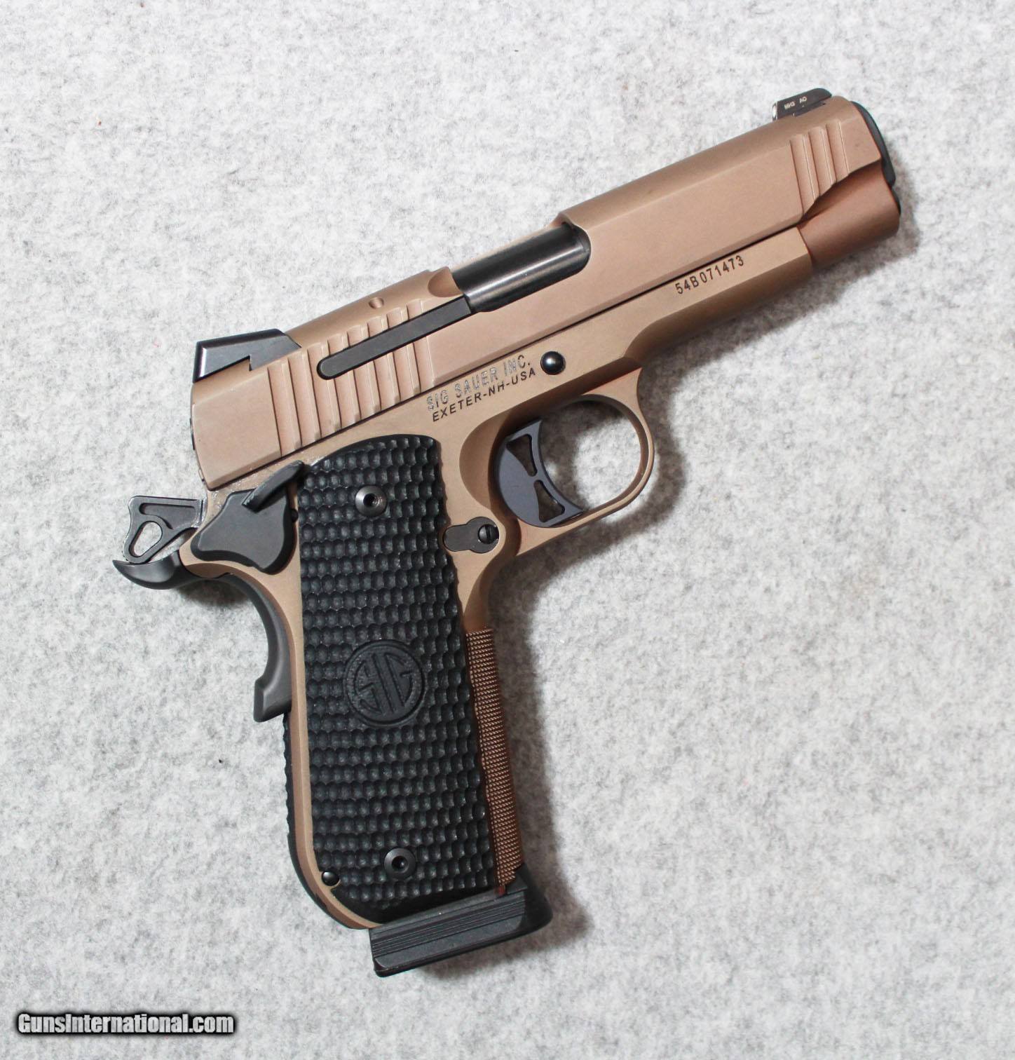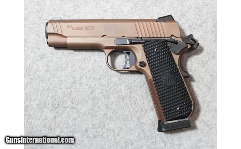 Description: Sig Sauer 1911 single action, semiautomatic pistol chambered in .45 Auto. It has a 4.25" barrel, with front and rear slide serrations. The front sight is a black blade with a dot, and the rear sight is a fixed black u-notch with two dots. The hammer and trigger are skeletonized, and the safety is ambidextrous. Includes two magazines, and manual. Free shipping to any Bass Pro Shops or Cabela's store. .45 Auto Metal Condition: Very Good with Minor Handling Marks Bore Condition: Bright and Clear Barrels: 4.25 inch Triggers: Single Action Weight: 35 oz Sights: Front: Black Blade with a Dot / Rear: Fixed Black U-Notch with Two Dots Item Location: Allen, TX Price: $799.99 Contact Seller |