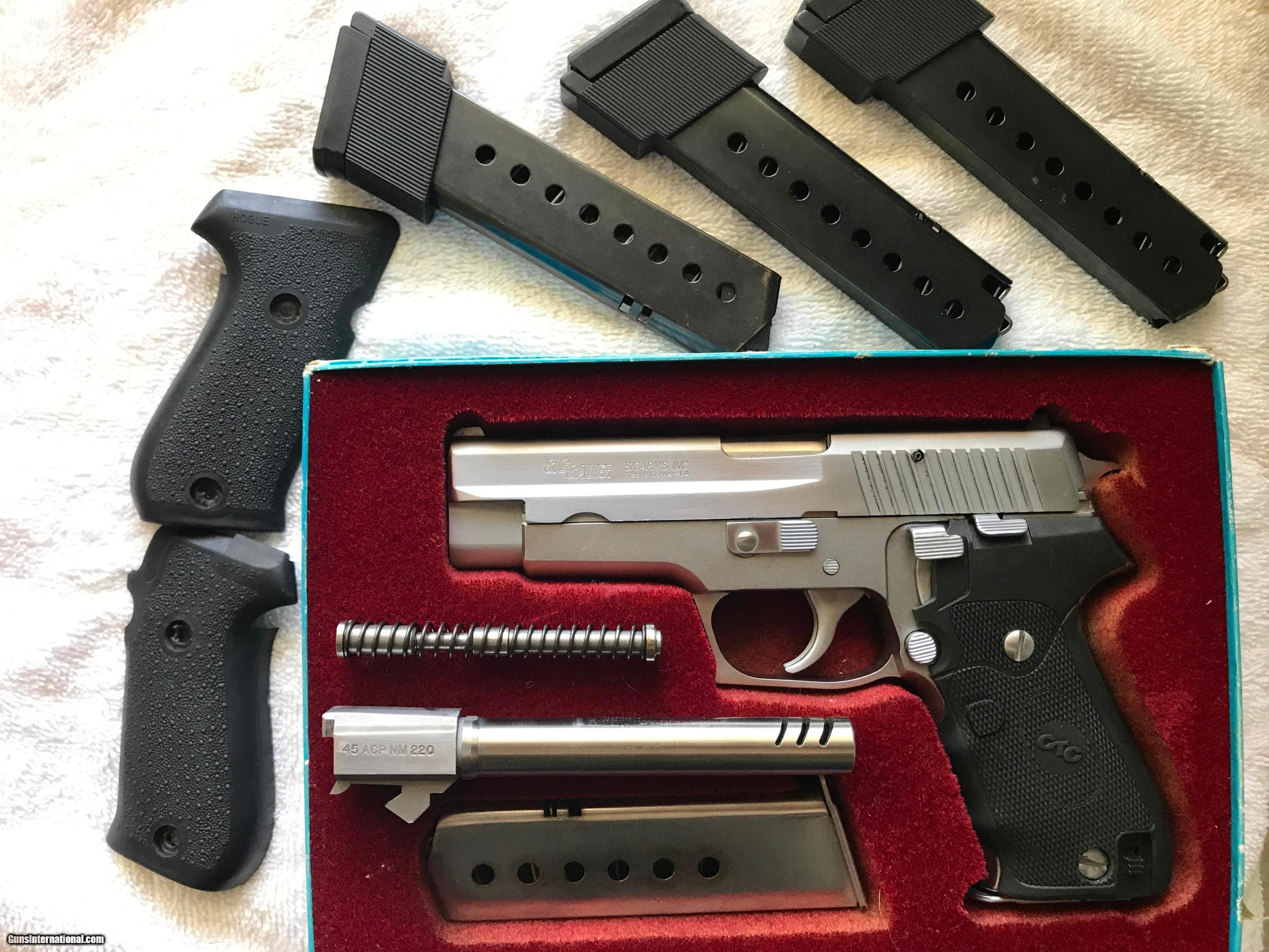 Description: this is a West German sig sauer with two barrel and two different springs set a crimson laser grips and factory grips 4 mags 3 hi capacity and a Beautiful carrying or competition gun super accurate and in perfect condition hart to pass by with the original box SOLD Manufacturer: Sig Sauer Model: p220 Caliber Info: 45 Acp Condition: 90% Metal Condition: 90% Barrels: 2 Barrel Type: Porte |