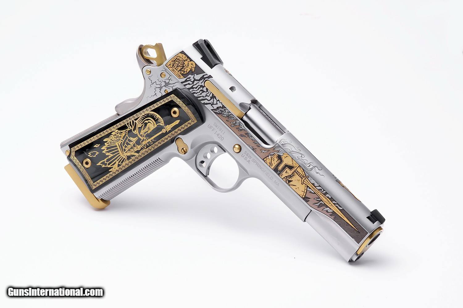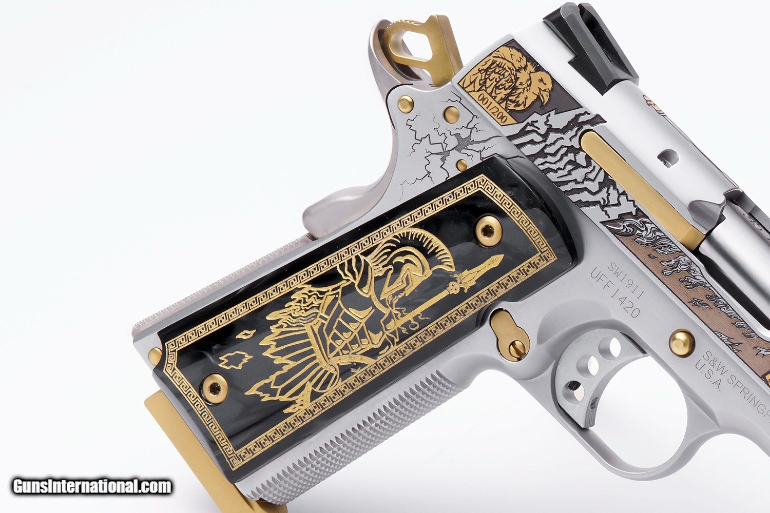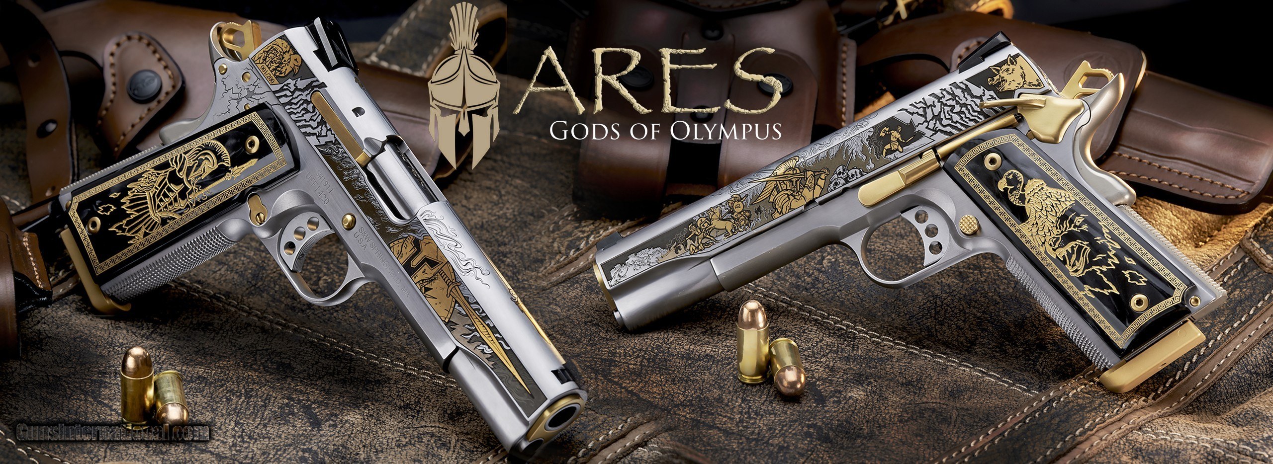 Description: NOW SHIPPING SK CUSTOMS GODS OF OLYMPUS - ARES IS FOR #035 of 200 READY TO SHIP KNOW YOUR STATE LAWS - WE WILL SHIP IF YOUR DEALER WILL RECEIVE SK CUSTOMS® PRESENTS PART III IN THE GODS OF OLYMPUS ENGRAVERS SERIES WITH - ARES SK Customs presents “Ares,” the third creation in the Gods of Olympus engraver series. As a guaranteed collector’s item, a limited-edition production of only 200 custom model Smith & Wesson Full Size 1911 pistols chambered in 45 ACP were built for SK Customs. Ares, known as the Greek god of war and courage, is one of the prominent and recognized Olympians. Son of Zeus, Ares embodies the physical valor for war and can also personify sheer brutality and bloodlust. An association with Ares endows places, objects, and other deities with a savage, dangerous, or militarized quality. Using our proprietary highly reflective conversion technique SK Customs brings out a fiery tone exposed from the steel and uses 24k gold to highlight the attributes of Ares in scenes of battle and power. The serrations are deeply etched to symbolize faults and cracks in the earth’s crust during battle. Driven by jealousy, Ares changes himself into a raging wild boar and killed Adonis, destroying his love with Aphrodite. The vulture was a bird of ill omen. Because it haunted the battlefield feeding upon the bodies of the dead, it was closely associated with the war-god Ares To exalt some of Ares’ powers SK Customs showcase his shield, spear and Spartan helmet throughout the pistol. The grips are made of Kirinite® and have been engraved with the Greek Key border, featuring Ares in battle armor, and the Vulture and Dog which symbolize loyalty and protection. Each collector of Ares will receive a special issued commemorative silver coin that features the marks of the Bank of Greece in Athens, the year of production and a profile of the Goddess Athena on one side and a depiction of Ares charging into battle on the opposite side. Each coin comes in a protective case which is set inside an elegant black velvet coin box labeled in silver with the “God of Olympus- Ares” logo art. Visit SKGUNS for more information Credit Cards 3.5% ACH 0% Paper Payments Must Be Sent 4 Days Post Purchase We Will Only Ship to FFLs We are Nighthawk Custom, Korth, Phoenix Trinity, Arsenal Firearms, Cosaint Arms and Guncrafter Industries Stocking Dealers WE ARE SK CUSTOMS! WE ARE SK GUNS! SOLD Handgun Caliber: .45 ACP (.45 Auto) Manufacturer: Smith and Wesson Model: 1911 E-Series Serial Number: 035 Condition: Factory New |