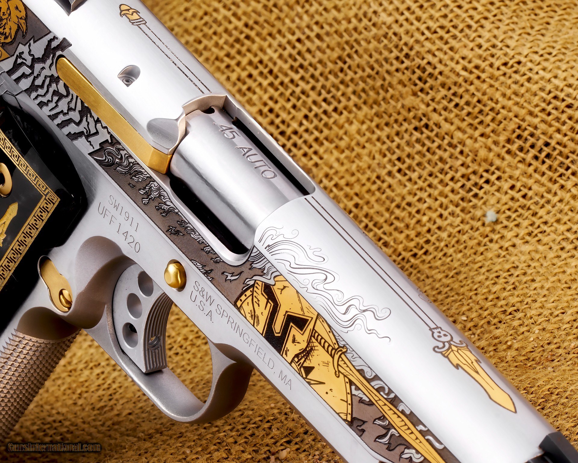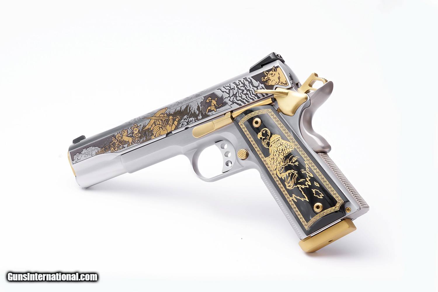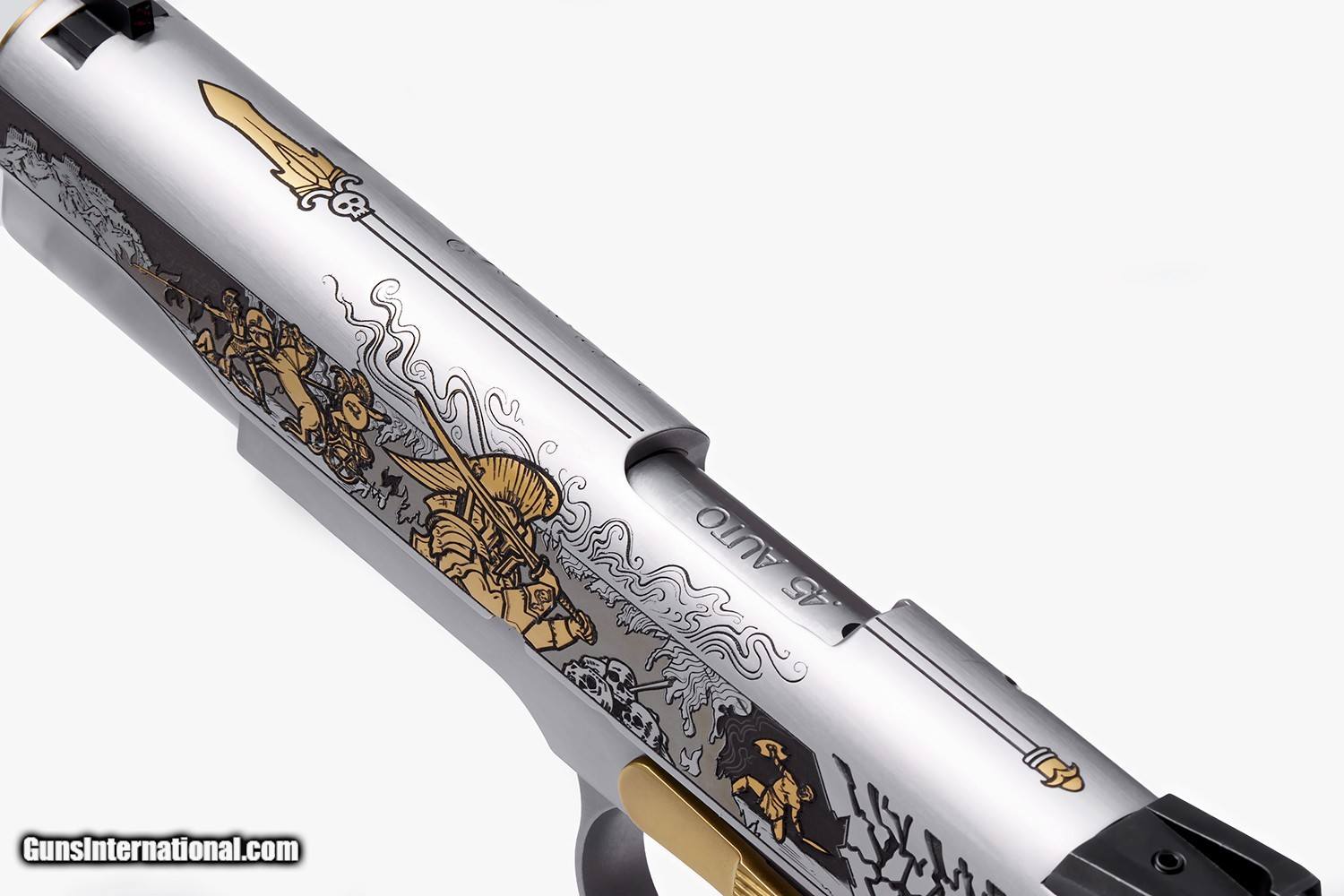 Description: NOW SHIPPING SK CUSTOMS GODS OF OLYMPUS - ARES IS FOR #035 of 200 READY TO SHIP KNOW YOUR STATE LAWS - WE WILL SHIP IF YOUR DEALER WILL RECEIVE SK CUSTOMS® PRESENTS PART III IN THE GODS OF OLYMPUS ENGRAVERS SERIES WITH - ARES SK Customs presents “Ares,” the third creation in the Gods of Olympus engraver series. As a guaranteed collector’s item, a limited-edition production of only 200 custom model Smith & Wesson Full Size 1911 pistols chambered in 45 ACP were built for SK Customs. Ares, known as the Greek god of war and courage, is one of the prominent and recognized Olympians. Son of Zeus, Ares embodies the physical valor for war and can also personify sheer brutality and bloodlust. An association with Ares endows places, objects, and other deities with a savage, dangerous, or militarized quality. Using our proprietary highly reflective conversion technique SK Customs brings out a fiery tone exposed from the steel and uses 24k gold to highlight the attributes of Ares in scenes of battle and power. The serrations are deeply etched to symbolize faults and cracks in the earth’s crust during battle. Driven by jealousy, Ares changes himself into a raging wild boar and killed Adonis, destroying his love with Aphrodite. The vulture was a bird of ill omen. Because it haunted the battlefield feeding upon the bodies of the dead, it was closely associated with the war-god Ares To exalt some of Ares’ powers SK Customs showcase his shield, spear and Spartan helmet throughout the pistol. The grips are made of Kirinite® and have been engraved with the Greek Key border, featuring Ares in battle armor, and the Vulture and Dog which symbolize loyalty and protection. Each collector of Ares will receive a special issued commemorative silver coin that features the marks of the Bank of Greece in Athens, the year of production and a profile of the Goddess Athena on one side and a depiction of Ares charging into battle on the opposite side. Each coin comes in a protective case which is set inside an elegant black velvet coin box labeled in silver with the “God of Olympus- Ares” logo art. Visit SKGUNS for more information Credit Cards 3.5% ACH 0% Paper Payments Must Be Sent 4 Days Post Purchase We Will Only Ship to FFLs We are Nighthawk Custom, Korth, Phoenix Trinity, Arsenal Firearms, Cosaint Arms and Guncrafter Industries Stocking Dealers WE ARE SK CUSTOMS! WE ARE SK GUNS! SOLD Handgun Caliber: .45 ACP (.45 Auto) Manufacturer: Smith and Wesson Model: 1911 E-Series Serial Number: 035 Condition: Factory New |