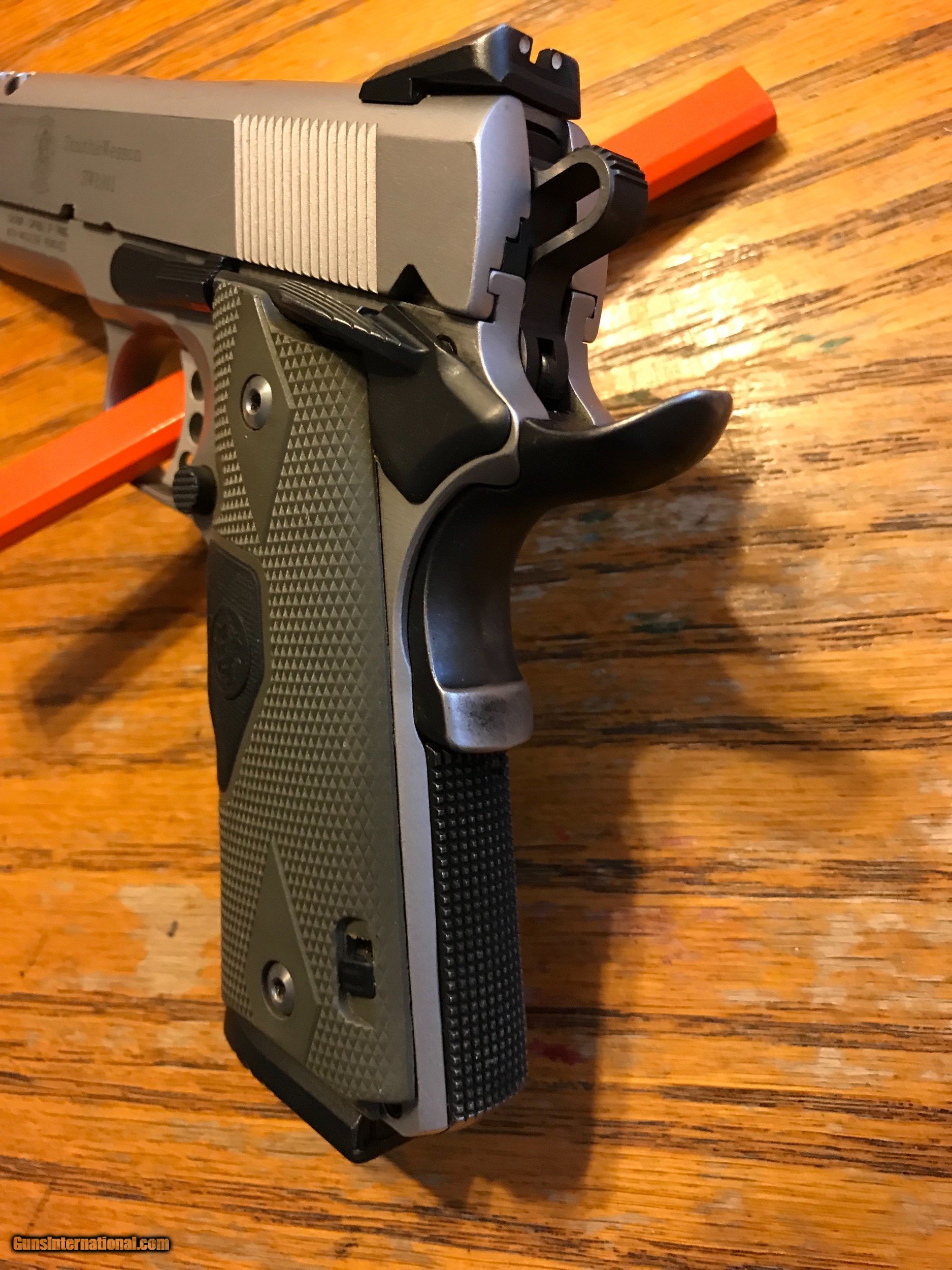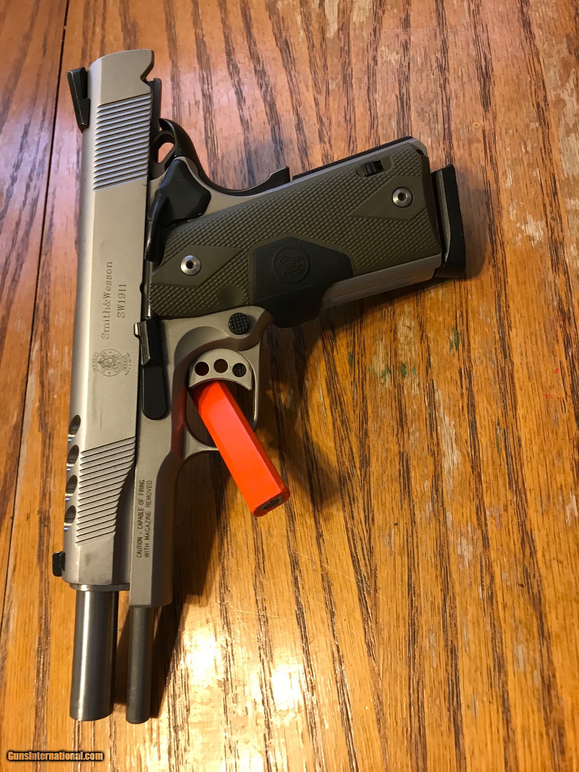 Description: SW 1911 5” 45acp. I believe this is the predecessor to the Performance Center 1911. It has most of the same features as the Performance center 1911, in some ways prefferable. I sold many Smith and Wesson 1911 pistols with similar semi custom features when I worked at Cabelas prior to the Performance Center 1911. Stainless steel 8 round full-sized frame with rounded butt, (thankfully not as radically cut off as the the current ‘Performance Center’ 1911). Polished feed ramp, 20 lines per inch checkered mainspring housing, flared magazine well, hand fitted clean and crisp trigger with overtravel adjustment and the Smith and Wesson Crimson Trace laser grips. Stainless steel slide with throated barrel, precision crowned muzzle, polished feed ramp, hand fitted barrel bushing (not the ‘shortcut’ Briley spherical barrel bushing used on the current Performance Center 1911), 8 slide lightening cuts (appears to be same cuts as the 6 found on current PC 1911), Front and rear cocking serrations, external extractor, dovetailed front sight, full length guide rod and lowered and flared ejection port. Excellent condition. PC 1911’s are in the $1300 - $1500 range.. I will let this one go for $1100. REDUCED TO $1000 AzCWP preferred. Low balls ignored SOLD Manufacturer: Smith and Wesson Model: 1911 Caliber Info: .45 acp Ejectors: External Condition: Excellent Barrels: 5” Barrel Type: Throated Action: SingleSingle Triggers: Fitted Stock: Laser grip Stock Dimensions: 8 round Stock Heel: Rounded Finish: Stainless Weight: 39 oz Item Location: Arizona |