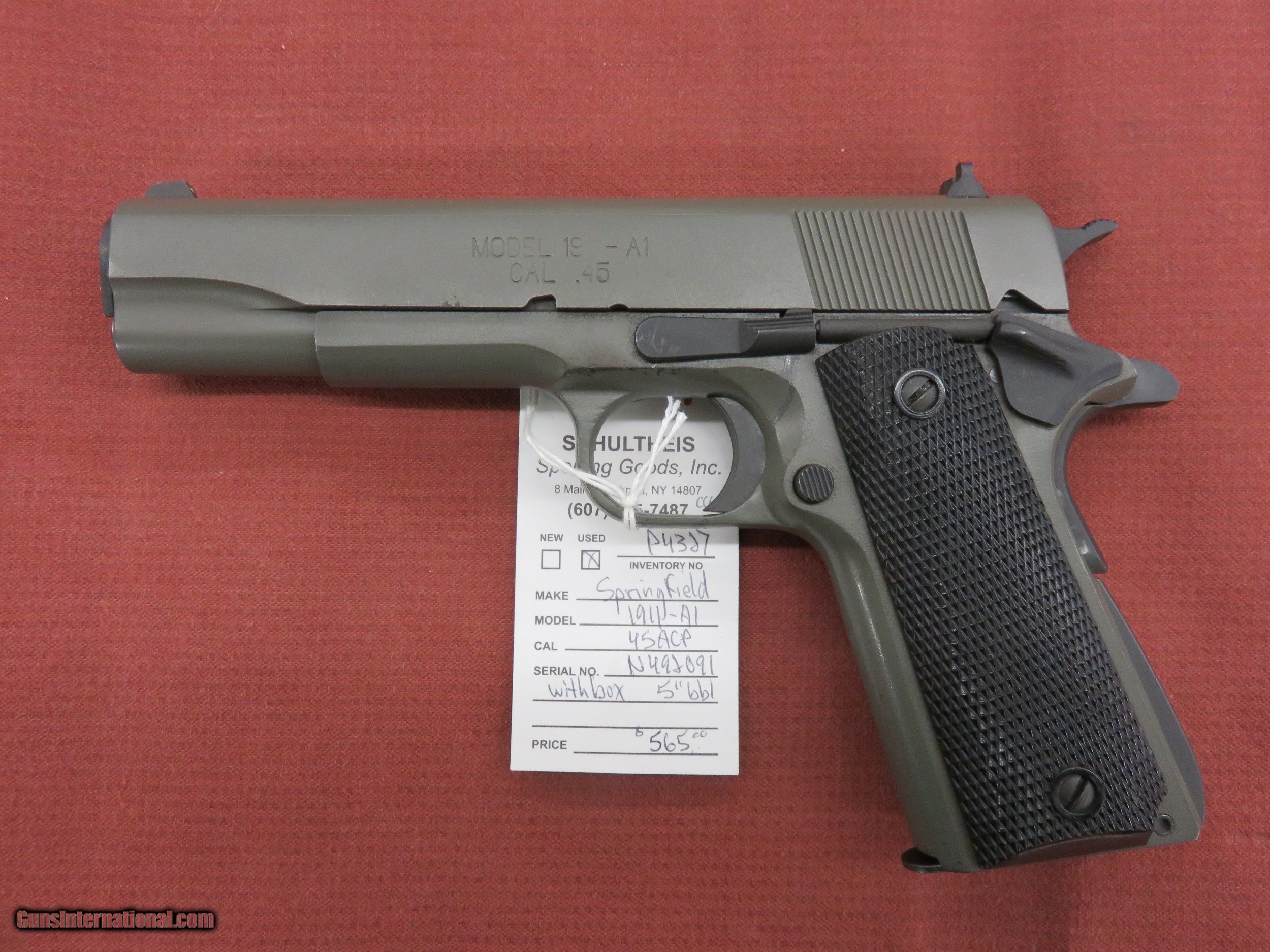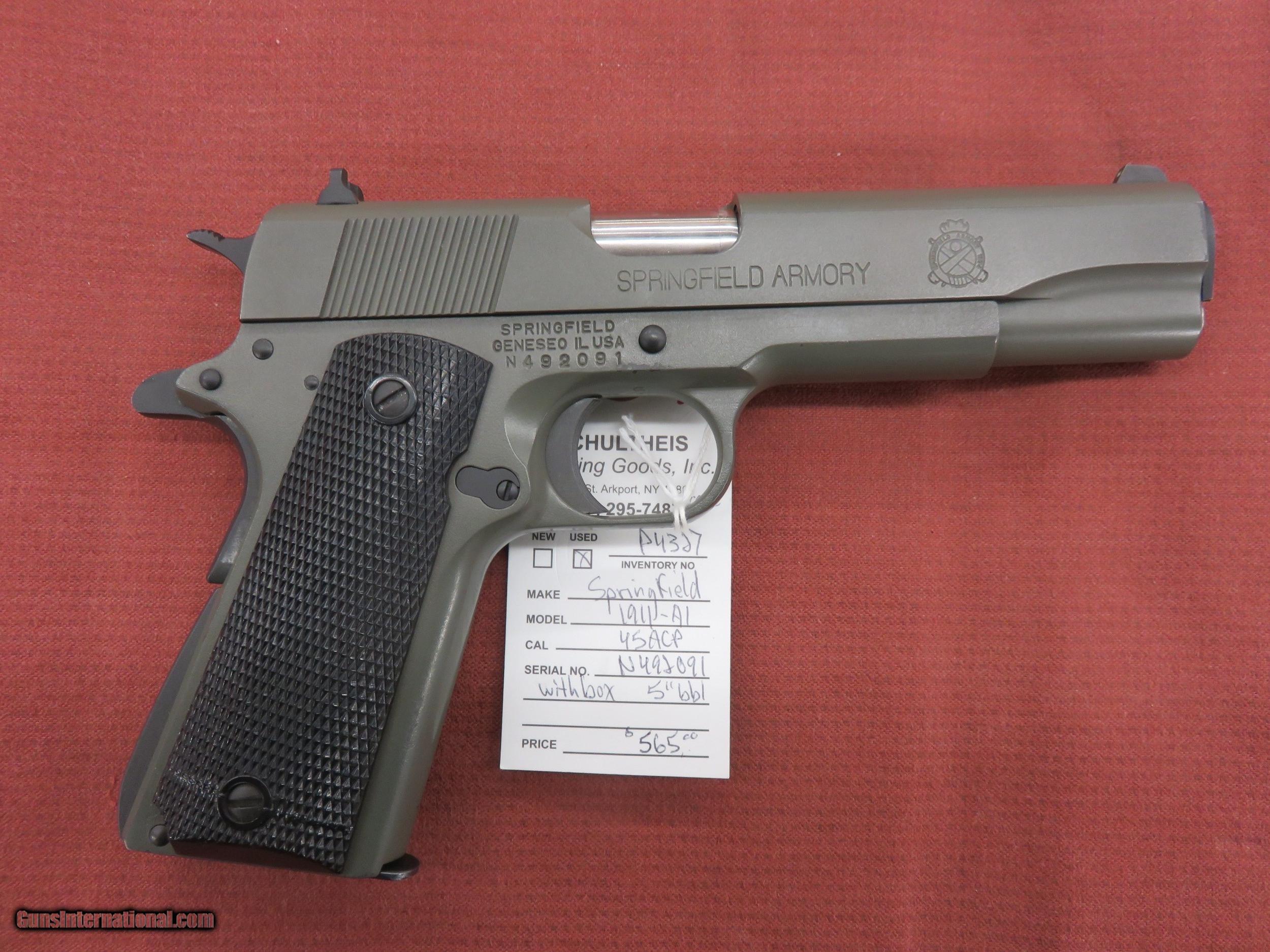 Description: Springfield 1911-A1, 45 ACP, with box, 5" barrel, military green powder coated, overall condition 95%. SOLD |
