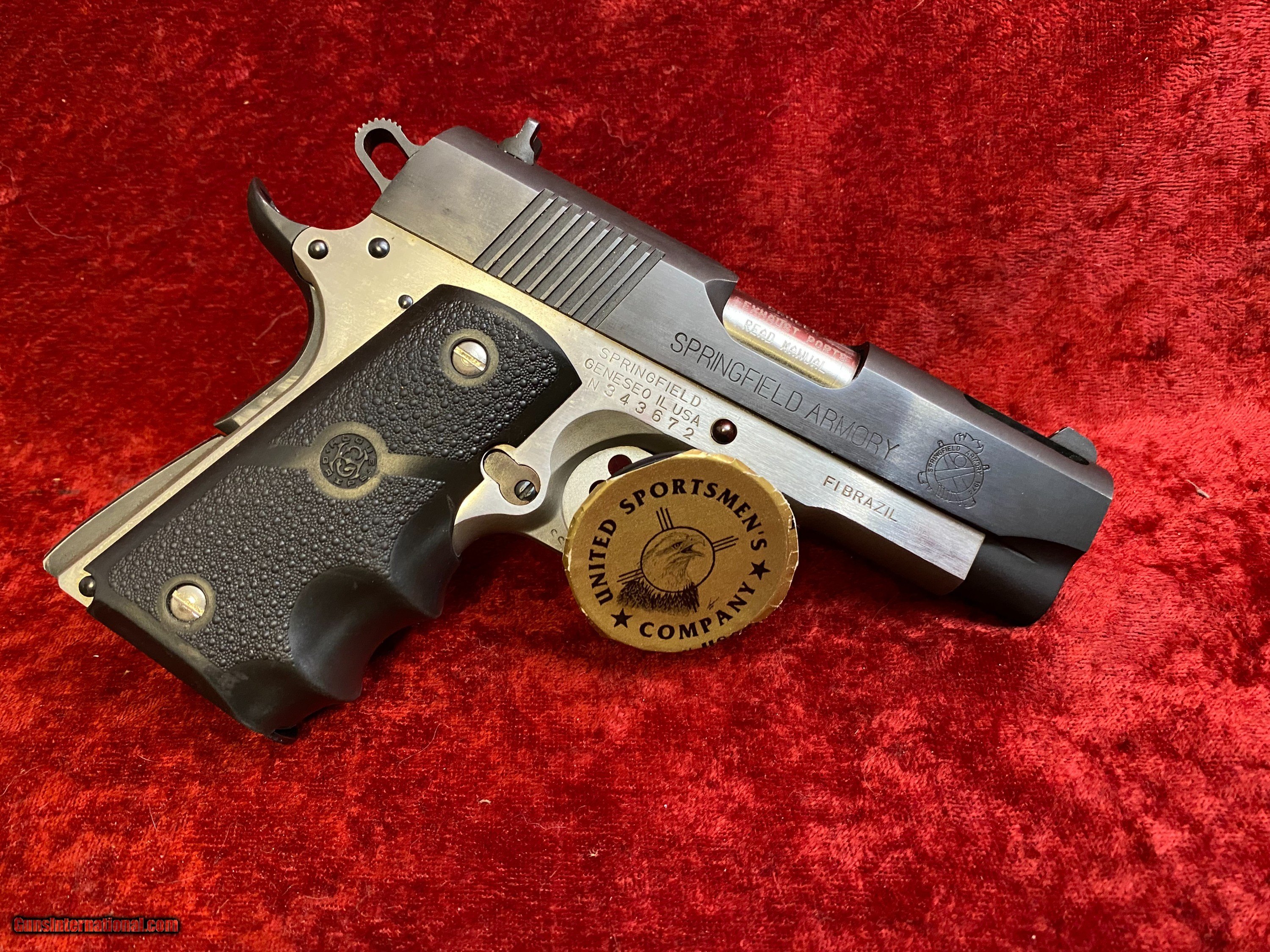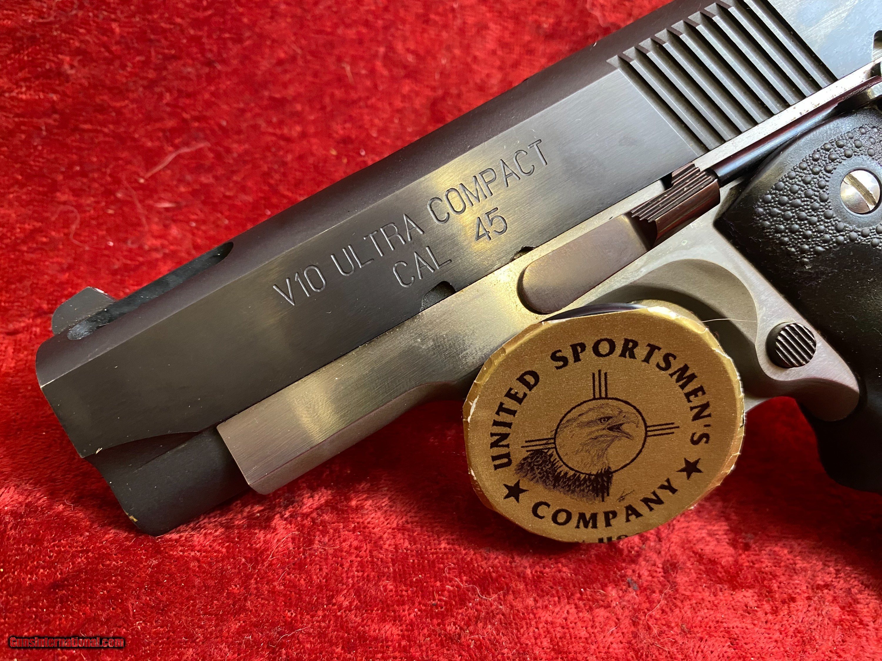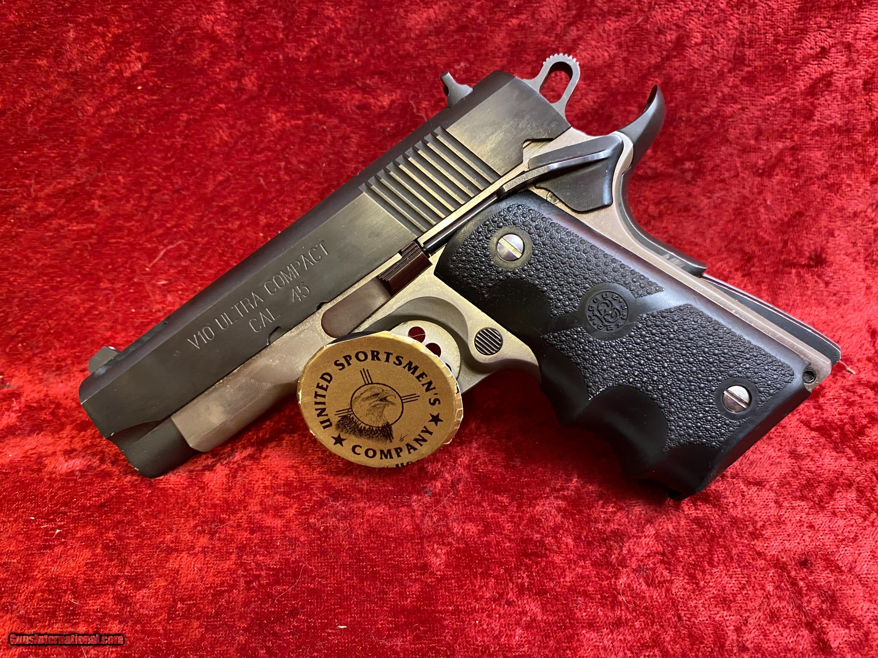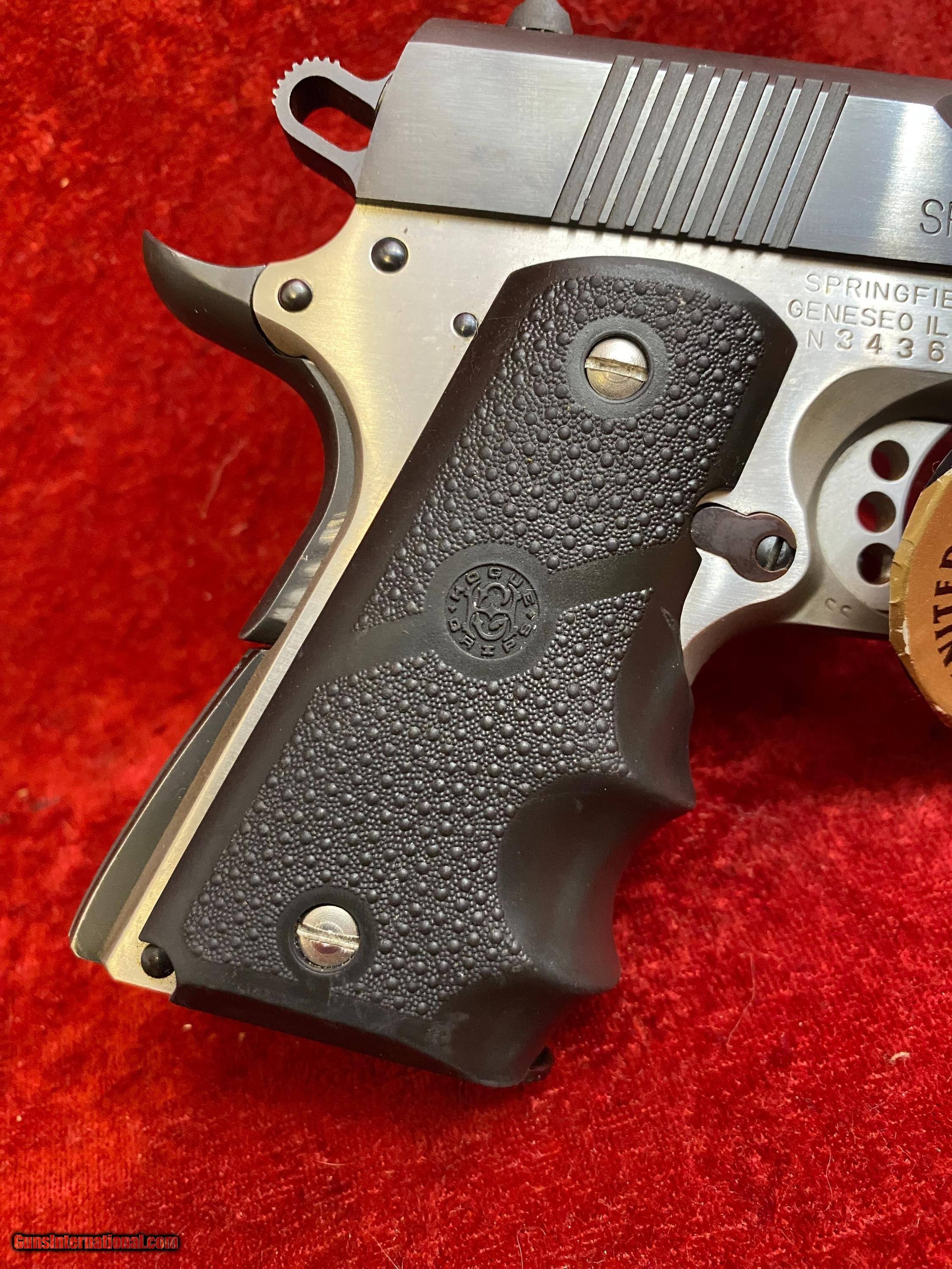 Description: Springfield Armory 1911 V10 Ultra Carry Compact .45 ACP pistol Great conceal carry pistol w/Hogue finger groove grips!! This is a used Springfield Armory 1911 V10 Ultra Compact pistol chambered in 45 ACP. It features a 3.5-inch ported barrel, 7-round magazine, 3-dot sights, thumb safety, grip safety, Hogue rubber grips, and stainless frame. Overall, this Springfield is in good condition with normal cosmetic wear on the barrel, slide, and frame. This would be a good choice for concealed carry.
