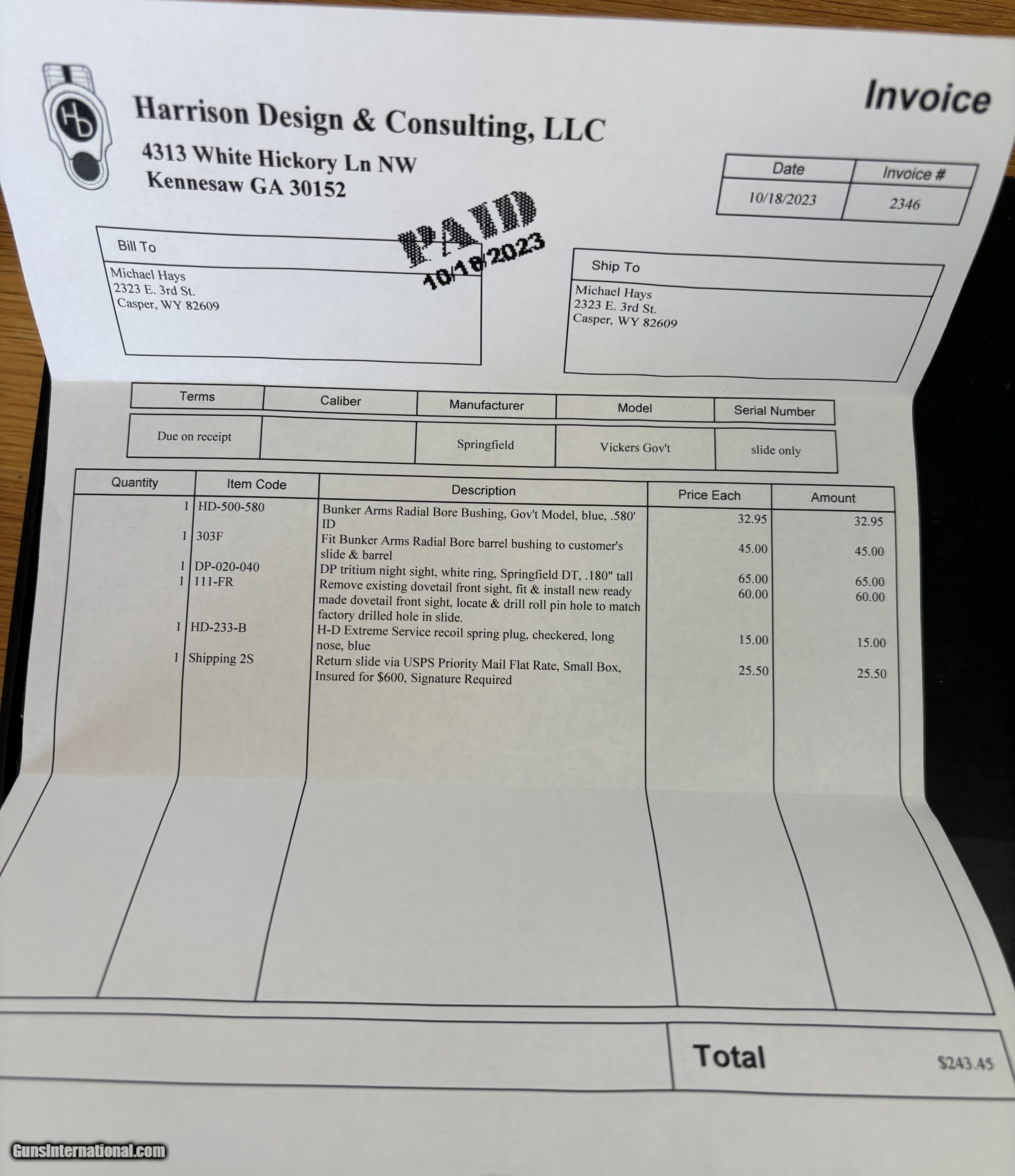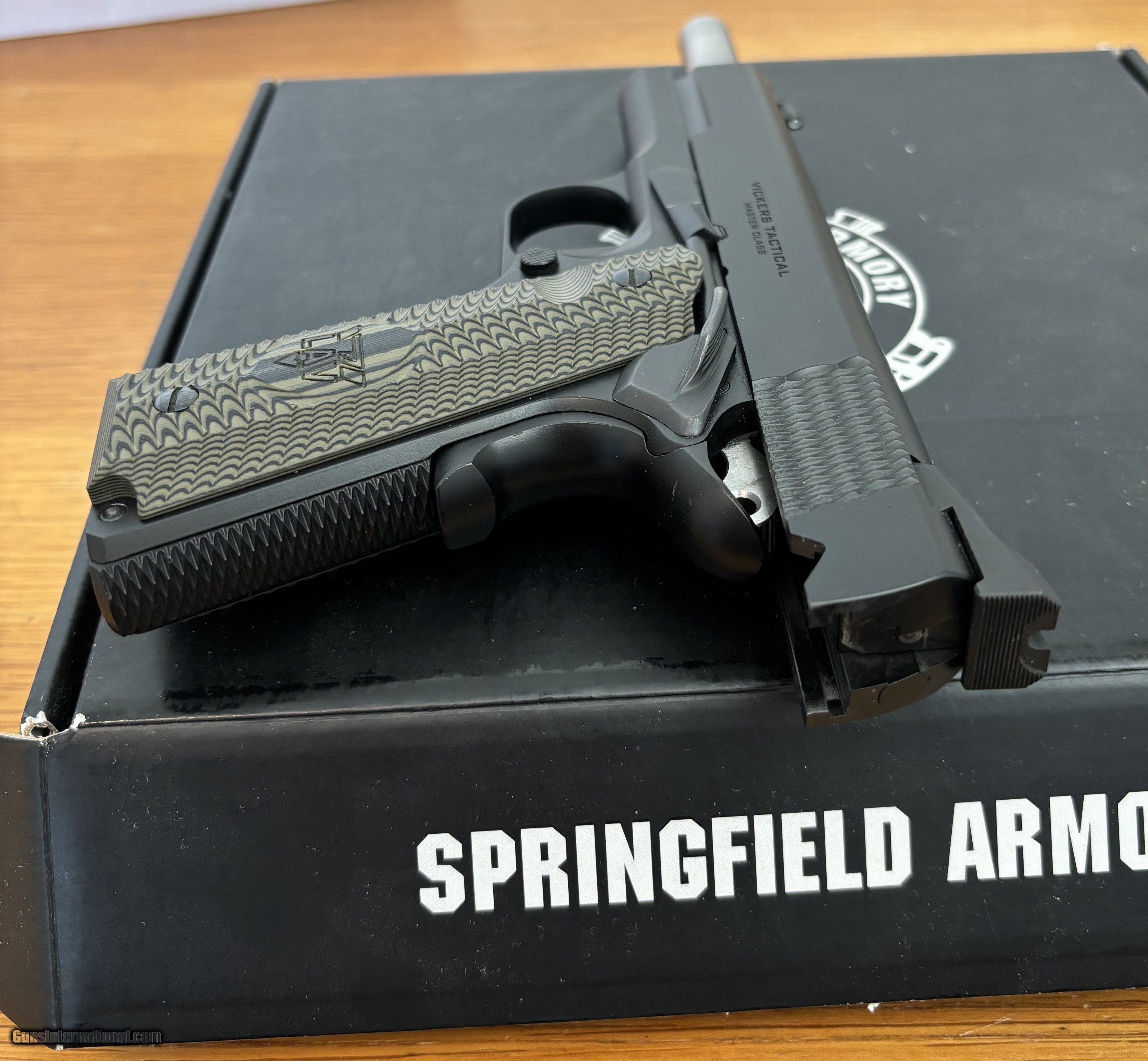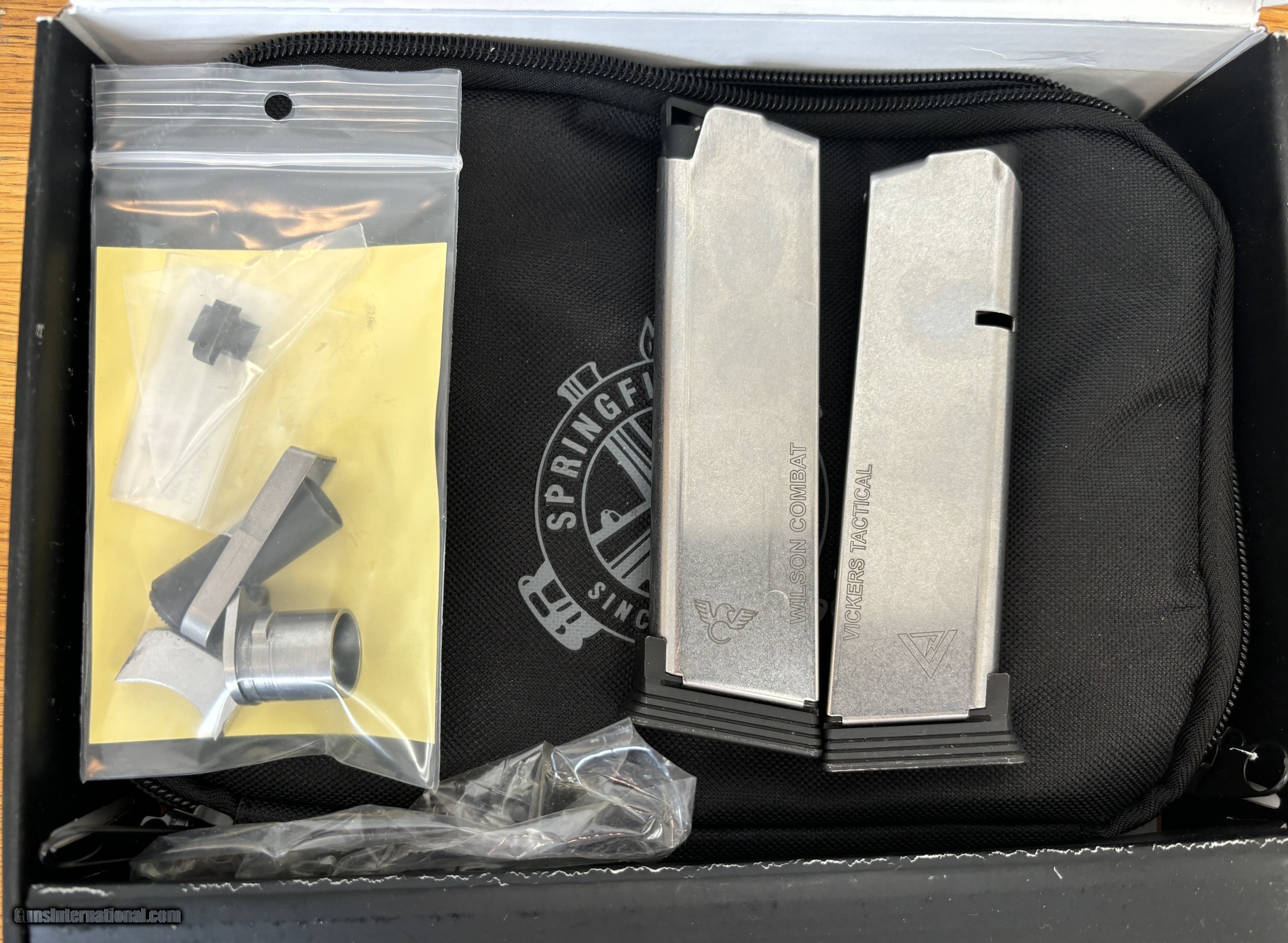 Description: Here's a super cool Larry Vickers Master Class 1911 it took months to finally get. It has under 400 rounds through it. I sent it to Harrison Customs for a new sight I could see better and a Bunker Arms Radial bore bushing that Mr. Harrison installed (see invoice). I installed the Harrison flat trigger myself. Gun runs great and is accurate. The machining is pristine and is what sets it apart from most production guns. It has the box, lock, bag and Wilson Combat mags. There are handling marks on magwell and maybe a bit of wear on sharp edge of the slide. Selling to fund a Wilson Combat next. $30 flat shipping to your FFL and add 3% for credit card. ***price reduced 8 4 24**** SOLD Handgun Caliber: .45 ACP (.45 Auto) Manufacturer: Springfield Model: Larry Vickers Condition: good Metal Condition: good Bore Condition: good Action: single |